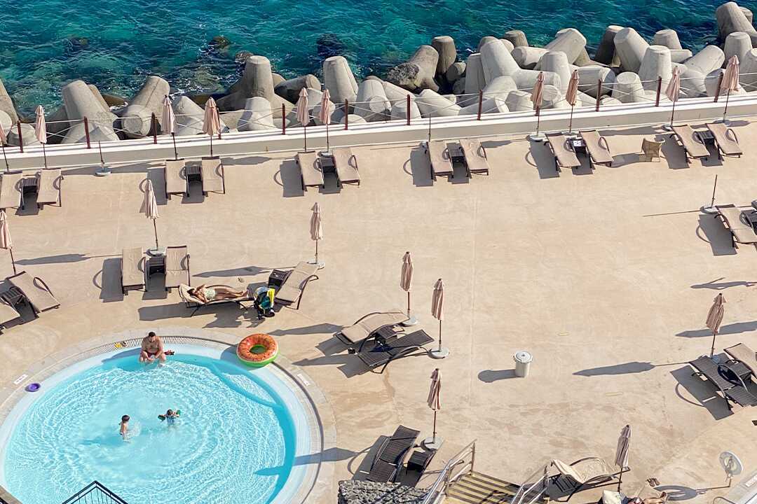 Cliff Bay har et dejligt poolområde nede ved havet. Poolområdet har to opvarmede pools, en saltvandspool og en separat børnepool. Der er også en kombineret udendørs og indendørs pool, der er opvarmet til ca. 25 grader. Pooltemperaturen kan dog falde et par grader om morgenen, aftenen og i dårligt vejr. Nedenfor hotellet er der en badebro, hvor man kan svømme i Atlanterhavets bølger. Solstole og parasoller er tilgængelige ved begge pools, også indendørs. Poolhåndklæder kan lånes.