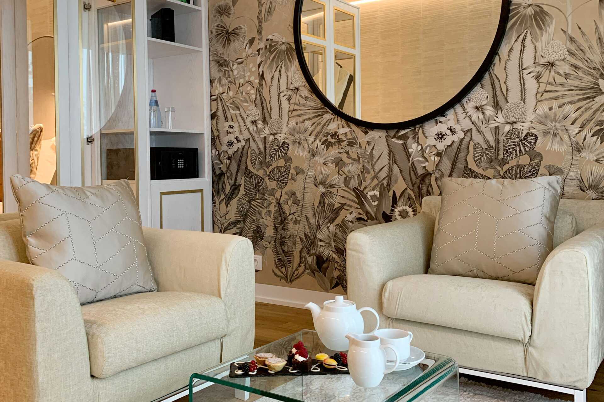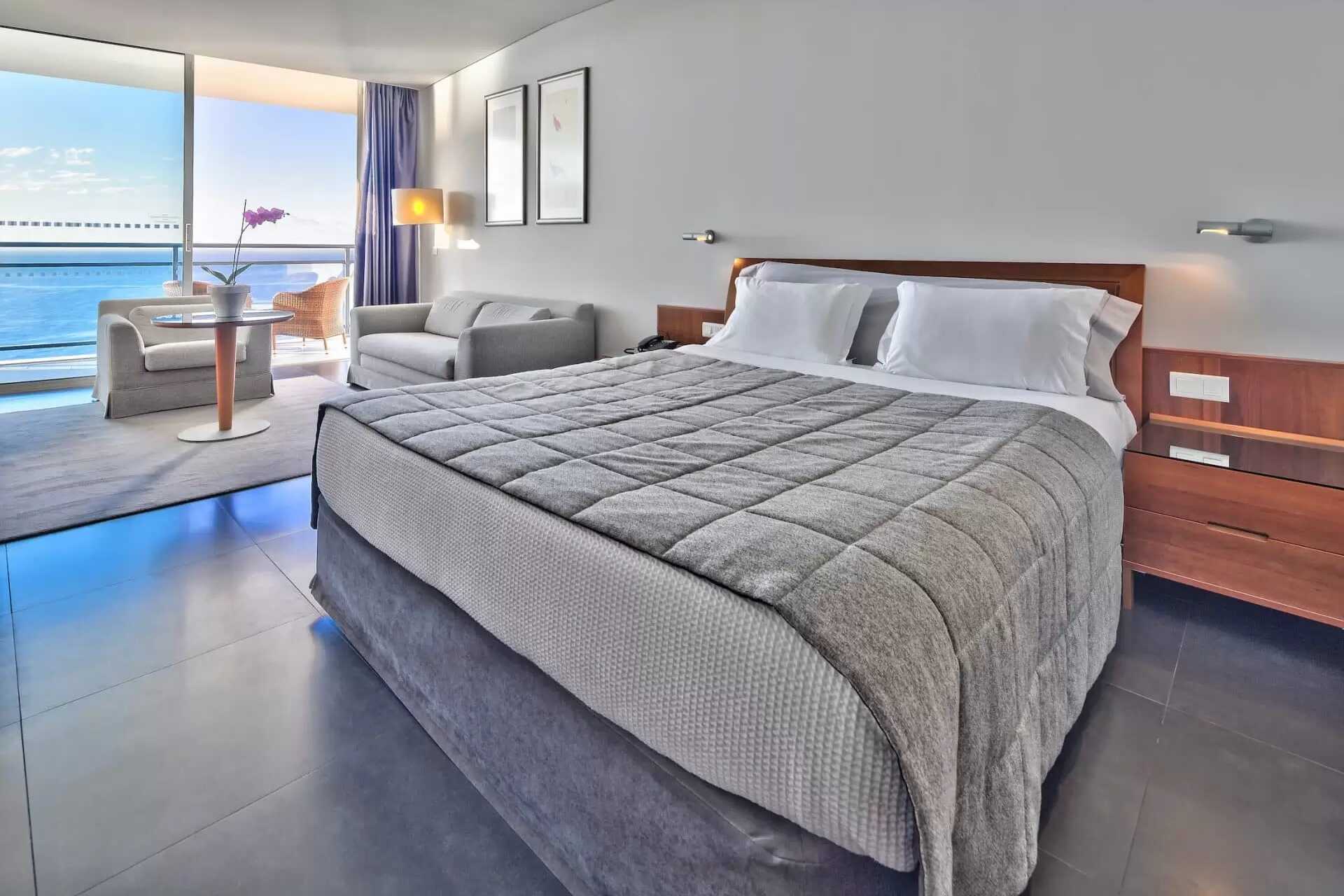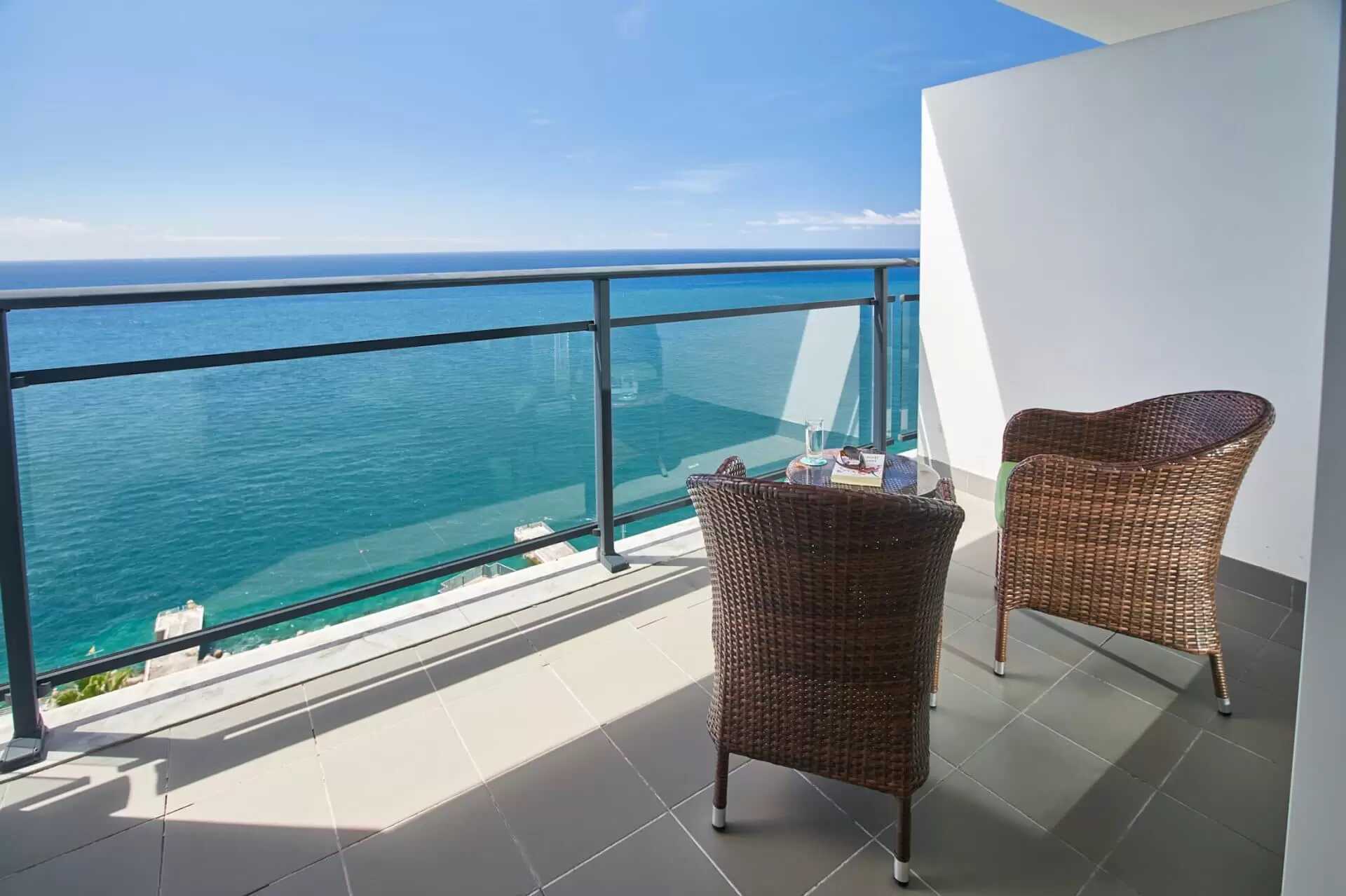 Suite med balkon og havudsigt. Suiten består af et soveværelse med en dobbeltseng og et opholdsrum med siddeområde. Suiterne ligger på 9.-10. etage. Gratis wifi, aircondition og deponering. Køleskab. El-kedel og kaffe/te. Tv med internationale kanaler. Badekåber og tøfler. Hårtørrer. Badeværelse med badekar og toilet. Rengøring 7 gange om ugen. Børn under to år tæller med i det maksimale antal personer på værelset. Rygning er ikke tilladt på balkonen.