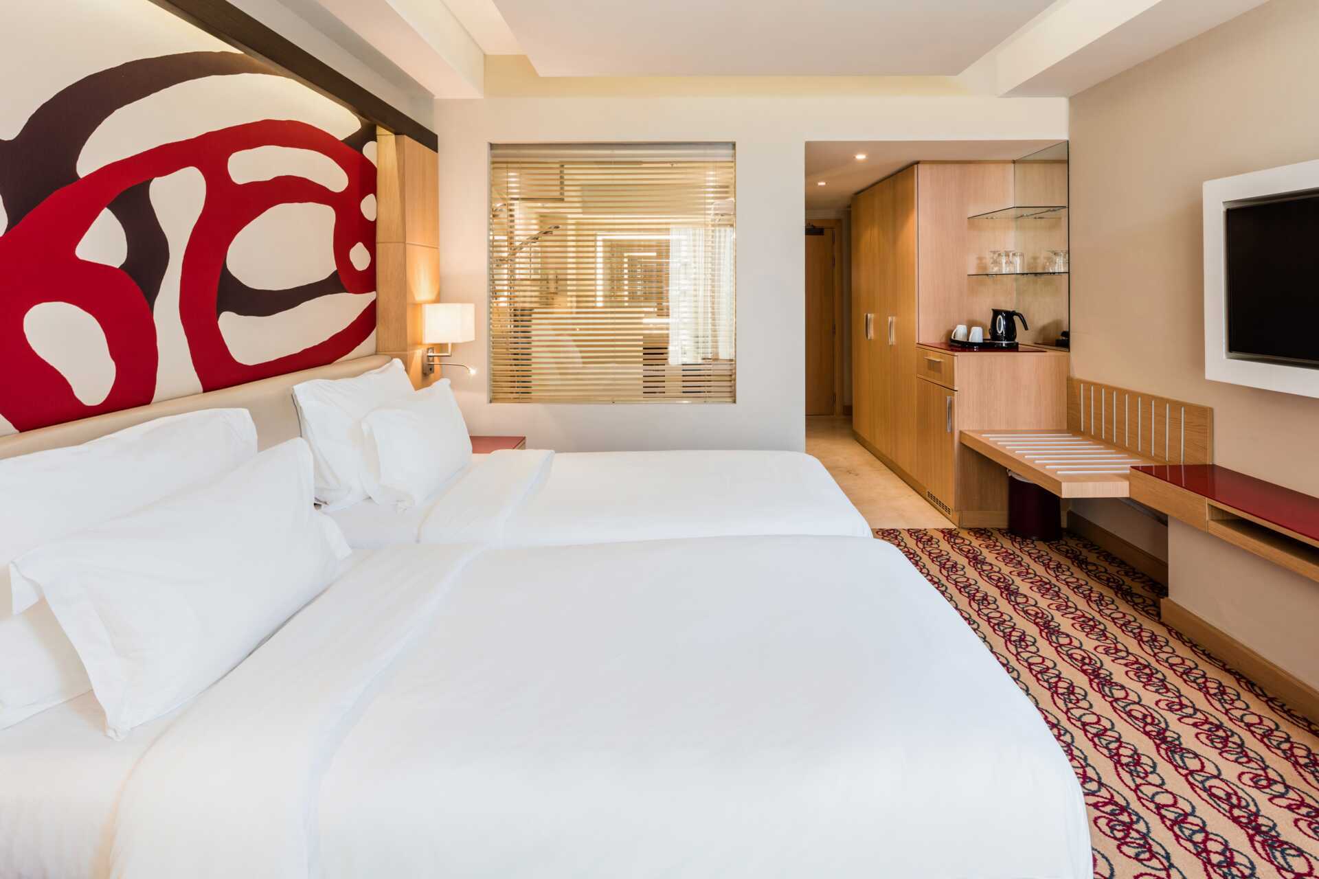 Dobbeltværelser med dobbeltseng eller to enkeltsenge. Pudemenu. Gratis wifi, aircondition og deponering. Væg til væg-tæppe. Køleskab. El-kedel samt kaffe/te. Tv med internationale. Strygefaciliteter. Hårtørrer. Badeværelse med badekar og toilet. Ingen udeplads.