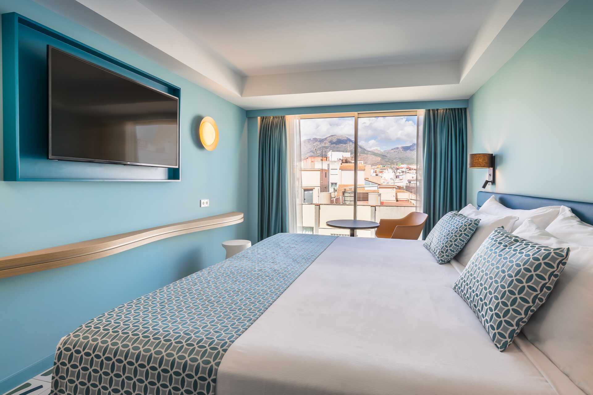 Dobbeltværelse med balkon eller med fransk balkon. En dobbeltseng eller to enkeltsenge. Gratis wifi, aircondition og deponering. Minibar. El-kedel og kaffe/te. Hårtørrer. Badeværelse med bruser og toilet. Rengøring 6 gange om ugen.
