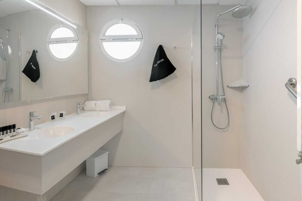 Dobbeltværelser med balkon, nogle med havudsigt. To enkeltsenge. Mulighed for ekstra opredning i sovesofa. Gratis wifi, aircondition og deponering. Køleskab. El-kedel og kaffe/te. Tv med internationale kanaler. Hårtørrer. Badeværelse med badekar eller bruser samt toilet. Rengøring 5 gange.