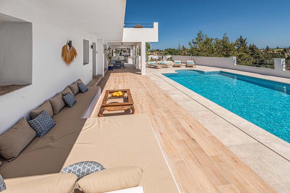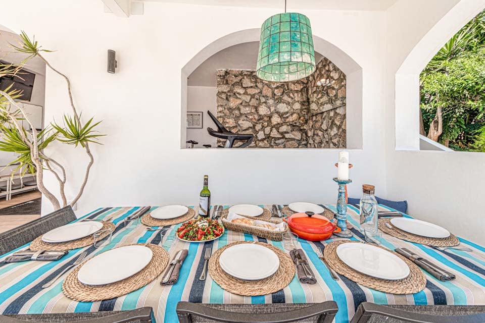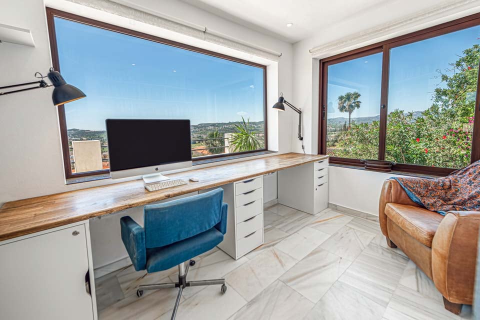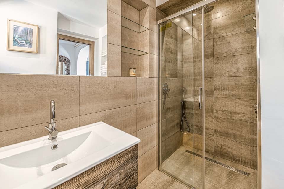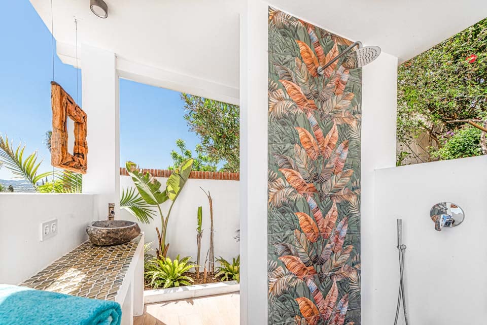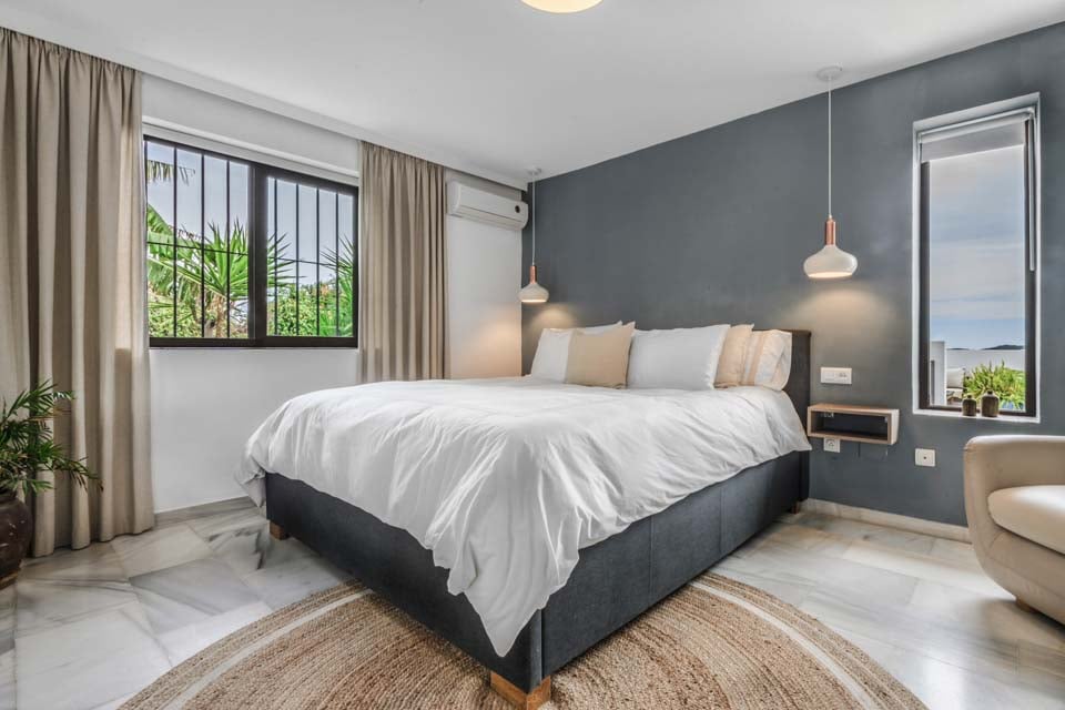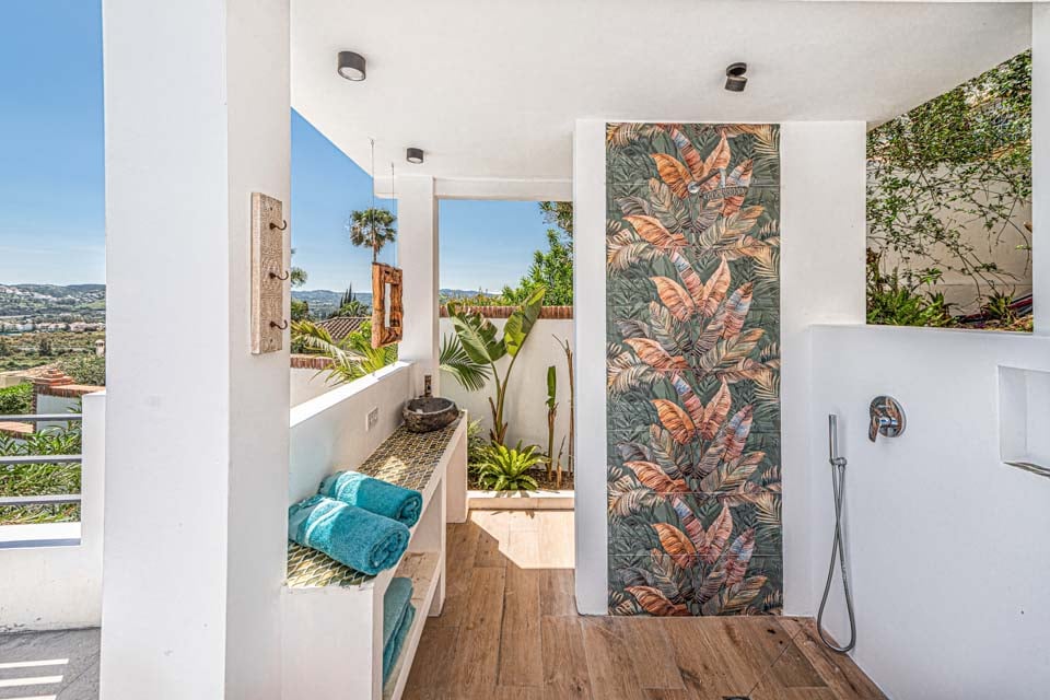 Denne villa har fire soveværelser, hvoraf tre har eget badeværelse. Master-suiten med walk-in closet består af en komfortabel super kingsize-seng og et pænt badeværelse, hvor du kan slappe af i et fritstående badekar og en separat walk-in regnbruser. Den anden suite har en dobbeltseng og et nyt ensuite brusebadeværelse med en smuk privat terrasse omgivet af blomster. Det tredje soveværelse med dobbeltseng ligger i gangen og har et separat fælles badeværelse med regnbruser. Endelig ligger det fjerde soveværelse med dobbeltseng på første sal via en vindeltrappe med udsigt til haven og eget brusebad. Alle soveværelser har aircondition og SONOS-højttalere.