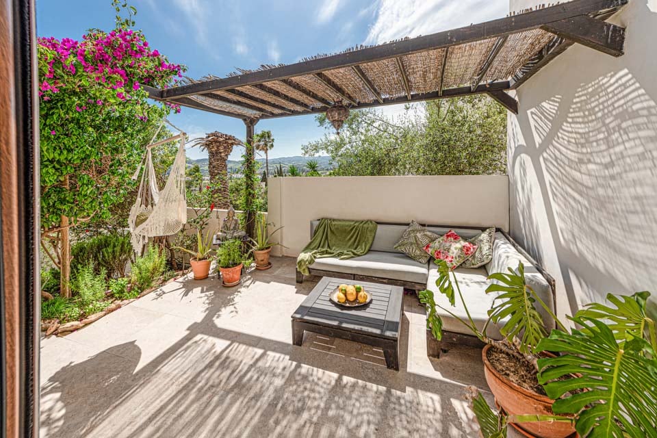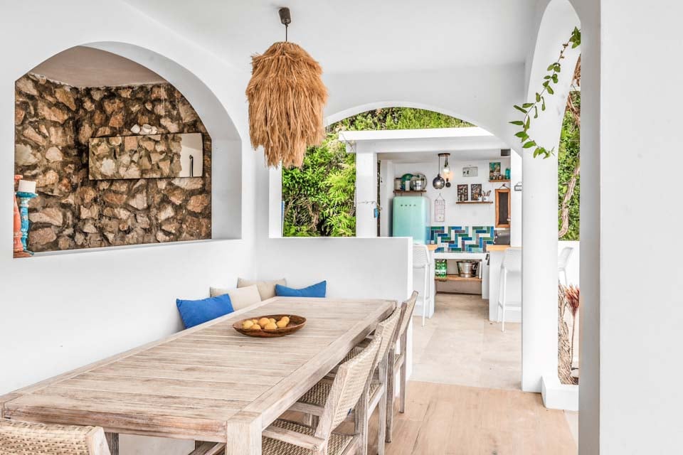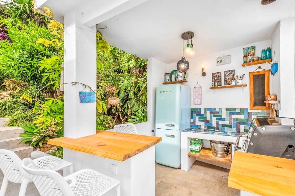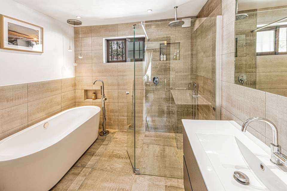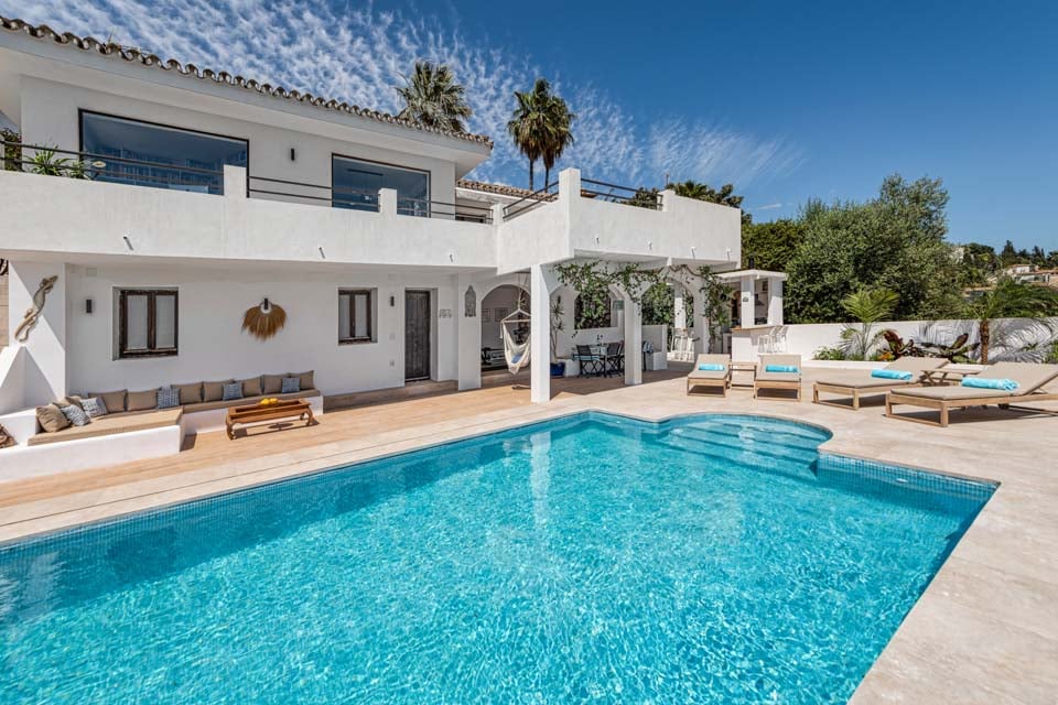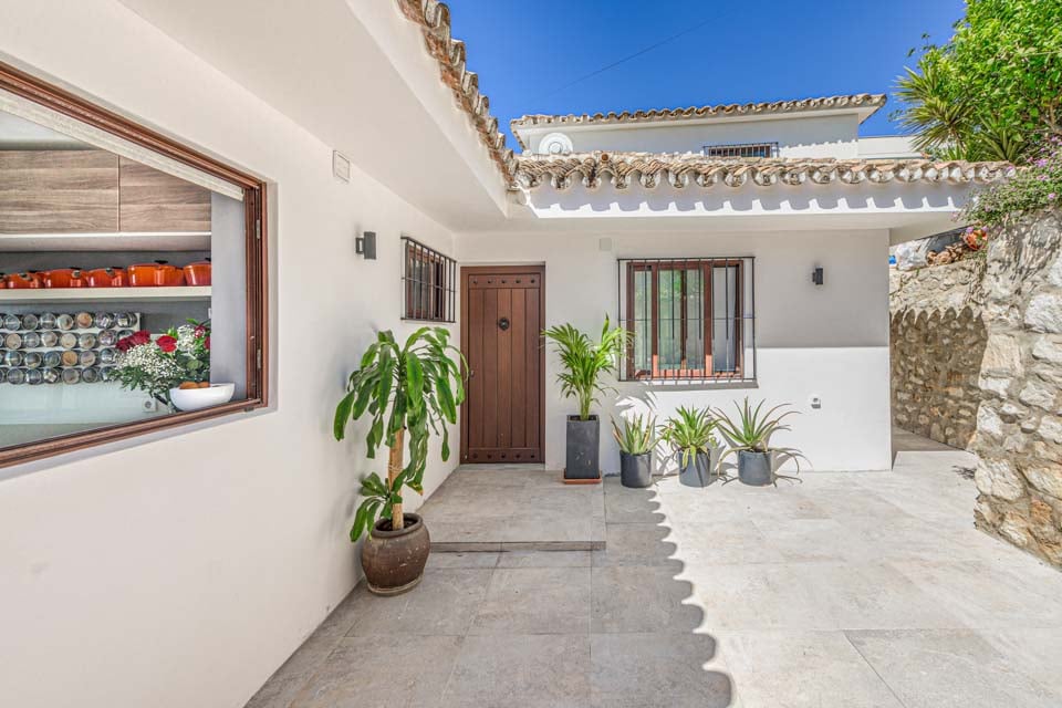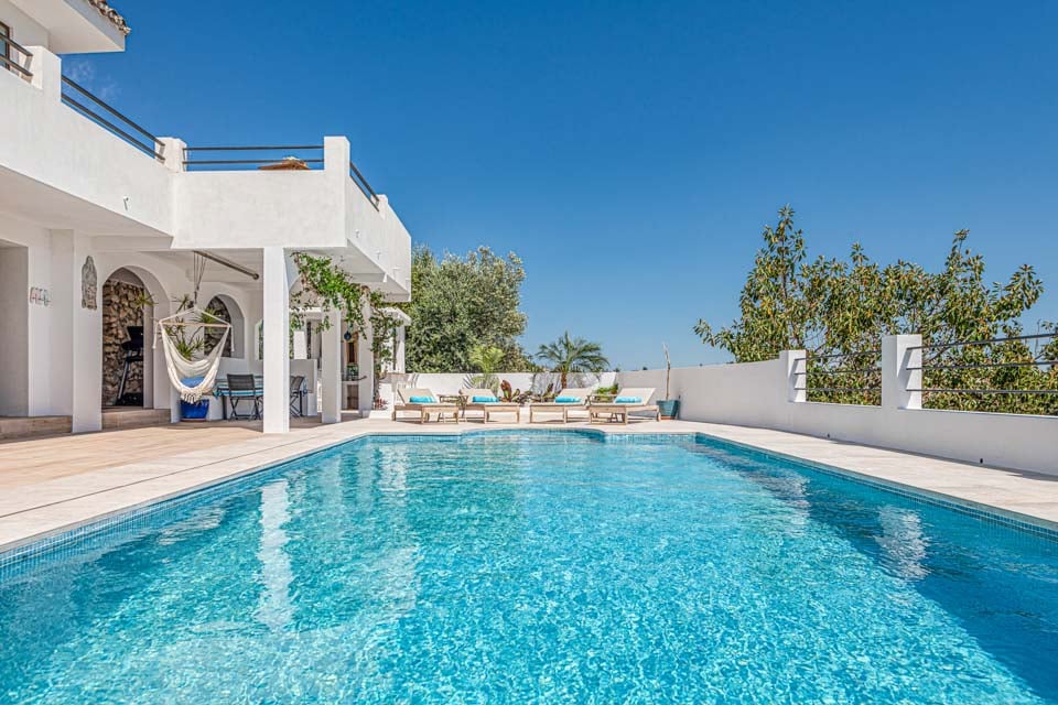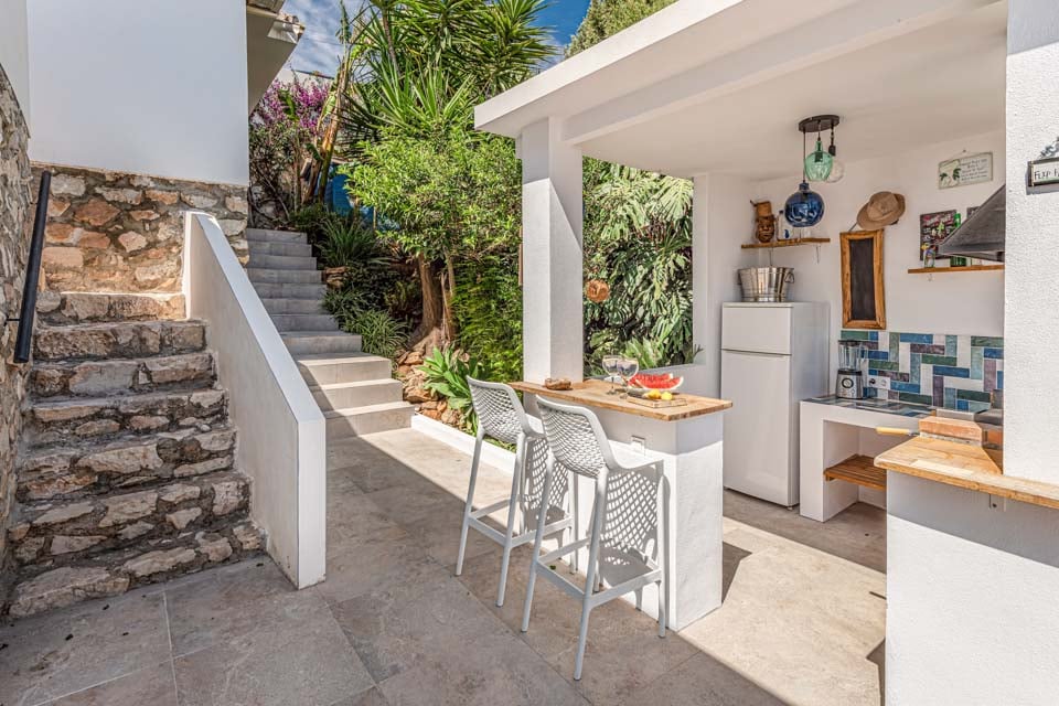 Denne villa har fire soveværelser, hvoraf tre har eget badeværelse. Master-suiten med walk-in closet består af en komfortabel super kingsize-seng og et pænt badeværelse, hvor du kan slappe af i et fritstående badekar og en separat walk-in regnbruser. Den anden suite har en dobbeltseng og et nyt ensuite brusebadeværelse med en smuk privat terrasse omgivet af blomster. Det tredje soveværelse med dobbeltseng ligger i gangen og har et separat fælles badeværelse med regnbruser. Endelig ligger det fjerde soveværelse med dobbeltseng på første sal via en vindeltrappe med udsigt til haven og eget brusebad. Alle soveværelser har aircondition og SONOS-højttalere.