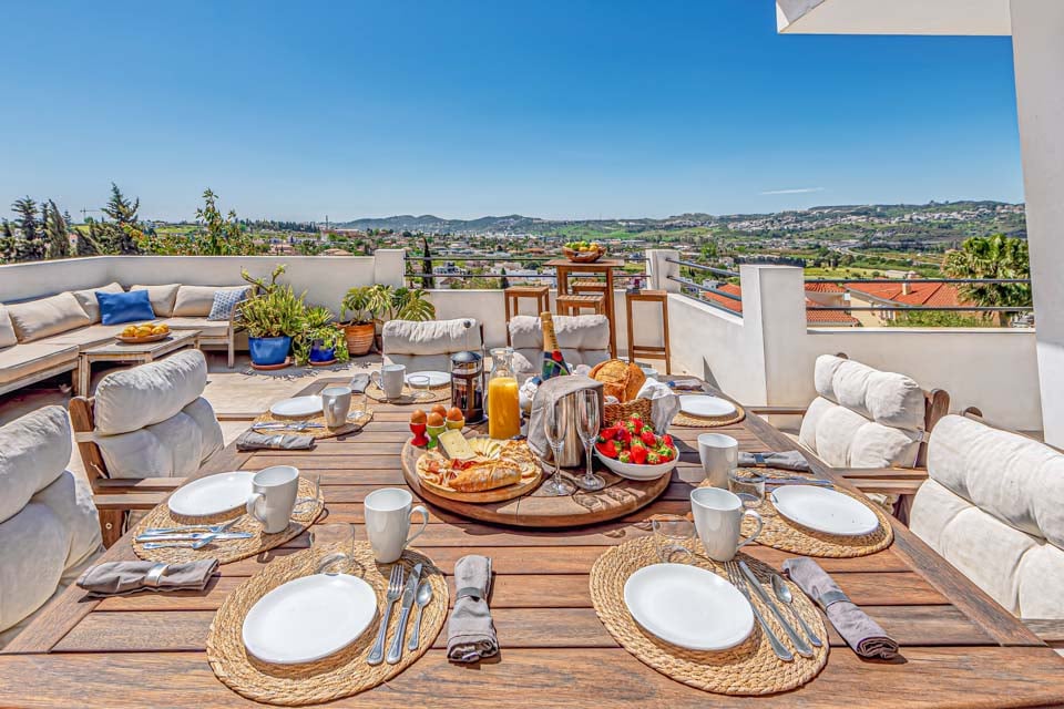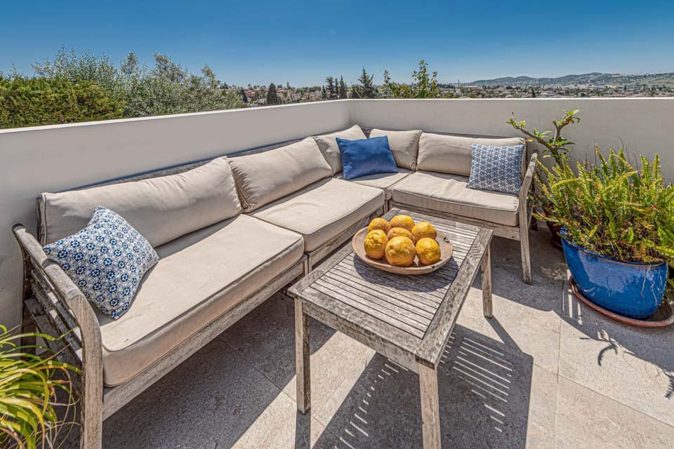 Denne store terrasse, der ligger ud for det åbne opholdsområde, er det perfekte sted til en morgenkaffe ved solopgang eller en drink ved solnedgang. Her er der en sikkerhedsport for at forhindre børn i at få adgang til poolen og underholdningsområdet i den nederste etage.