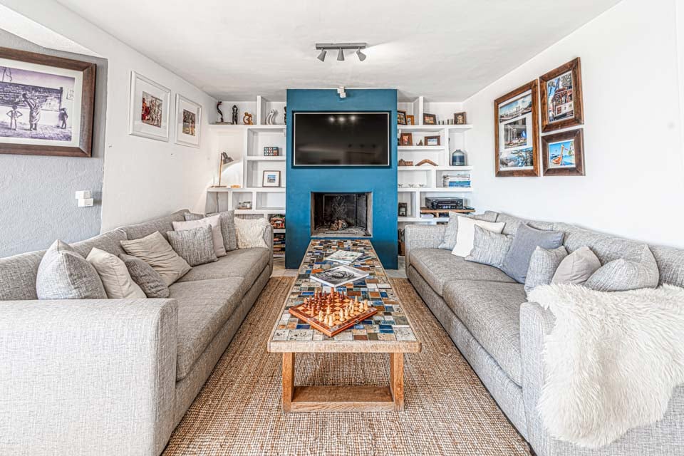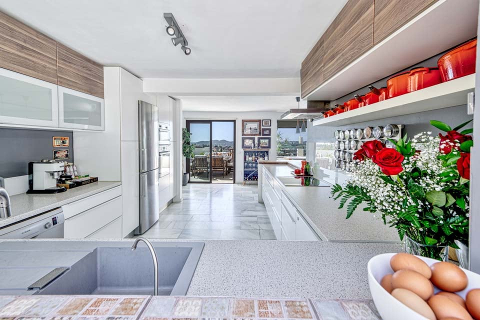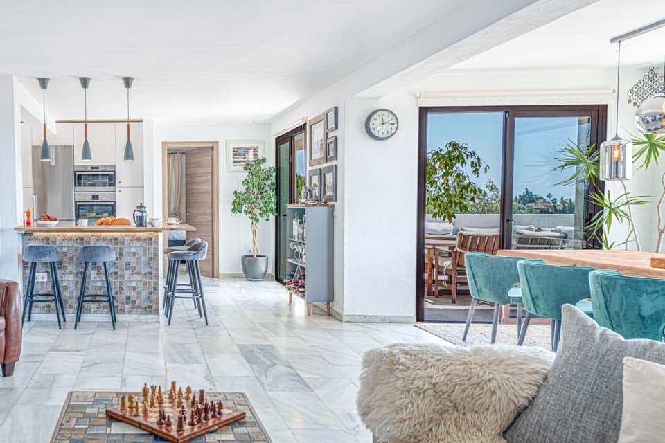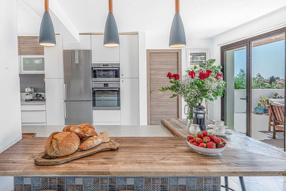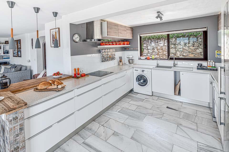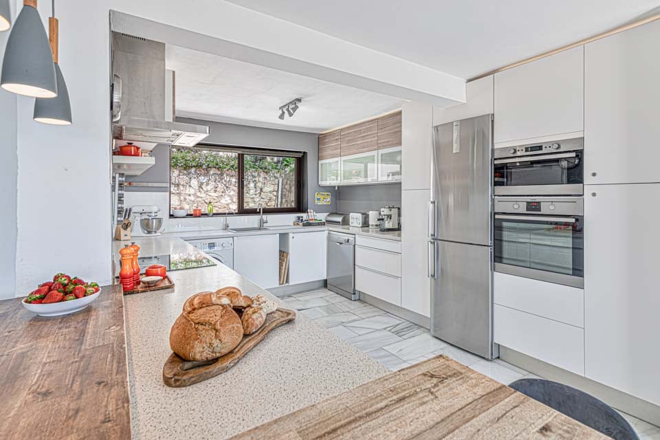 Ved ankomst vil du blive mødt af en entré, der fører ind i et dejligt åbent opholdsrum. Opholdsstuen er fyldt med naturligt lys takket være dobbeltdørene og de store vinduer, der viser den fantastiske udsigt over landskabet og havet. Opholdsstuen er problemfrit forbundet med en fantastisk terrasse med udsigt over poolen og haven. Med sine moderne møbler er opholdsrummet opdelt i forskellige zoner. I et hjørne finder du et fantastisk kontorlokale med et skrivebord placeret under et stort vindue med en utrolig udsigt. Ved siden af kontoret er der en charmerende spisestue med luksuriøse skovgrønne polstrede stole, et spisebord i træ og moderne loftslamper. Selve opholdsstuen kan prale af komfortable sofaer foran en væg med en moderne brændeovn og et vægmonteret fjernsyn. Overfor opholdsstuen er et moderne hvidt køkken i træ, udstyret med en hyggelig morgenmadsbar og taburetter. Køkkenet er en drøm for enhver kok, da det er veludstyret med apparater af højeste kvalitet.