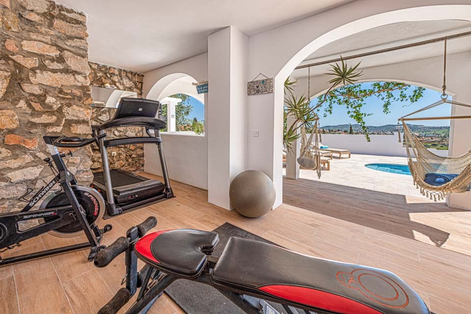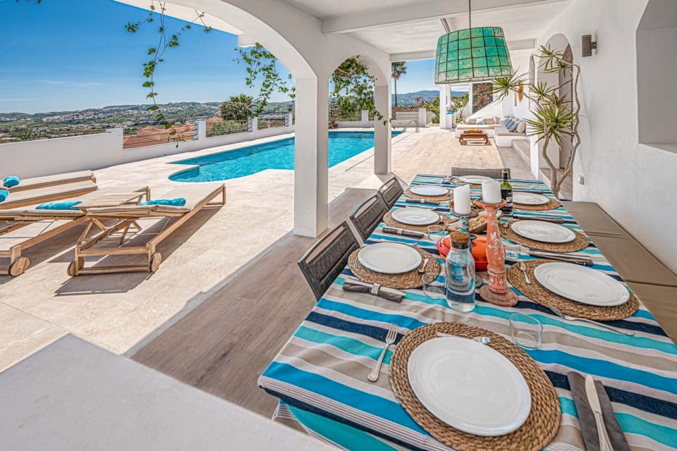 Fra stueetagen fører en lille trappe ned ad den nederste terrasse og de sydvendte pool-underholdningsområderne er elegant møbleret med en dobbelt dagseng og chill out-zone, liggestole i træ, bordtennis og hængekøjer. Dette område har også et udendørs køkken og en bar med en stor gasgrill og et skyggefuldt spisebord. Denne zone tilbyder en spektakulær udsigt, et tropisk udendørs badeværelse og et fitnesscenter ved poolen. Villaen ligger i en dejlig anlagt have, perfekt til børn.