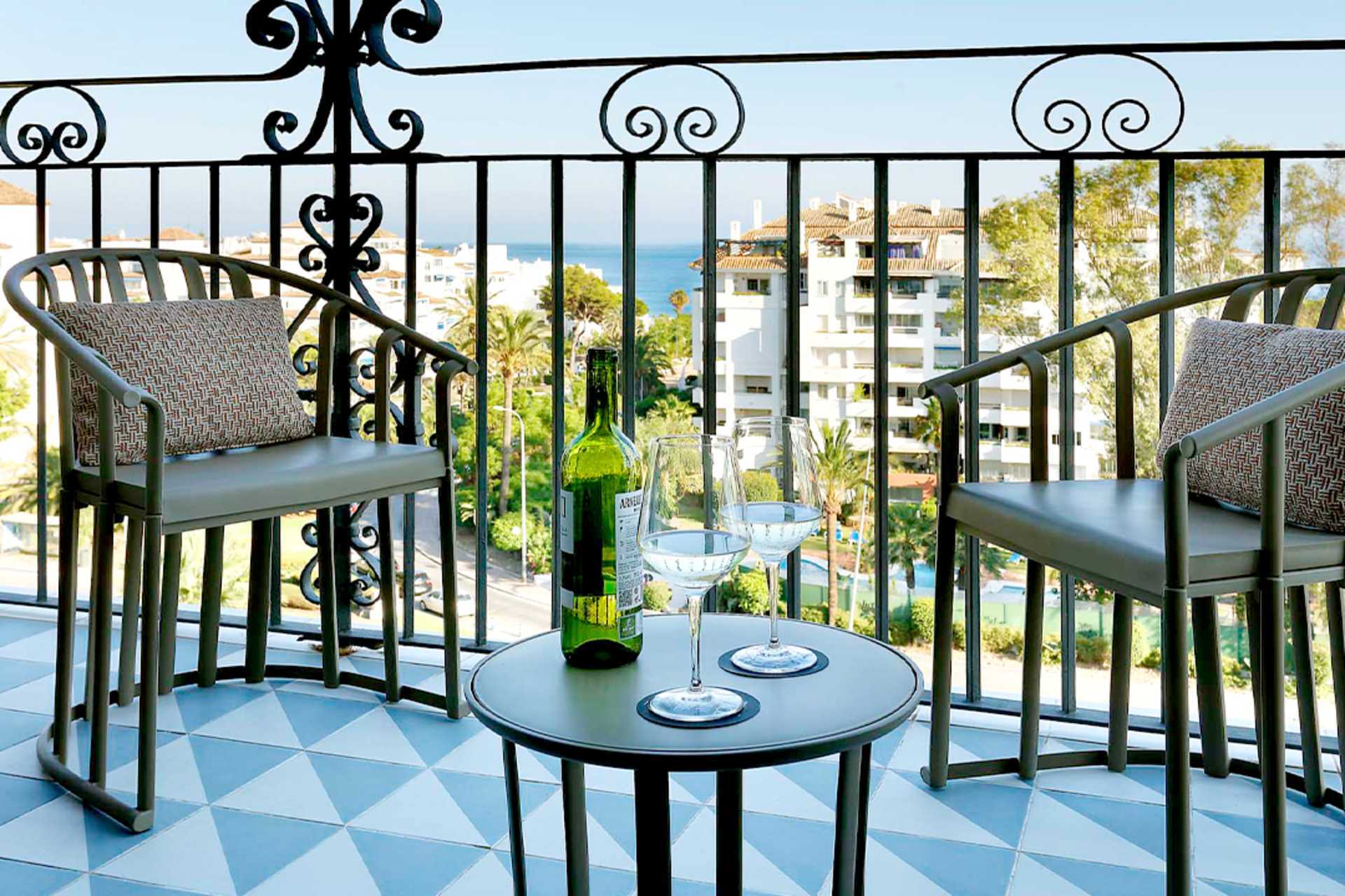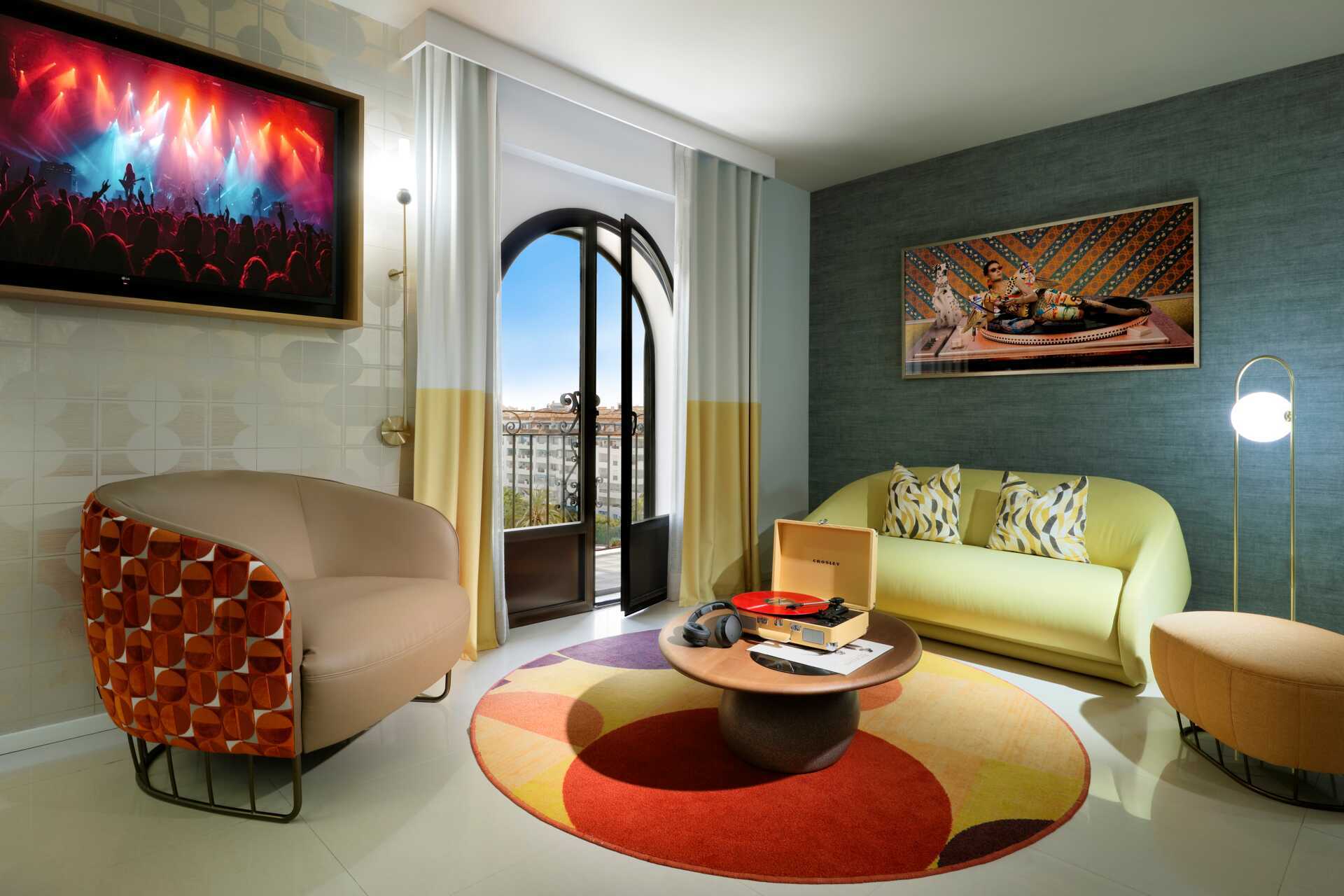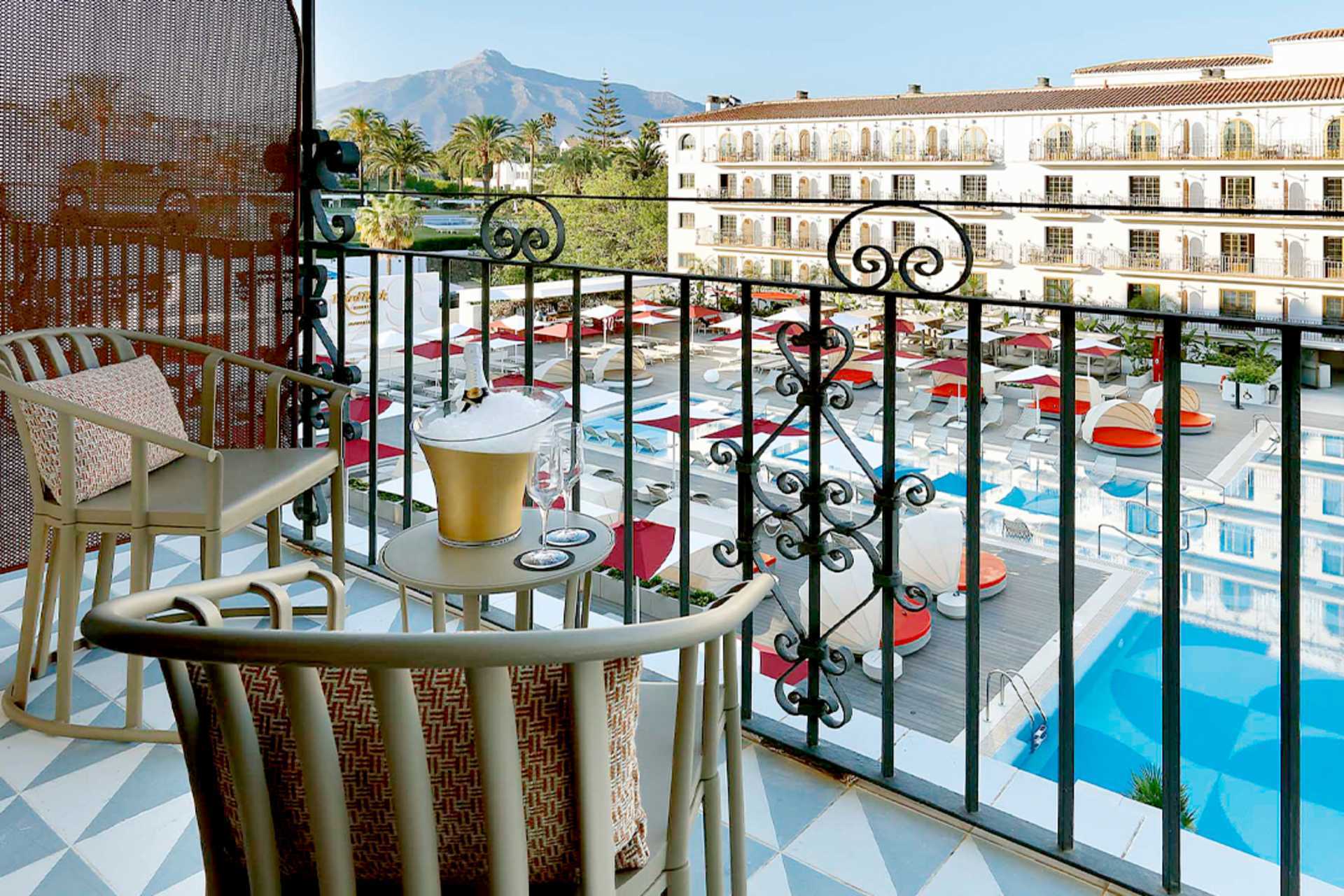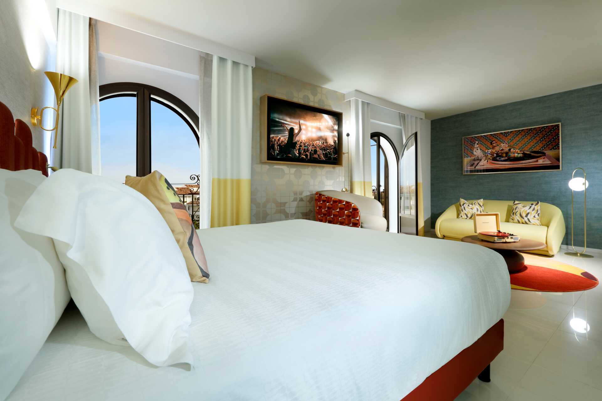 Suiterne med balkon. Suiten består af et soveværelse og et opholdsrum med fold ud-stole og en sofa. En dobbeltseng eller to enkeltsenge. Mulighed for en ekstra opredning i sovesofaen. Sleep-Like-A-Rock® sengetøj. Gratis wifi, aircondition og deponering. Minibar. El-kedel og kaffe og te. Nespresso kaffemaskine. Tv med internationale kanaler. Badekåber og tøfler. Hårtørrer. Rock Spa® badeværelsesprodukter. Åben planløsning til håndvask, separat bruser med glasdøre og separat toilet. Rengøring 7 gange om ugen.