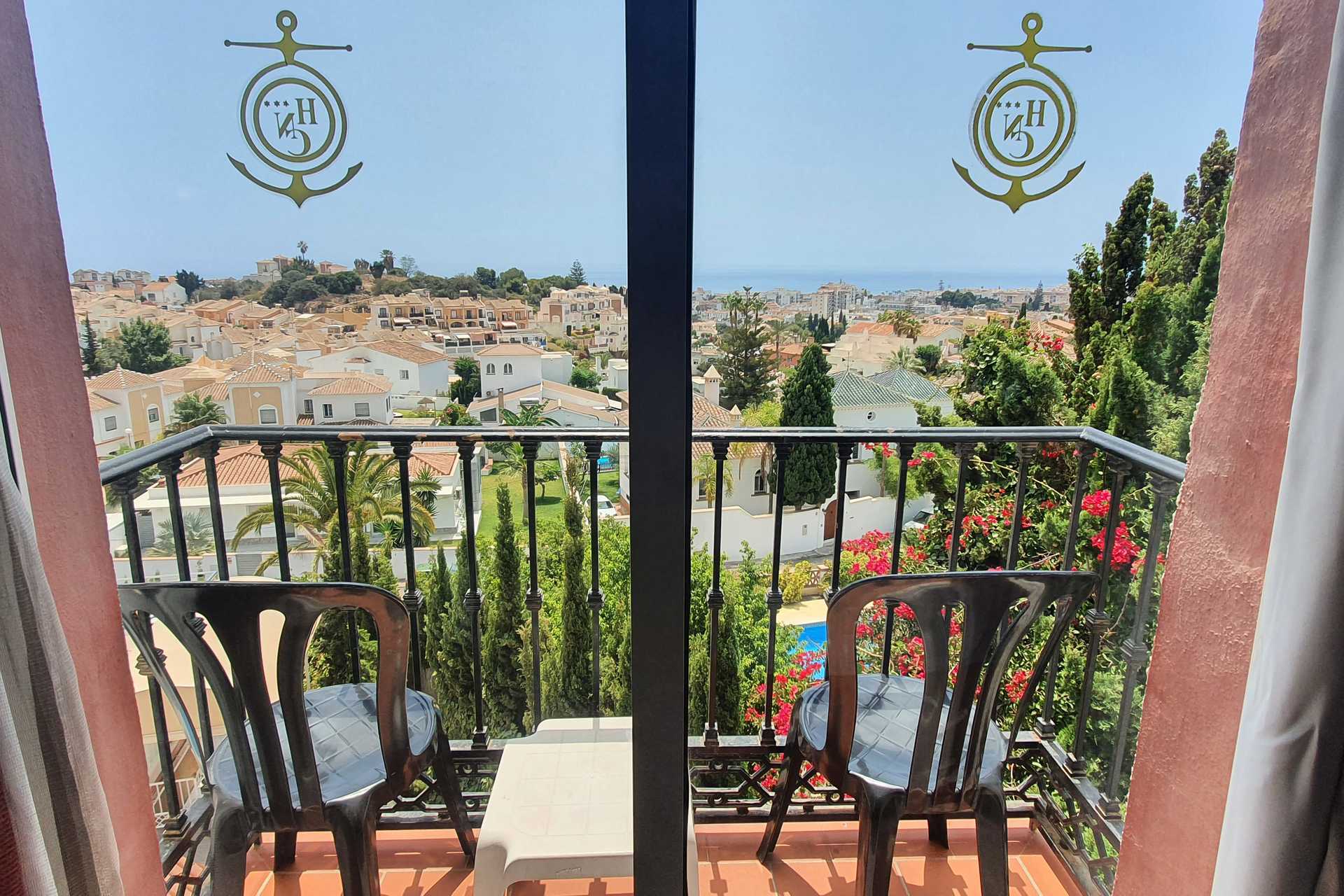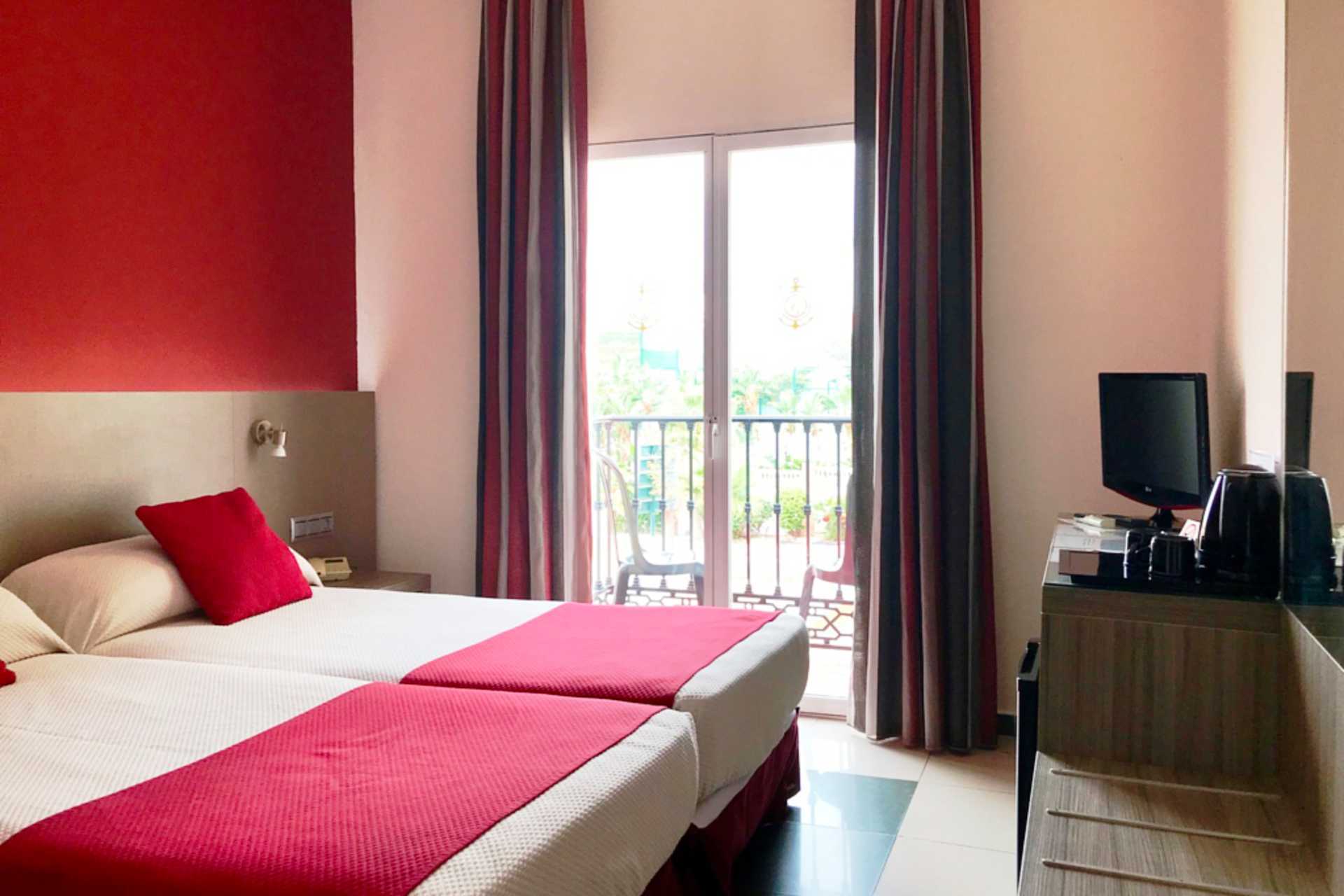 Dobbeltværelse med balkon eller terrasse, alternativt med fransk balkon. En dobbeltseng eller to enkeltsenge. Mulighed for ekstra opredning i enkeltseng. Gratis wifi. Aircondition og deponering mod betaling. Køleskab. Hårtørrer. Badeværelse med badekar og toilet. Rengøring 7 gange om ugen.