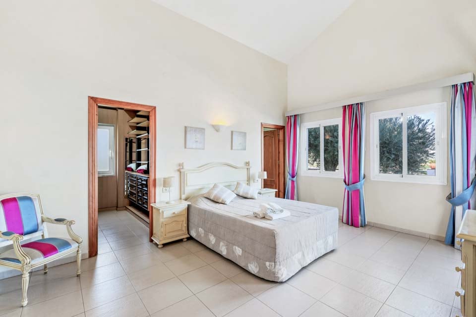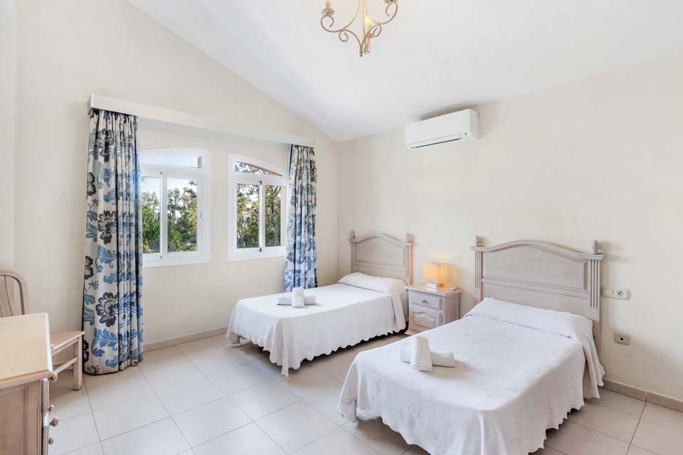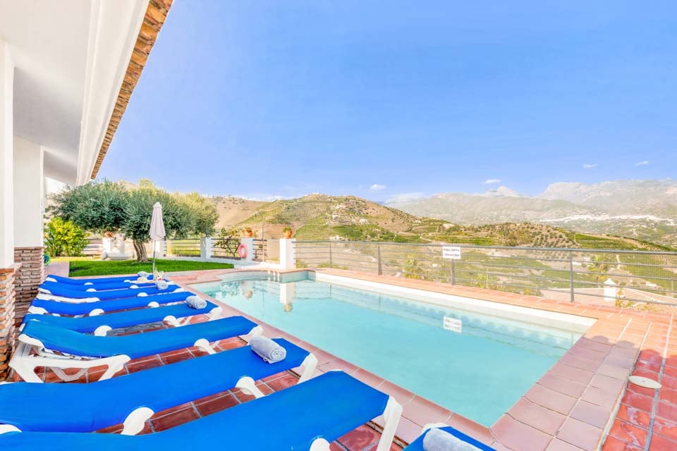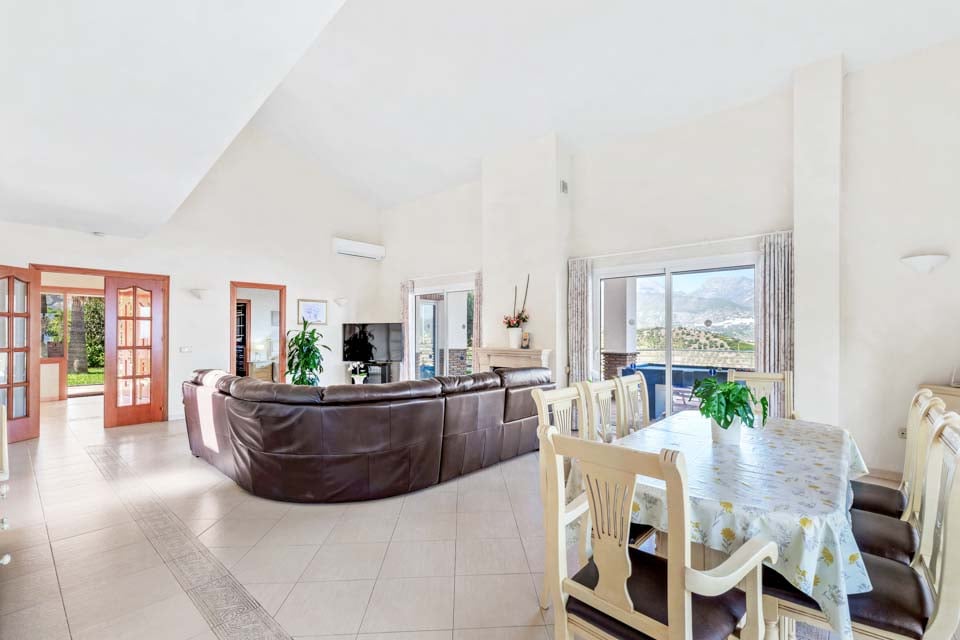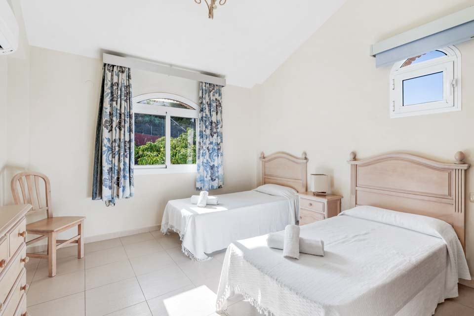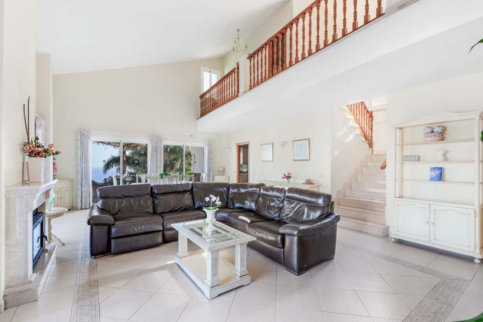 Indenfor er der en stor stue og spisestue, som er smagfuldt indrettet, sammen med et separat, stort og fuldt udstyret køkken. Ovenpå er der en mezzanin med udsigt over opholdsstuen, hvor der er to soveværelser med to enkeltsenge og et badeværelse. Tilbage i stueetagen er der yderligere to soveværelser, begge med dobbeltsenge, det ene med eget badeværelse samt et yderligere brusebad. Terrassedøre fører ud til den indbydende pool og grillplads, perfekt til at nyde både solen og den fantastiske udsigt.