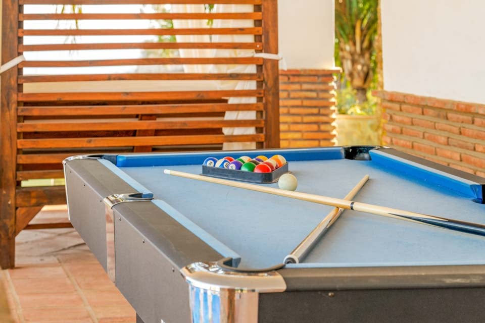 Udendørs servering, udendørs spisefaciliteter, grill, murstensgrill, overdækket terrasse, spisefaciliteter, udendørs dagseng, græsplæne, åben terrasse, parasol, billardbord, liggestole
