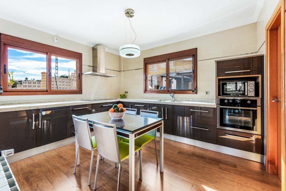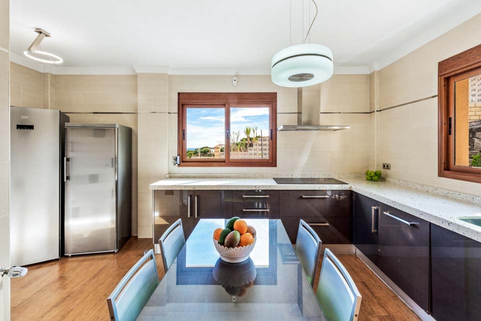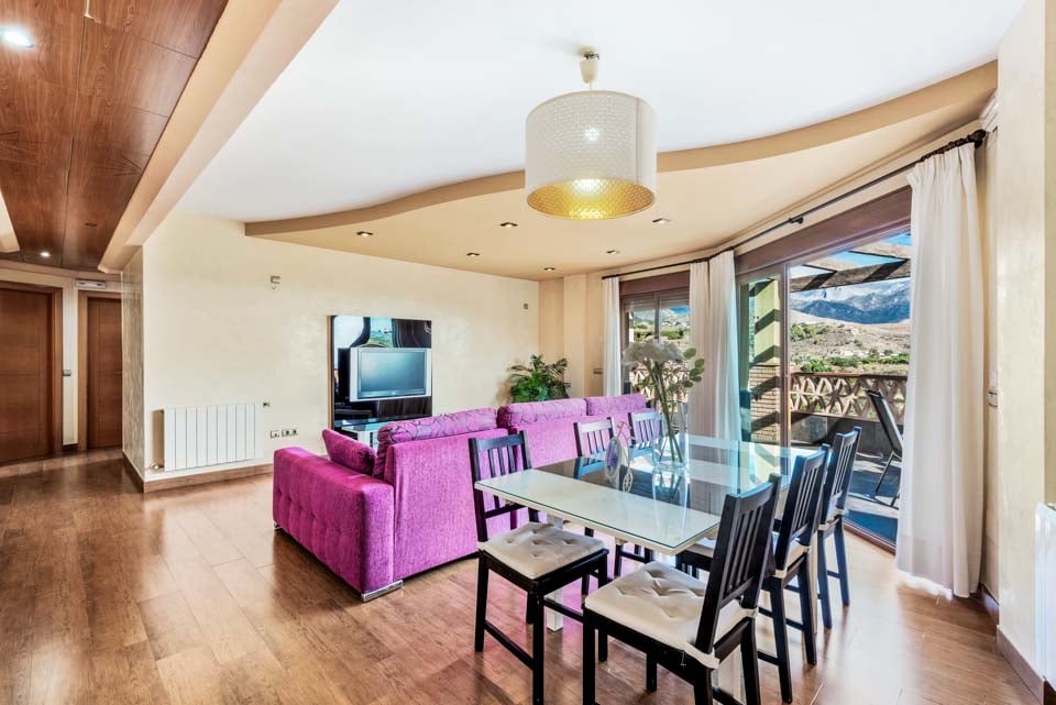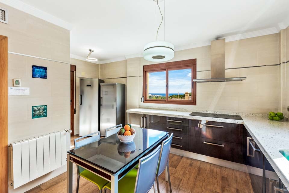 Det handler ikke kun om udsigten, Villa Ana Bella er en perle i sig selv med ferskenstensfacader og terrakottarøde tage, der afspejler et traditionelt spansk hjem. Der venter en overraskelse indenfor med et elegant og moderne indretning, der tilføjer et strejf af moderne luksus til denne villa i autentisk stil. Den åbne opholdsstue er rummelig og elegant designet med et beroligende jordnært farveskema, der står i kontrast til den livlige lilla sofa, minimalistiske indretning, trendy belysning og et elegant spisebord. Opholdsrummet er omgivet af store vinduer og skydedøre af glas, og det vækkes til live med masser af naturligt lys, der siver ind. Blanke sorte skabe og elegante bordplader gør køkkenet dristigt og lyst, med eksklusive apparater i rustfrit stål, der vil glæde enhver spirende kok. Hvis du vil nyde middelhavsvarmen fuldt ud, er spisebordet på terrassen det hyggeligste sted til middag. Der er tre soveværelser, et med dobbeltseng og to med to enkeltsenge, der komfortabelt kan rumme op til seks personer.