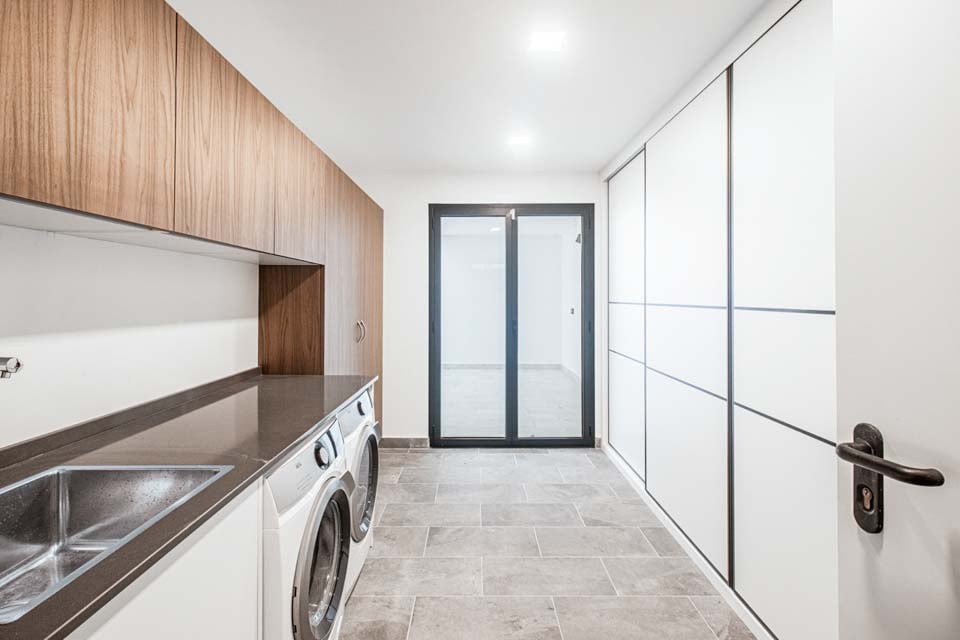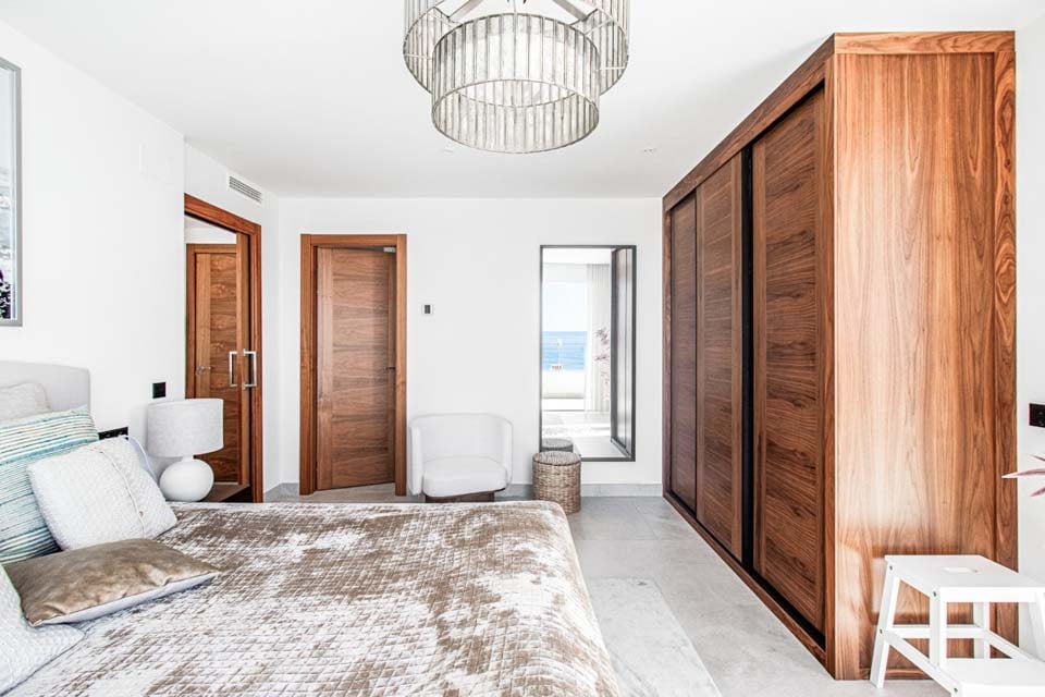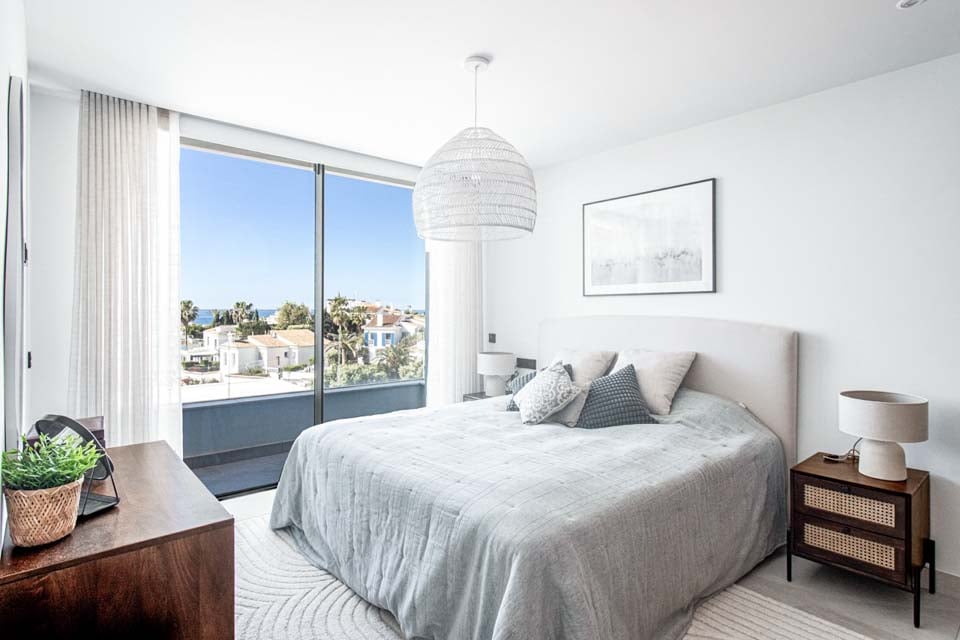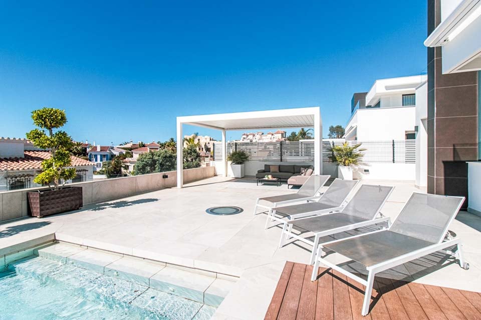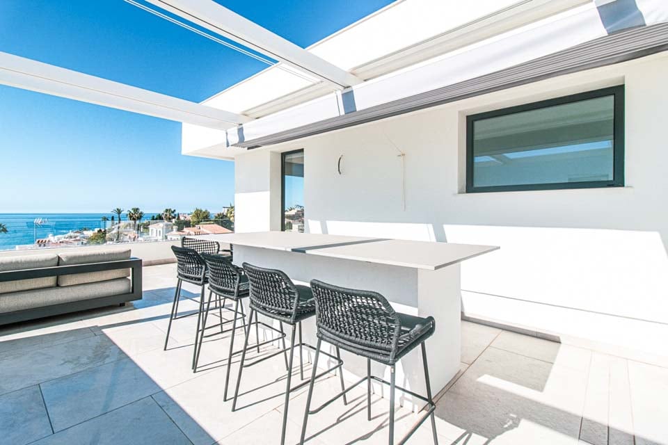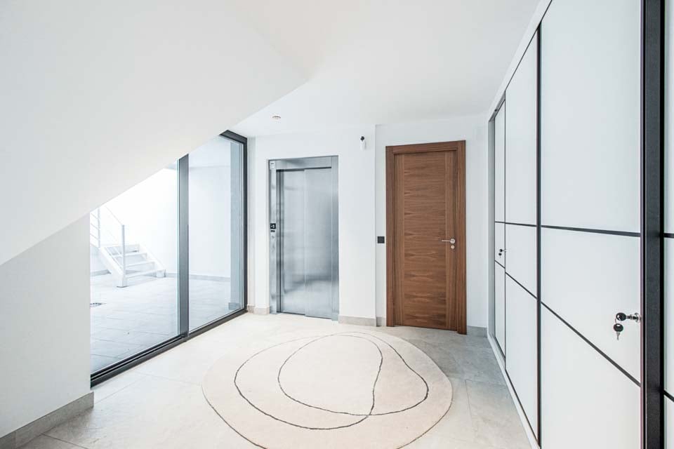 Villaen har en indgang i stueetagen, med rummelige opholdsrum på første og anden sal. For ekstra bekvemmelighed forbinder en elevator alle etager, hvilket sikrer nem adgang i hele boligen. På anden sal finder du to smukke soveværelser, der begge åbner ud til en privat tagterrasse med en betagende panoramaudsigt over havet. Terrassen kan også prale af et stilfuldt barområde, hvor man kan nyde en drink, mens man nyder aftenen.