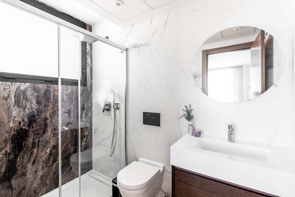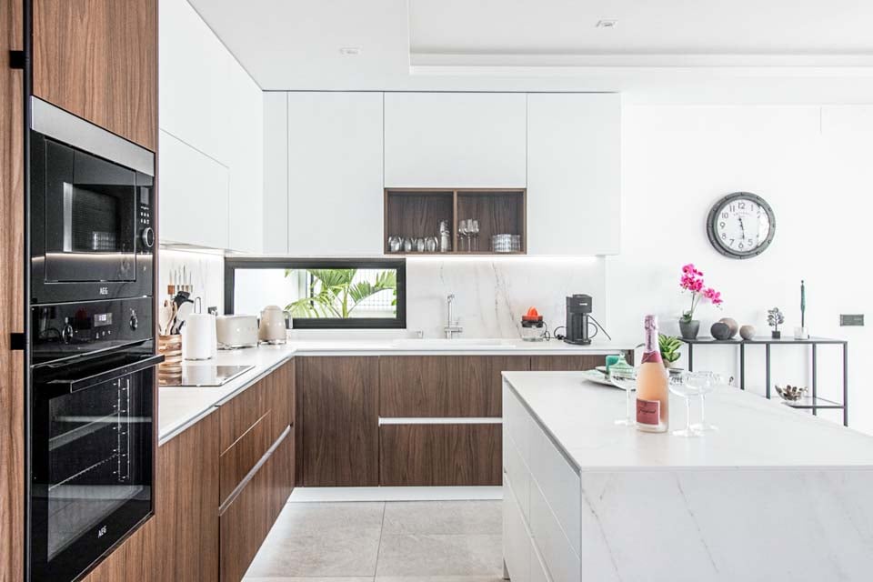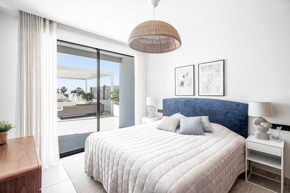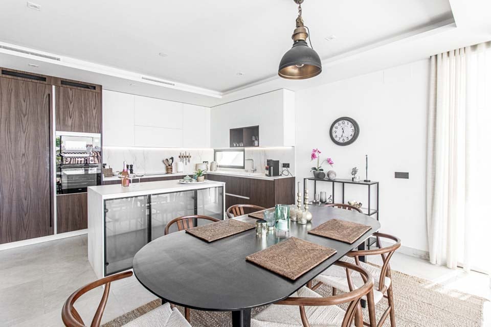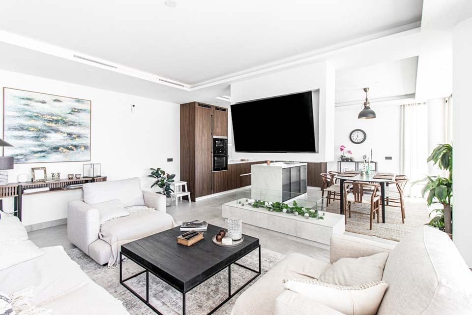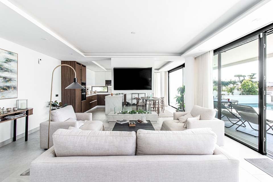 Villaen har en indgang i stueetagen, med rummelige opholdsrum på første og anden sal. For ekstra bekvemmelighed forbinder en elevator alle etager, hvilket sikrer nem adgang i hele boligen. På anden sal finder du to smukke soveværelser, der begge åbner ud til en privat tagterrasse med en betagende panoramaudsigt over havet. Terrassen kan også prale af et stilfuldt barområde, hvor man kan nyde en drink, mens man nyder aftenen.