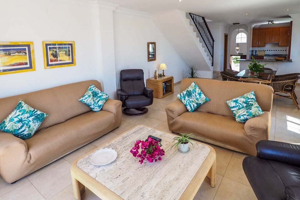 Ejendommen nås via et par trin til en entré. Herfra fører en kort trappe op til øverste etage, hvor der er garderobe/toilet, stor stue/spisestue og fuldt udstyret køkken. Loungen er udstyret med satellit-tv, dvd-afspiller, cd-afspiller og gratis wifi. Terrassedøre fører ud til en stor terrasse med vidunderlig udsigt over havet og kysten.
