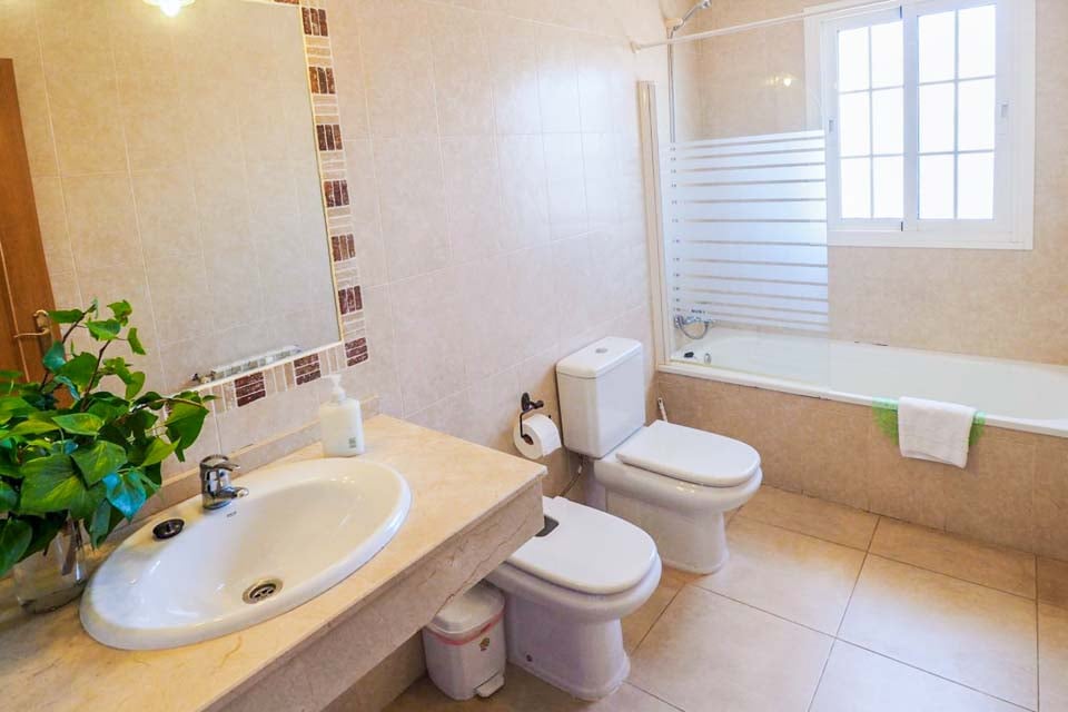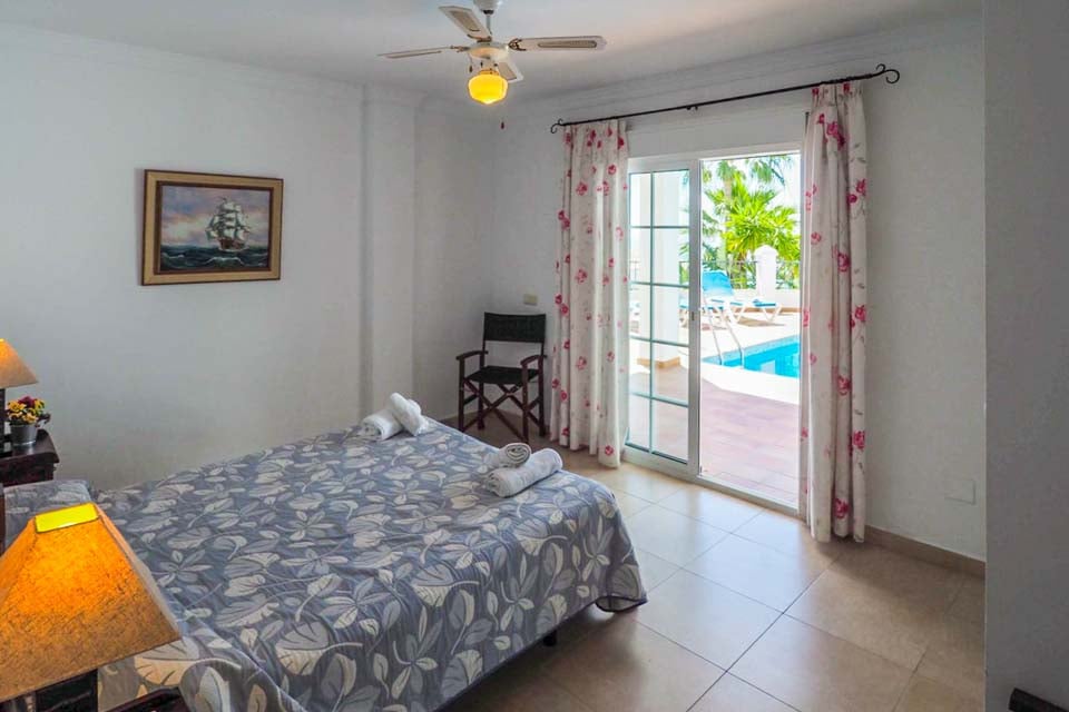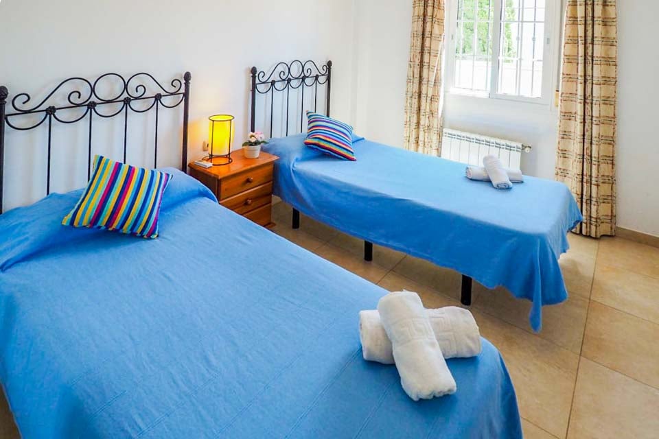 Nede fra entréen er der 3 soveværelser, 2 med to enkeltsenge, der deler et komplet badeværelse, og et stort soveværelse med dobbeltseng og eget badeværelse. Fra soveværelset med dobbeltsengen åbner der terrassedøre ud til poolen og terrassen. Alle soveværelser har reversible klimaanlæg, der leverer varme/køling efter behov.