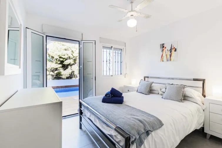 Dobbeltseng, Dobbeltseng, Aircondition, Loftsventilator, Ventilator, Døre til terrasse