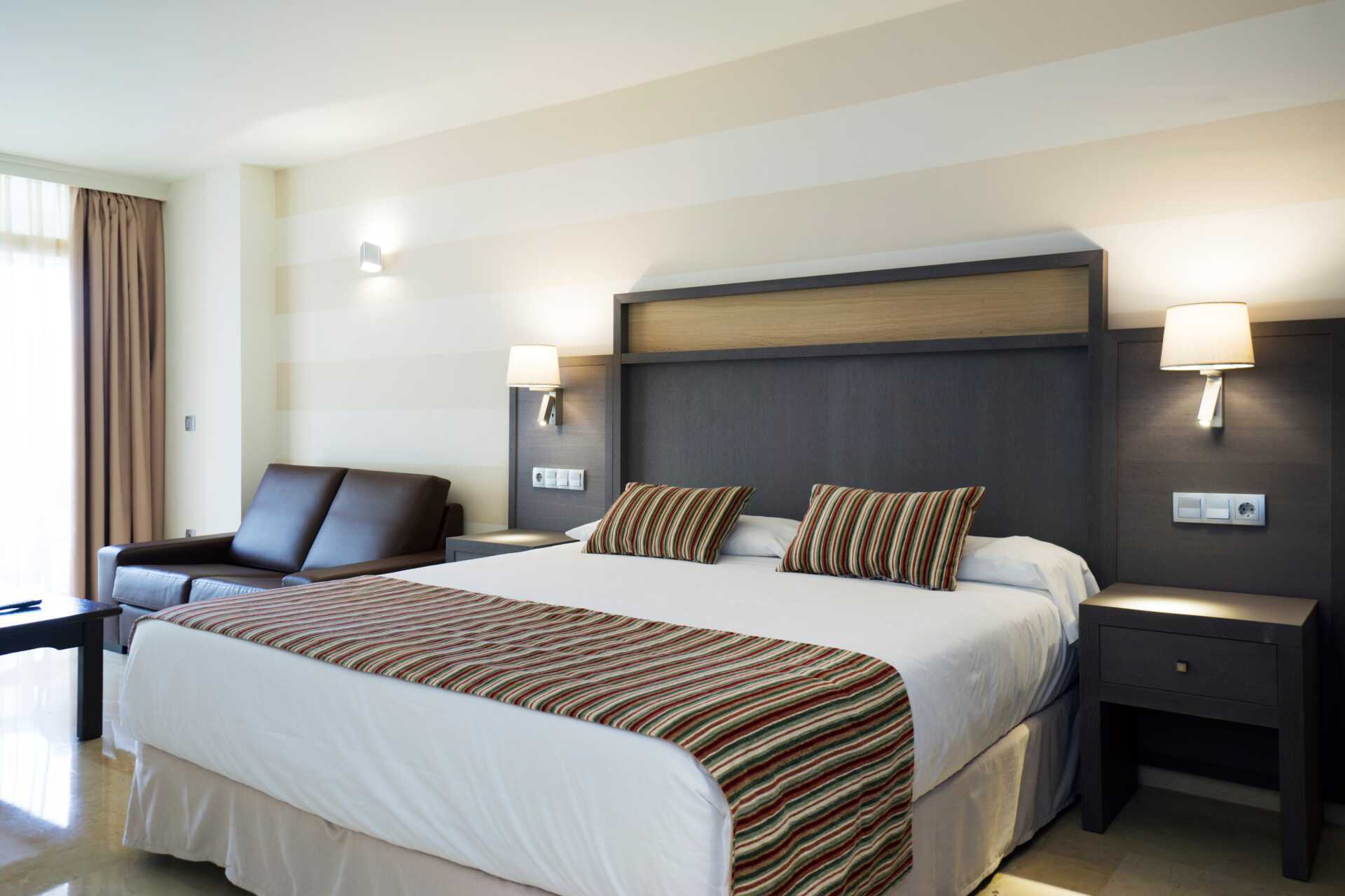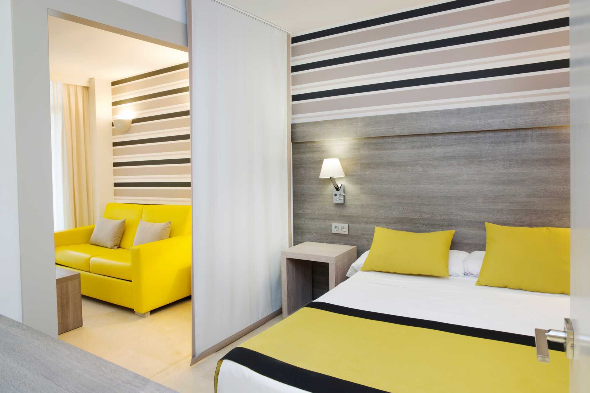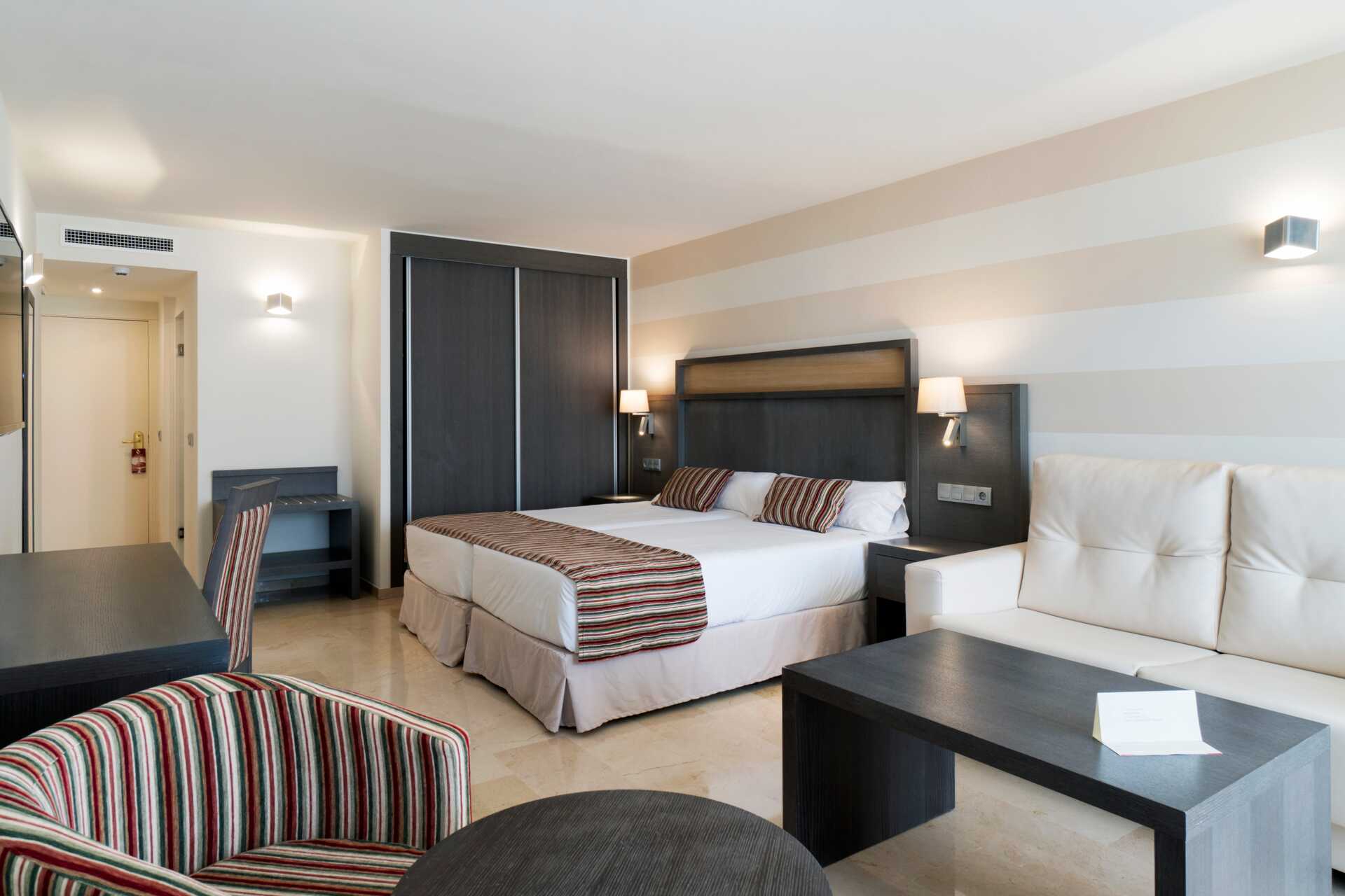 Junior-suiter med balkon, nogle med pooludsigt og nogle med delvis havudsigt. En dobbeltseng eller to enkeltsenge. Mulighed for ekstra opredninger i sovesofa eller fold-ud seng. Gratis wifi, aircondition og deponering. El-kedel. Tv med internationale kanaler. Hårtørrer. Badeværelse med bruser og toilet. Rengøring 7 gange om ugen.