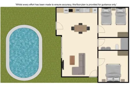For at komme til villaen er der en 88 cm bred sti, sammen med 1 trin. Hoveddøren har en bredde på 76 m, mens døren til terrassen er 70 cm bred. Stien til poolområdet er 157 cm bred. Terrassen er åben og flad, mens der er en lille kant over terrassedørene. Terrassen er en blanding af fliser og kunstgræs. Der er 17 trin til tagterrassen. Dette er en ejendom i stueetagen, hvor dørene til soveværelset med to enkeltsenge, badeværelset og køkkenet er 70 cm brede. Døren ind til stuen er 76 cm bred. *Bemærk venligst, at selvom vi har gjort alt for at sikre, at de givne oplysninger er nøjagtige, kan der forekomme fejl, og hvis du har brug for mere specifik information om villaen, er du velkommen til at kontakte os.