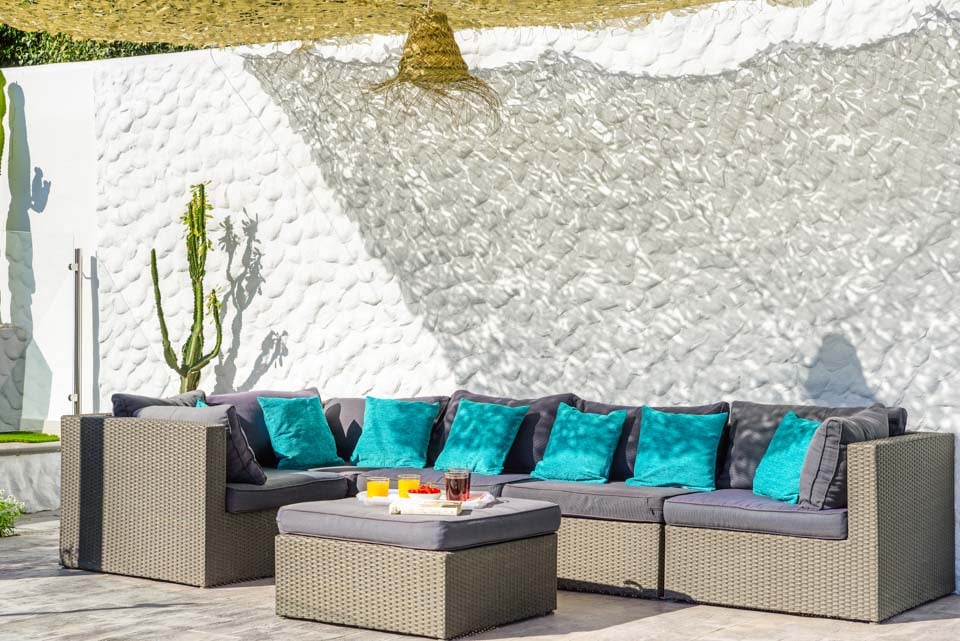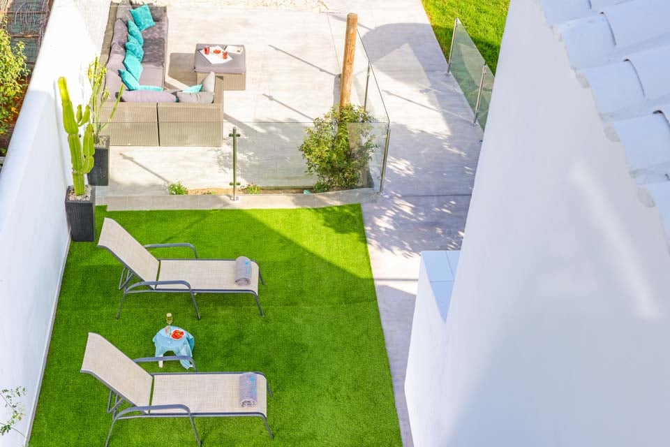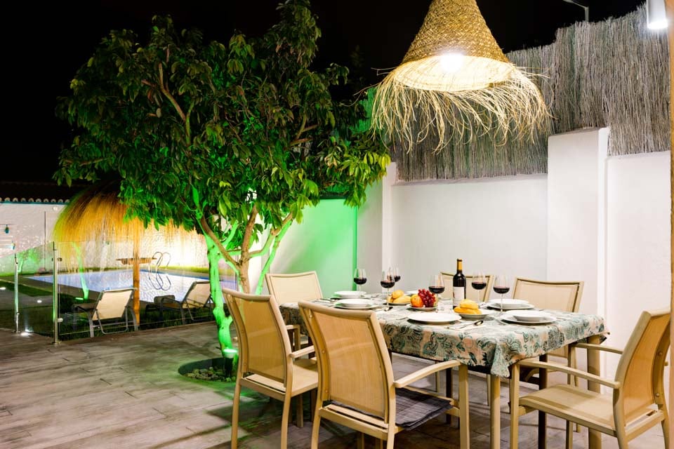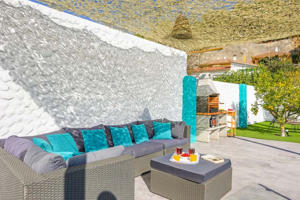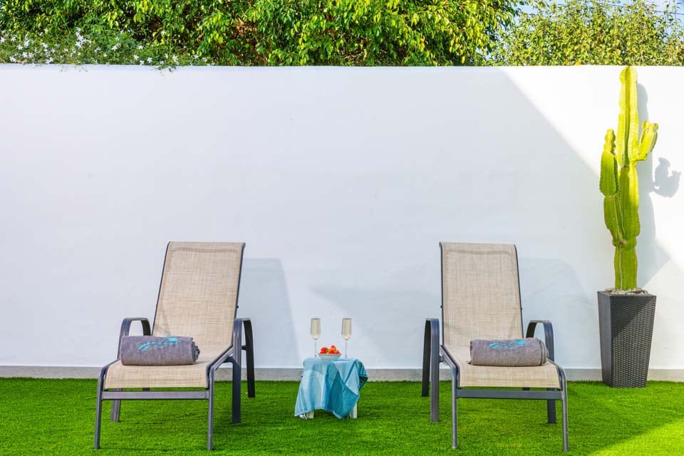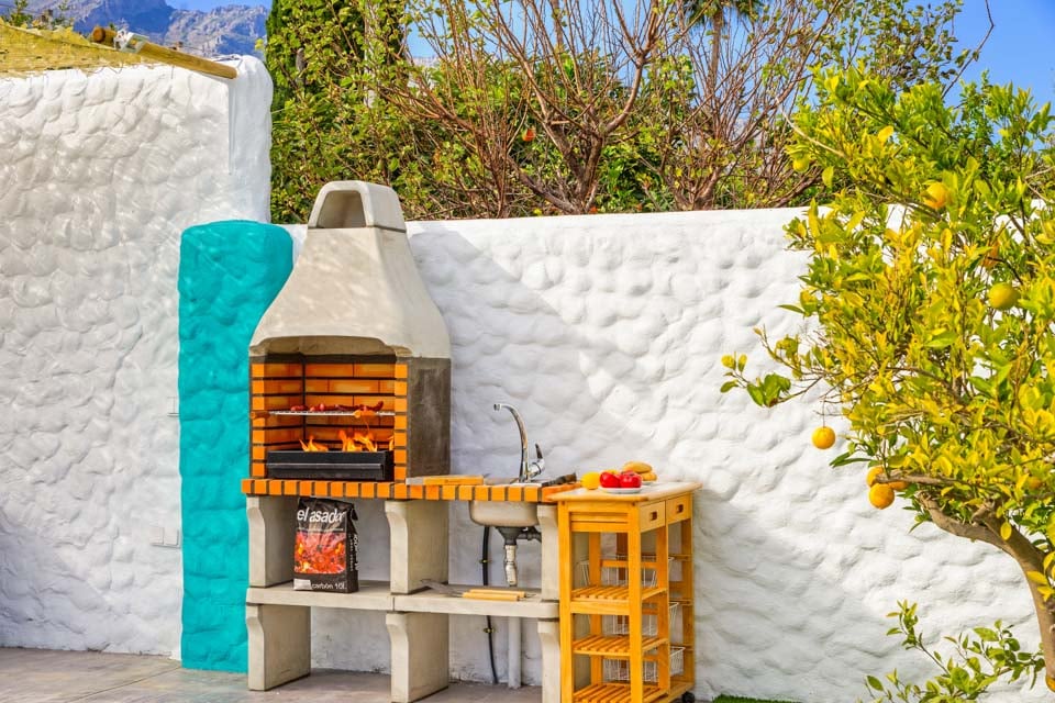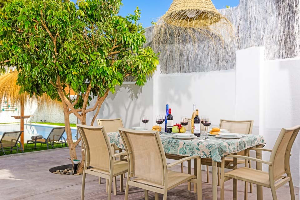 Villaen er omgivet af en charmerende have med græsplæne og frugttræer, hvor gæsterne kan slappe af på den rummelige terrasse. Den private pool er omgivet af liggestole og elegante parasoller, mens komfortable rattansofaer, en smuk spiseplads og en indbygget grill er til rådighed til udendørs spisning og vin.