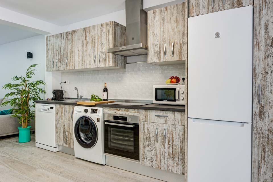 Ovn, Kogeplade, Fryser, Køleskab, Køleskab med fryser, Opvaskemaskine, Mikrobølgeovn, Vaskemaskine, Spiseplads, Døre til terrasse, Døre til terrasse/have, Smart TV