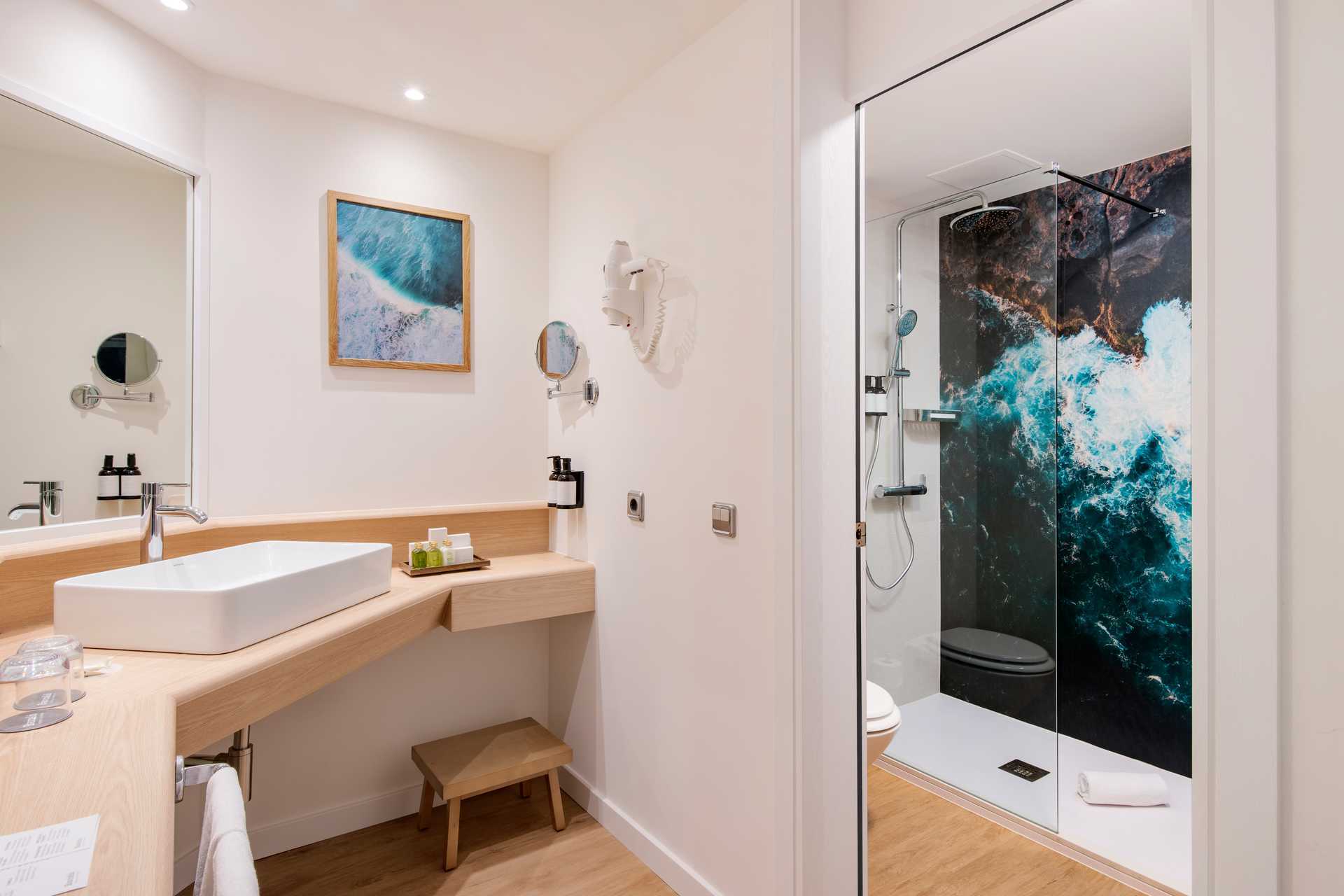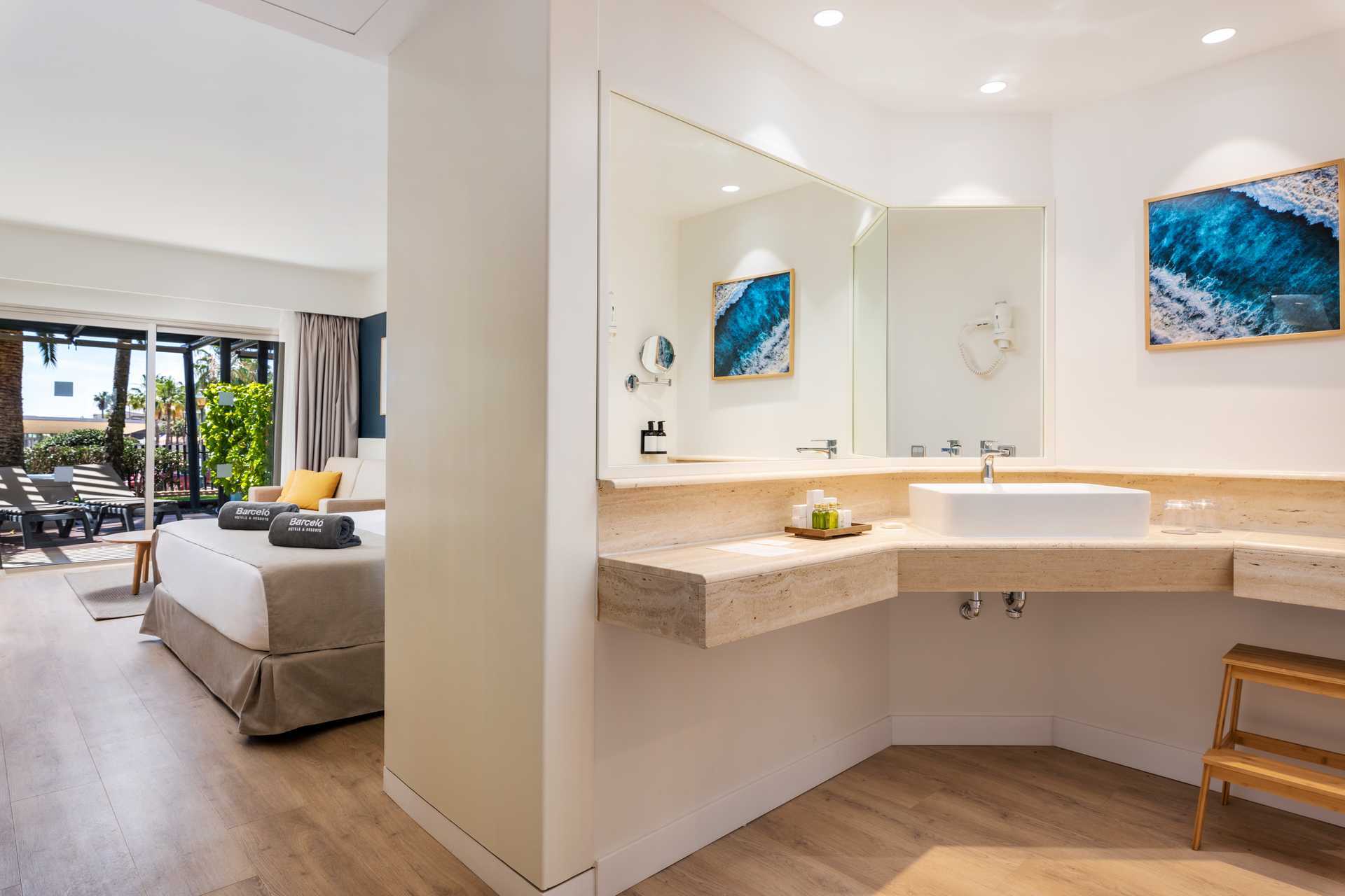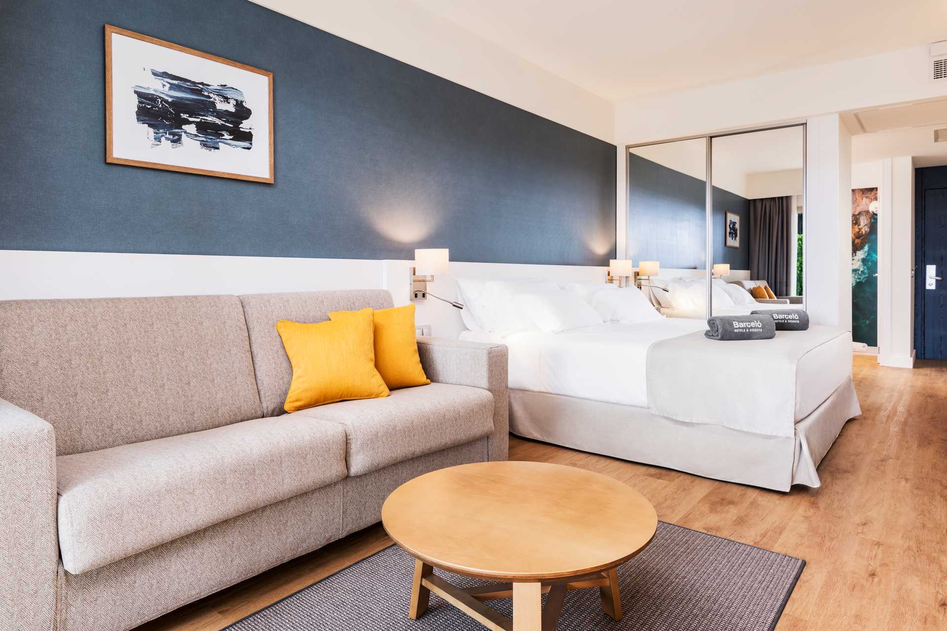 Dobbeltværelser med balkon eller terrasse, nogle med havudsigt. En dobbeltseng eller to enkeltsenge. Pudemenu. Mulighed for ekstra opredning i sovesofa. Gratis wifi, aircondition og deponering. Minibar mod betaling. Nespresso kaffemaskine. Tv med internationale kanaler. Badekåber og tøfler. Hårtørrer. Badeværelse, som er delvist åbent til værelset, med separat bruser og toilet. Rengøring 7 gange om ugen.