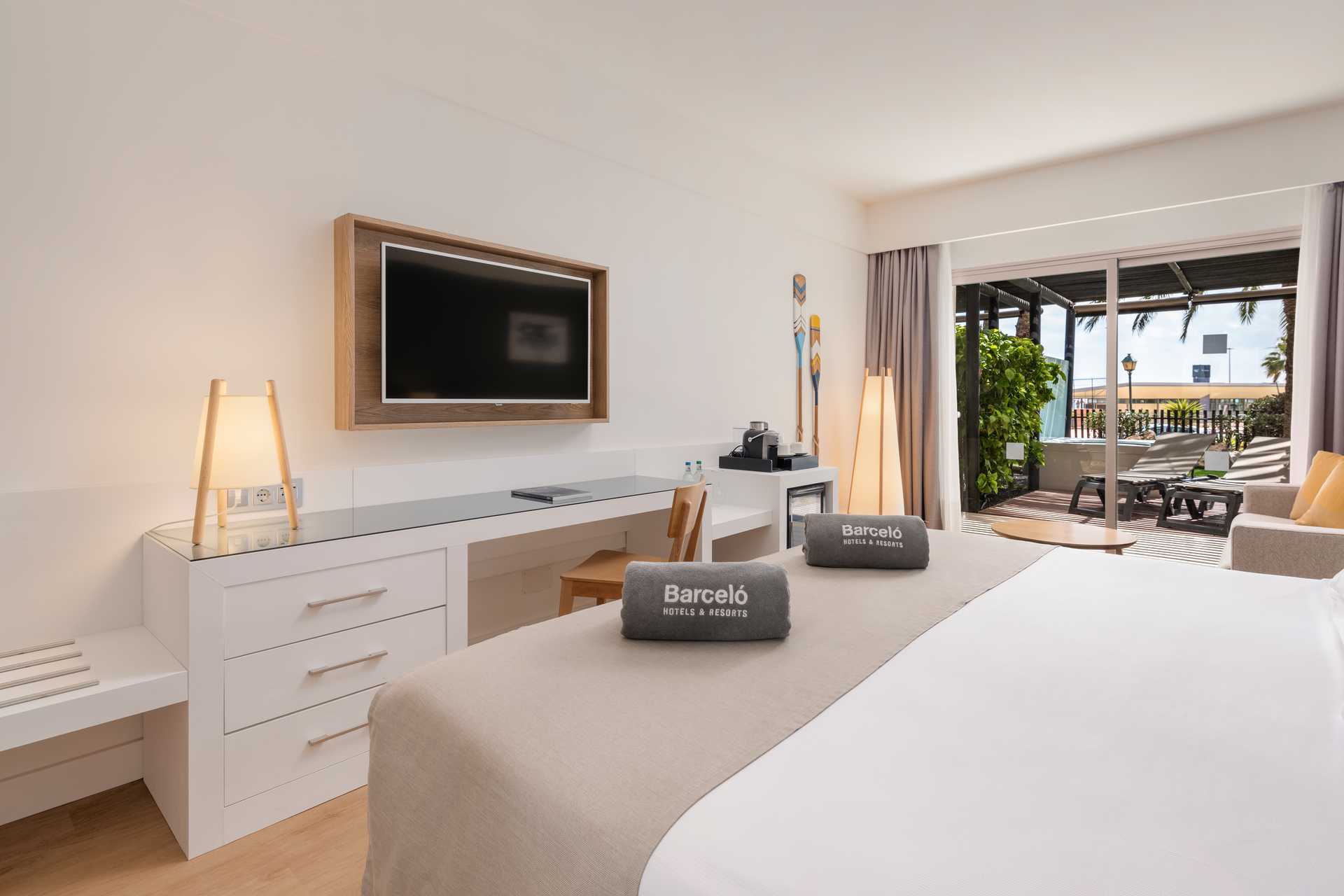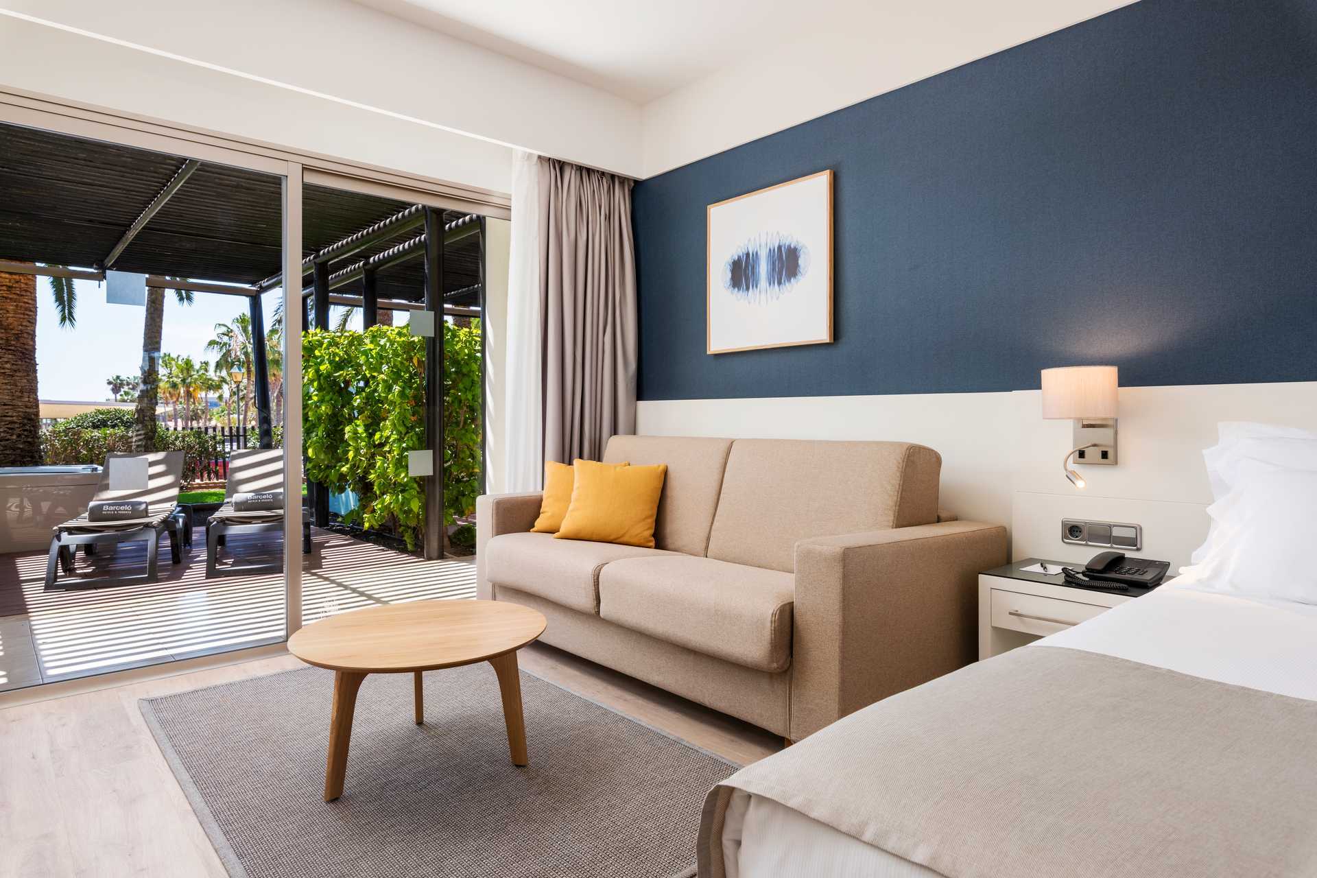 Deluxe-værelse med privat jacuzzi i stueplan terrasse. Terrassen har tag som solafskærmning og Solstole. En dobbeltseng eller to enkeltsenge. Pudemenu. Mulighed for ekstra opredninger i sovesofa. Gratis wifi, aircondition og deponering. Minibar mod betaling. El-kedel og kaffe/te. Tv med internationale kanaler. Badekåber og tøfler. Hårtørrer. Badeværelse, som er delvist åbent til værelset, med separat bruser og toilet. Rengøring 7 gange om ugen.