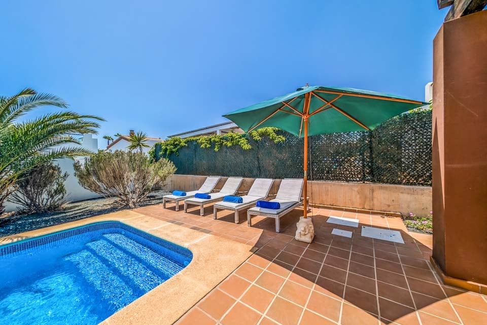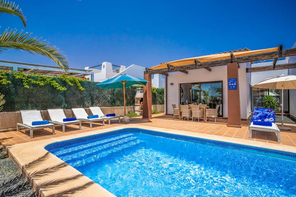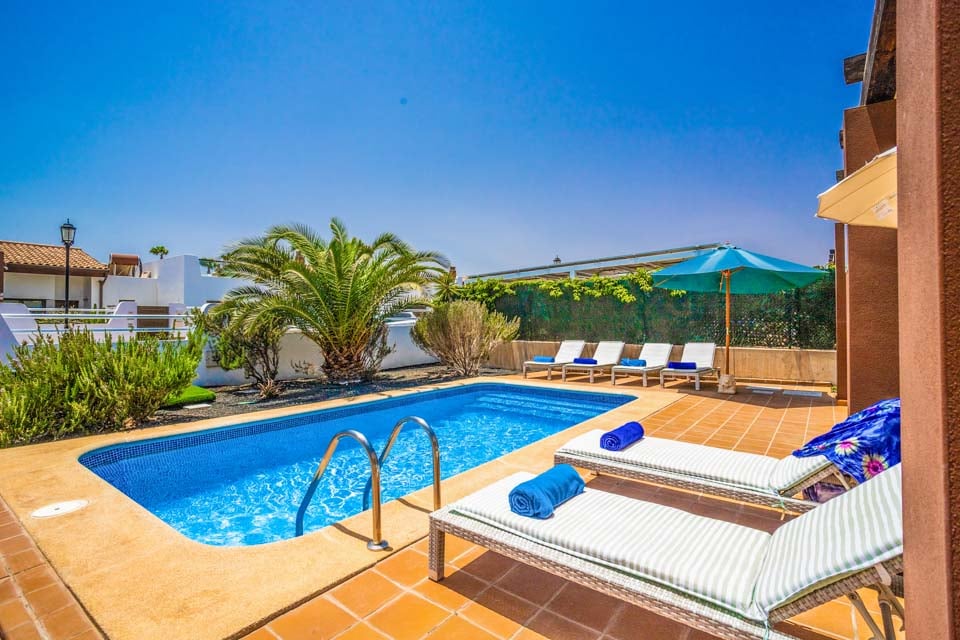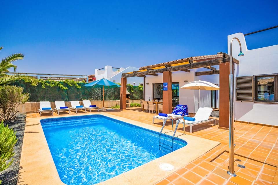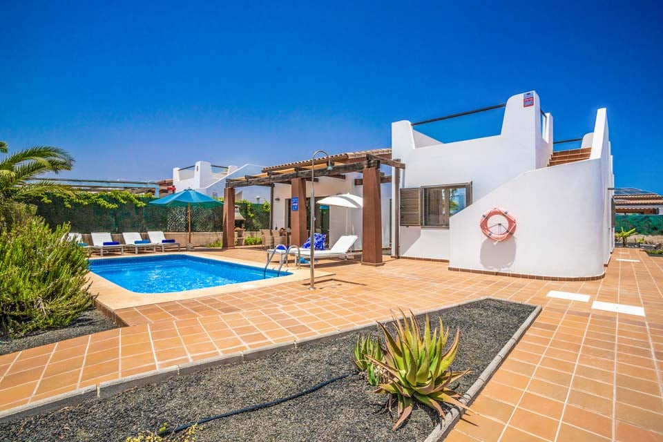 Forkæl dig selv med villa-lykke på Villa Gardenia, der ligger i det pulserende feriested Caleta de Fuste. Træd ind i en verden af komfort og afslapning, med tre indbydende soveværelser har det den perfekte størrelse til en familie, der leder efter en solkysset flugt. Læn dig tilbage og slap af i den minimalistiske opholdsstue med bløde sofaer og en enkel indretning. Køkkenet er en moderne fryd, hvor du nemt kan lave mad til et festmåltid med eksklusive apparater, elegante skabe og blanke bordplader. Nyd kulinariske kreationer på den skønne terrasse. Med en glitrende pool kan du tage en morgensvømmetur eller plaske med børnene. Den store have er din egen lille oase, eller for en 360-graders panoramaudsigt, tag til den store tagterrasse, der ligger højt over Las Salinas golfbane og den sublime kystlinje. Når du er klar til at udforske byen, venter Caleta de Fuste kun fem minutters kørsel væk med en drømmende gylden sandstrand og rækker af restauranter, barer og butikker. Golfelskere er klar til at finpudse deres sving på den nærliggende Fuerteventura Golf Club.