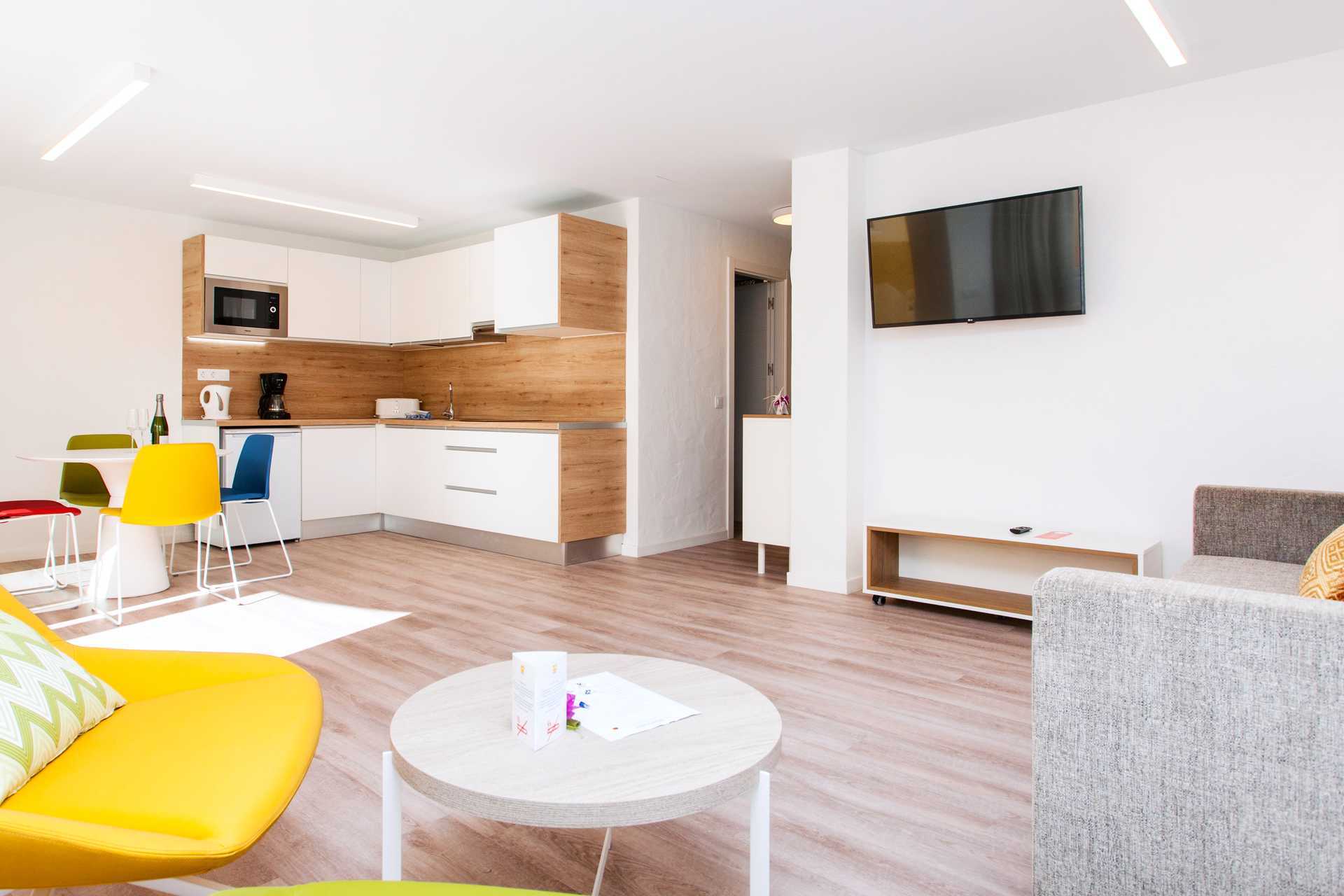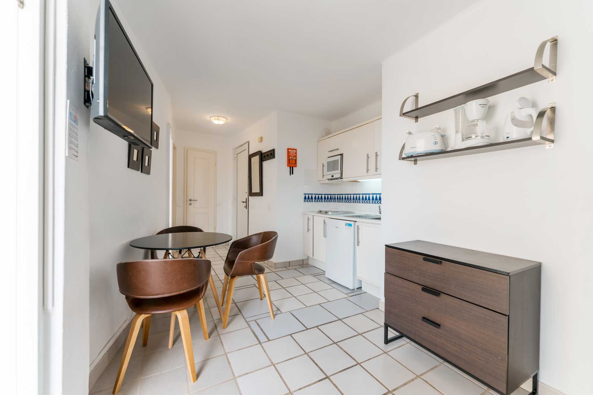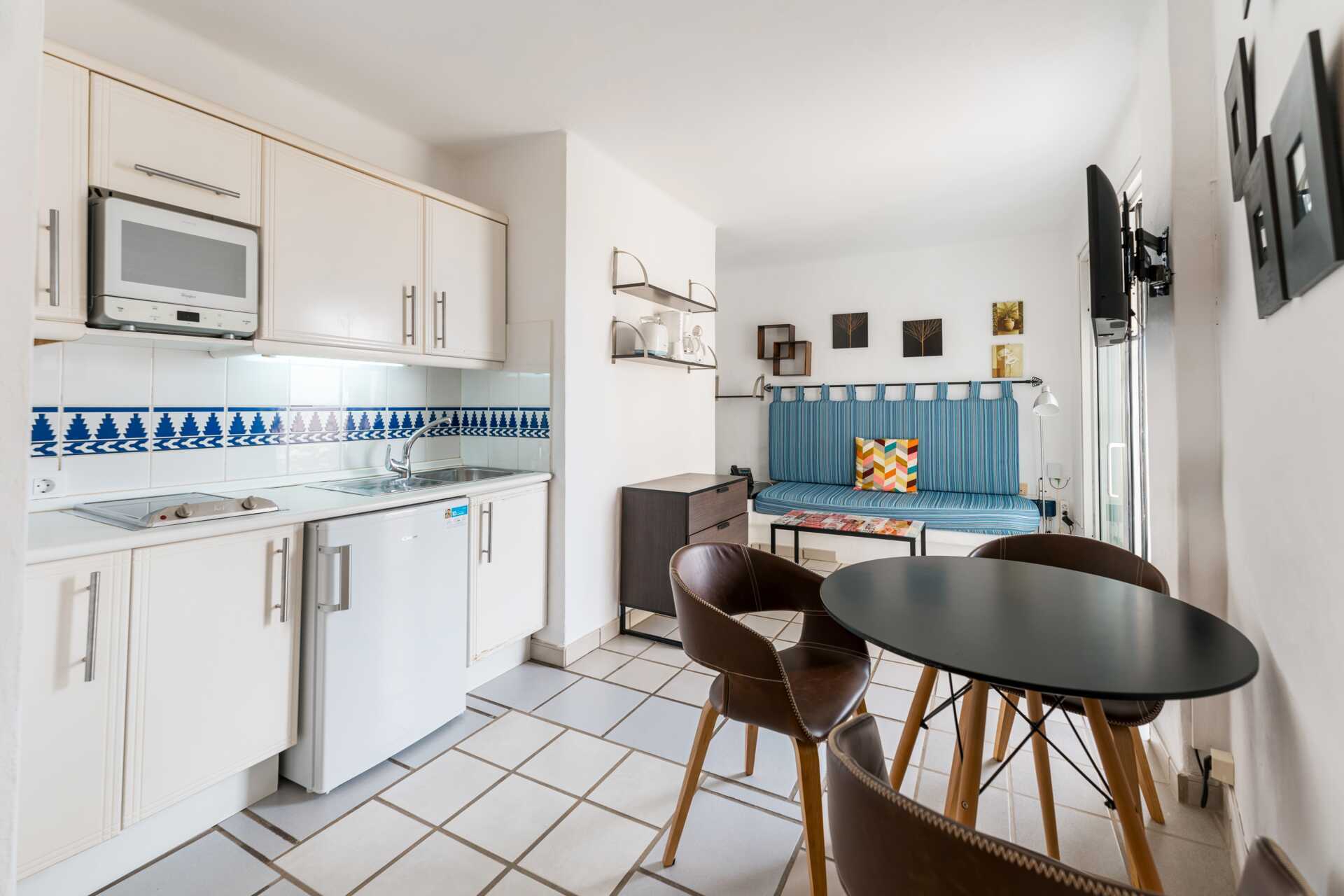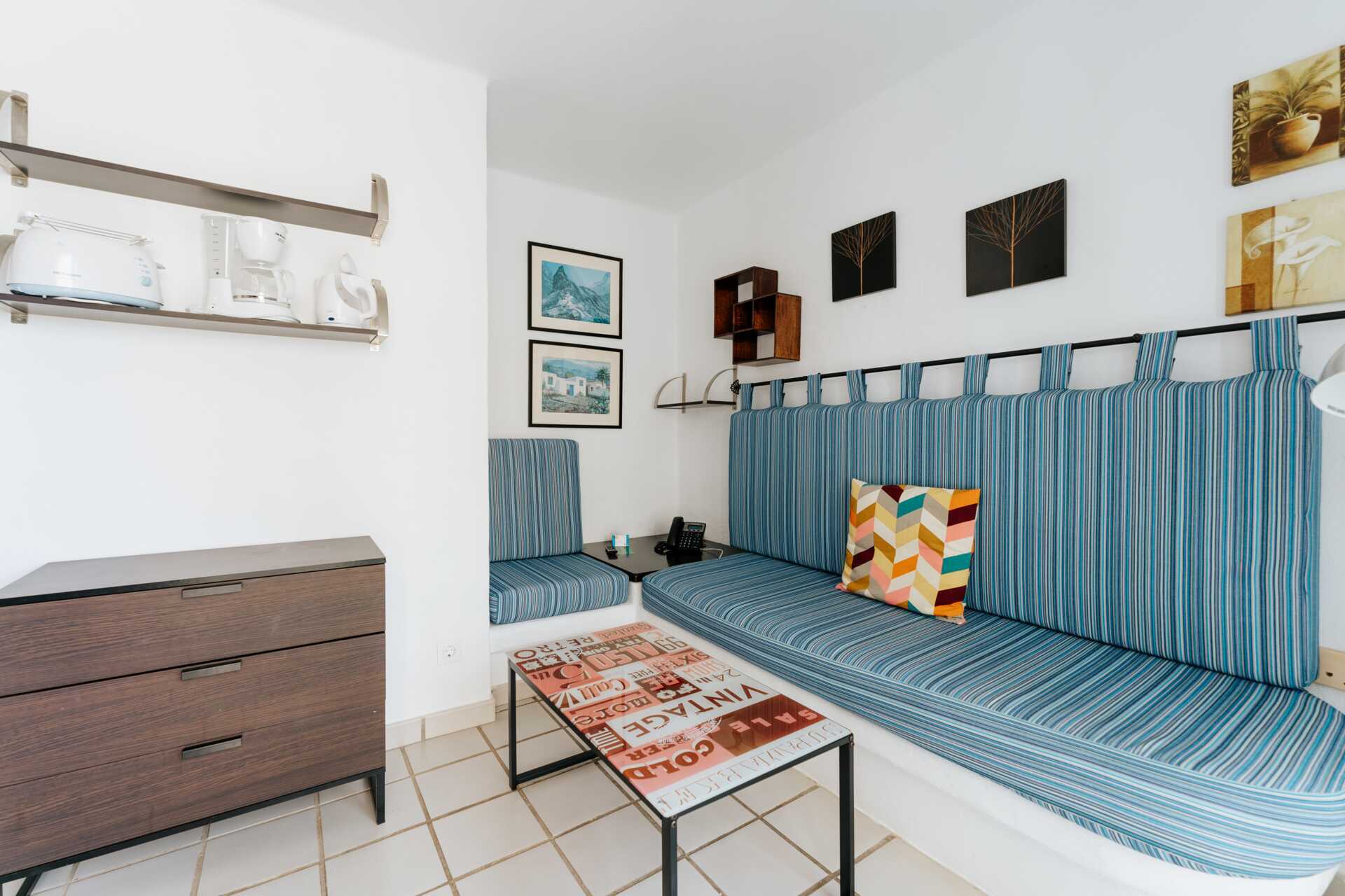 Renoveret 2-værelses lejlighed med terrasse eller balkon, nogle med havudsigt. Soveværelse og kombineret opholdsrum med minikøkken. Planløsningen og størrelsen på både lejligheden og udepladsen varierer. To enkeltsenge. Mulighed for ekstra opredning i sovesofa. Minikøkken med kogeplader, køleskab, brødrister, kaffemaskine, el-kedel, sandwichgrill og enkelt køkkenudstyr. Gratis wifi. Deponering mod betaling. Tv med internationale kanaler. Hårtørrer. Badeværelse med bruser og toilet. Rengøring 5 gange om ugen.