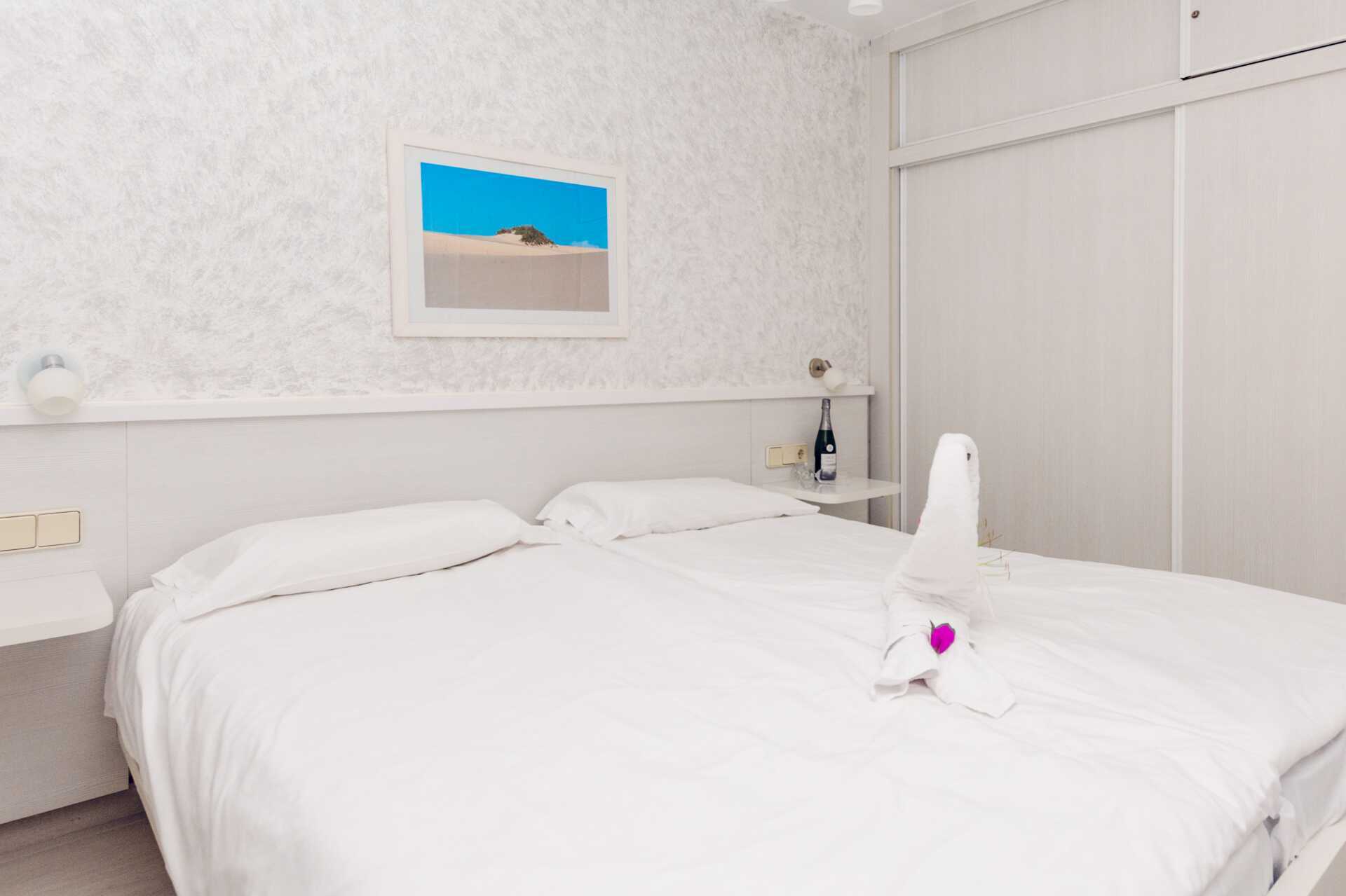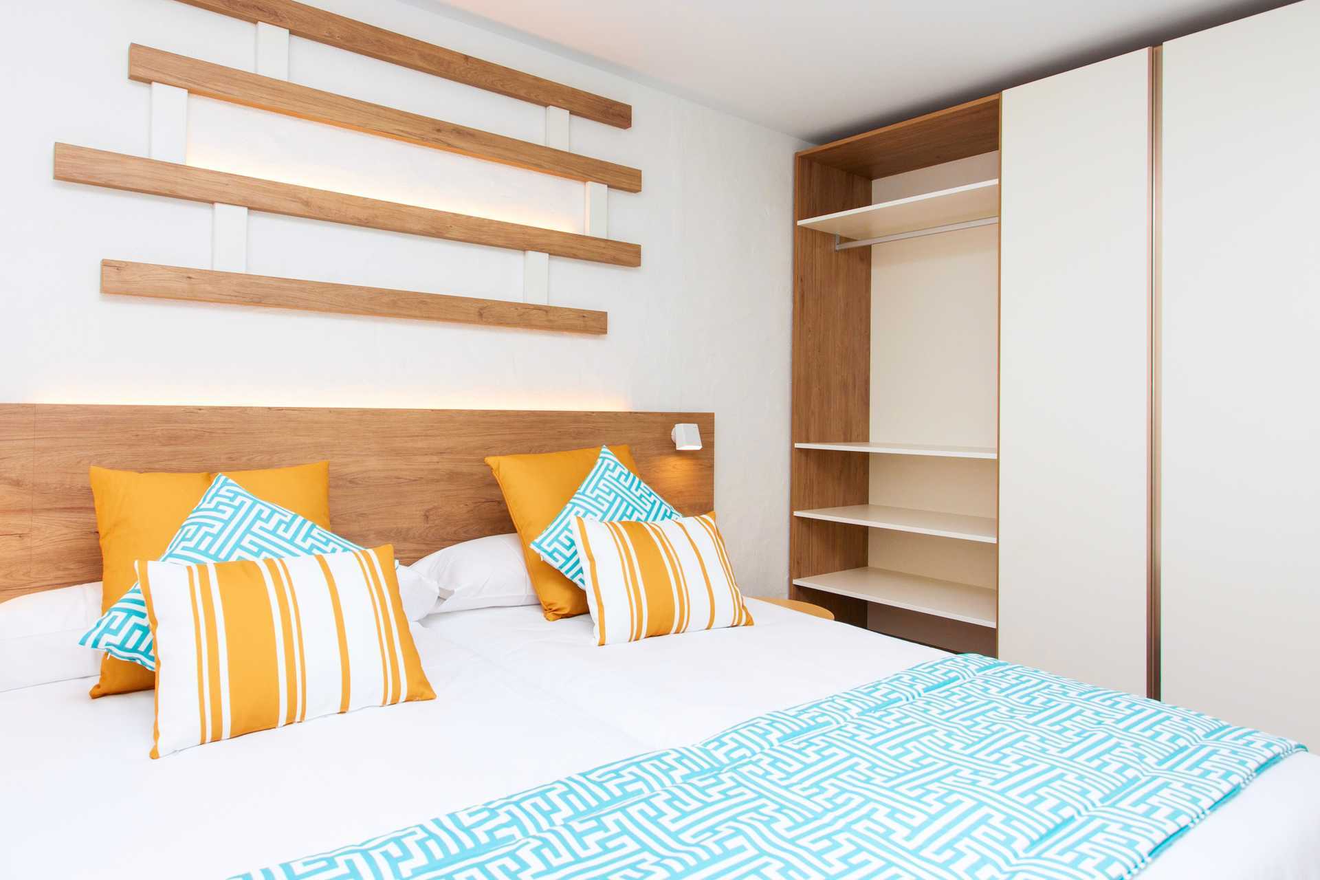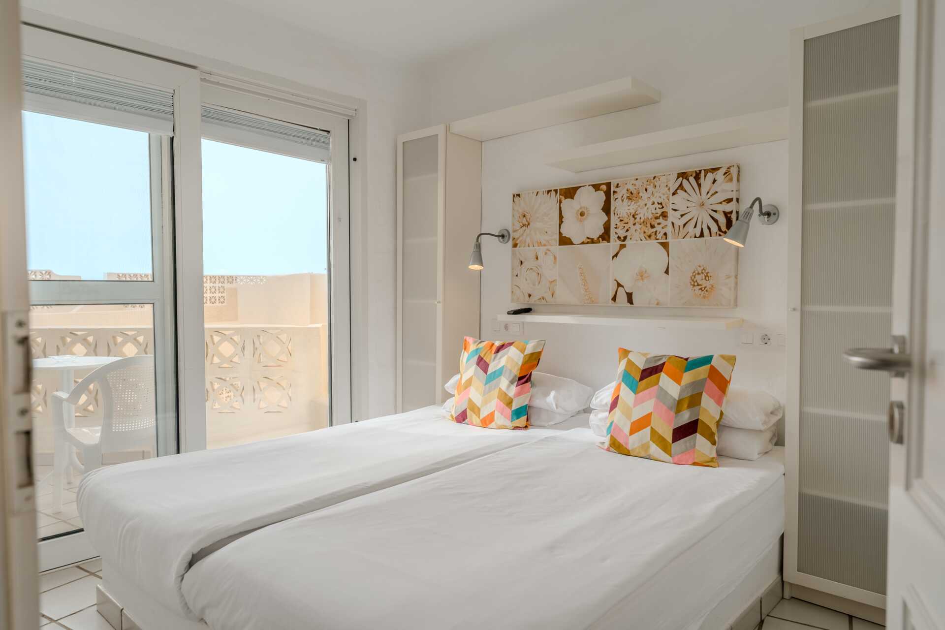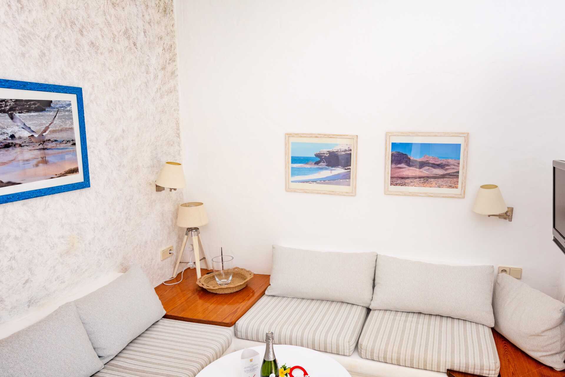 Renoveret 2-værelses lejlighed med terrasse eller balkon, nogle med havudsigt. Soveværelse og kombineret opholdsrum med minikøkken. Planløsningen og størrelsen på både lejligheden og udepladsen varierer. To enkeltsenge. Mulighed for ekstra opredning i sovesofa. Minikøkken med kogeplader, køleskab, brødrister, kaffemaskine, el-kedel, sandwichgrill og enkelt køkkenudstyr. Gratis wifi. Deponering mod betaling. Tv med internationale kanaler. Hårtørrer. Badeværelse med bruser og toilet. Rengøring 5 gange om ugen.