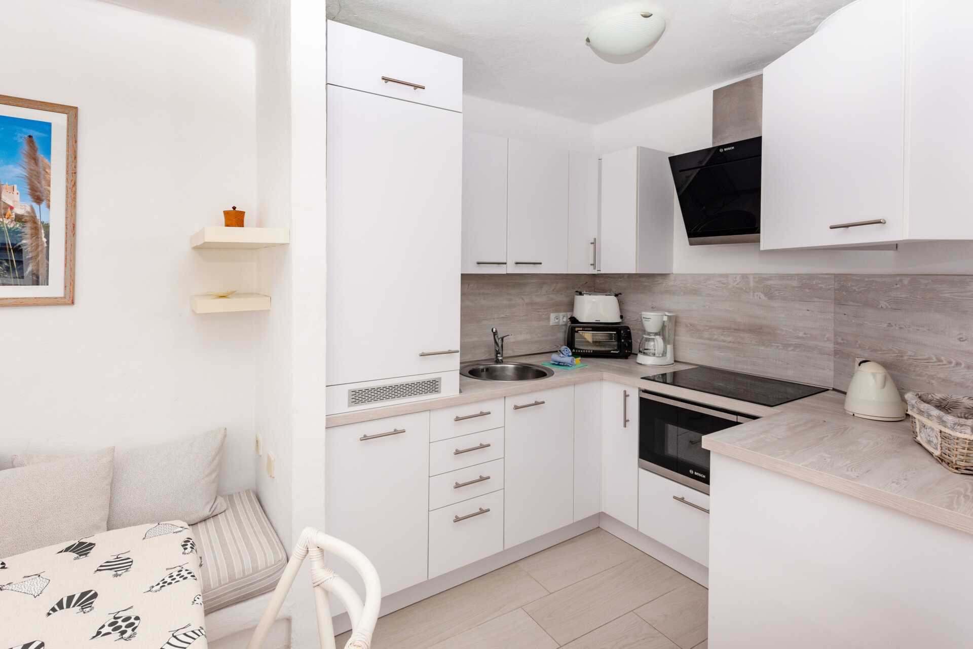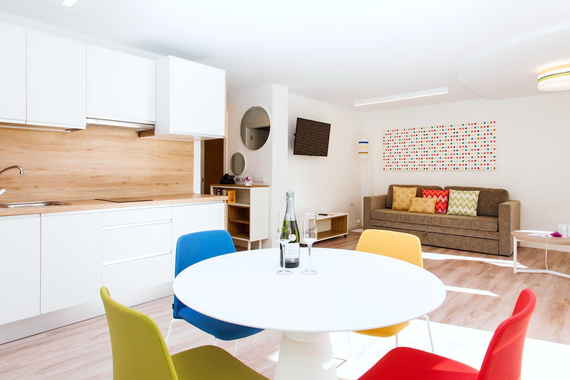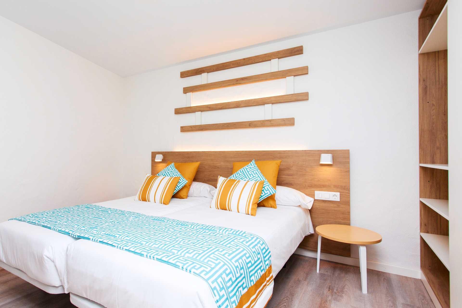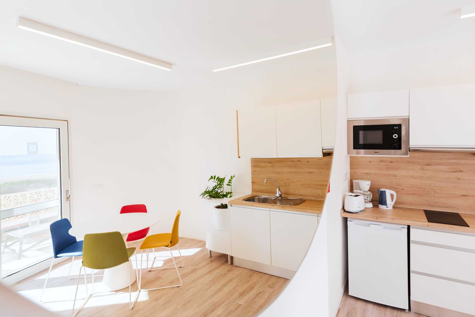 Renoveret 2-værelses lejlighed med terrasse eller balkon, nogle med havudsigt. Soveværelse og kombineret opholdsrum med minikøkken. Planløsningen og størrelsen på både lejligheden og udepladsen varierer. To enkeltsenge. Mulighed for ekstra opredning i sovesofa. Minikøkken med kogeplader, køleskab, brødrister, kaffemaskine, el-kedel, sandwichgrill og enkelt køkkenudstyr. Gratis wifi. Deponering mod betaling. Tv med internationale kanaler. Hårtørrer. Badeværelse med bruser og toilet. Rengøring 5 gange om ugen.