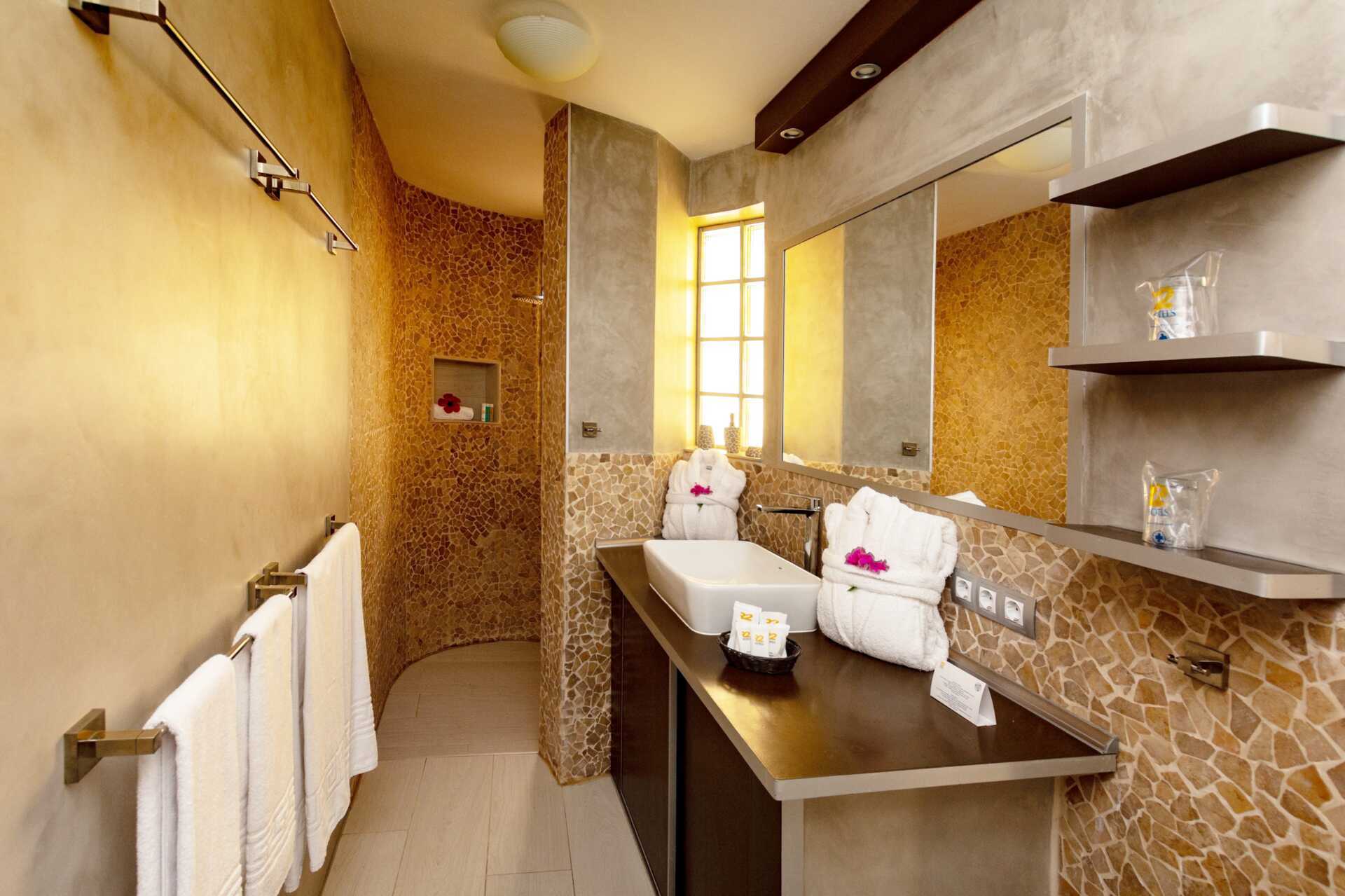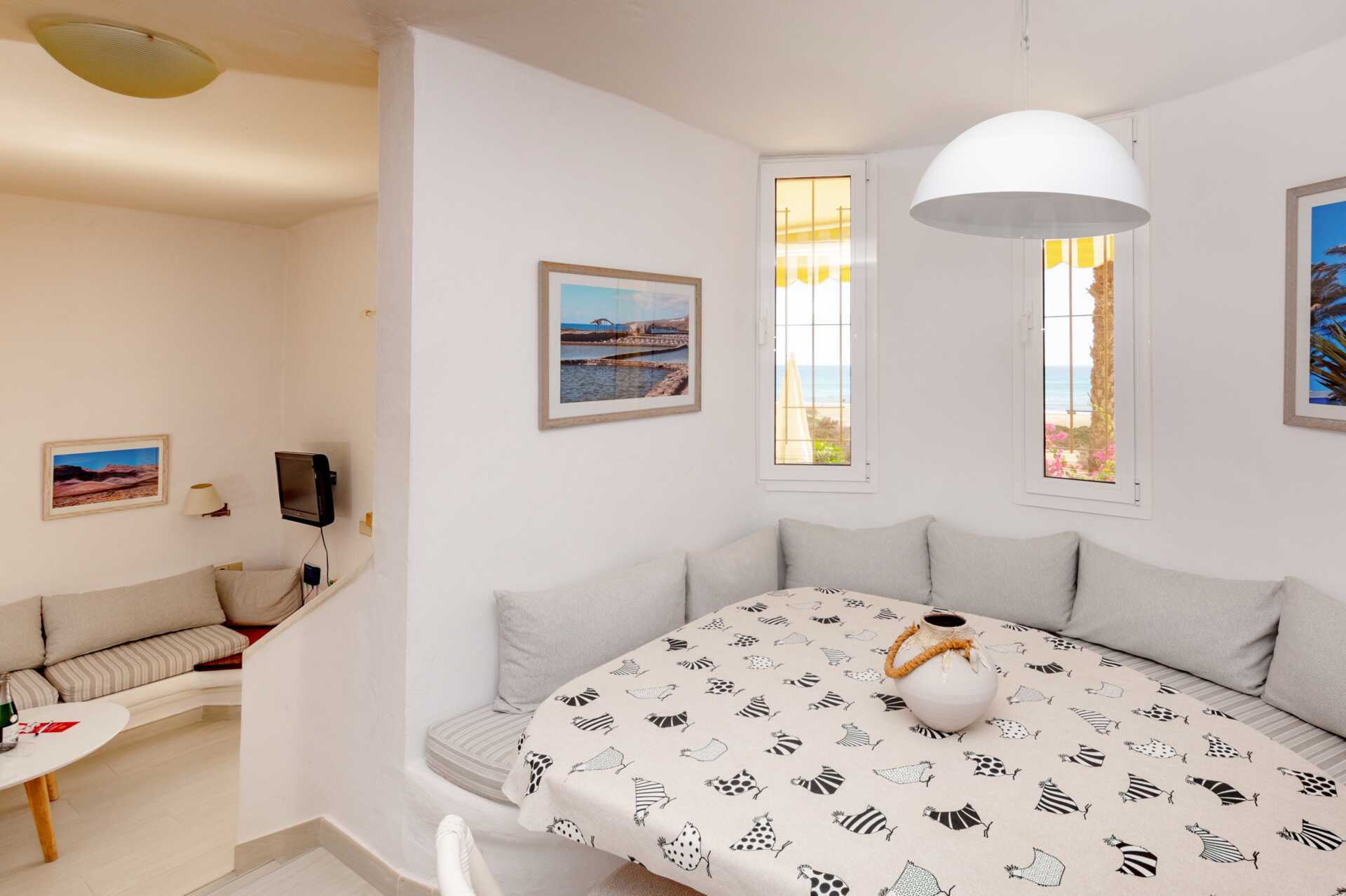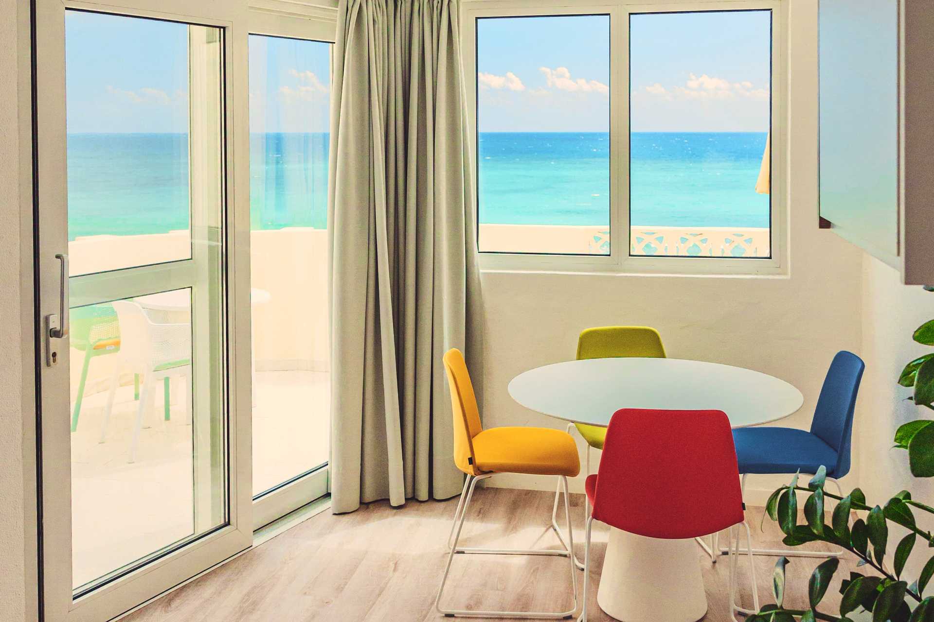 Renoverede 3-værelses lejligheder med terrasse eller balkon og havudsigt. To soveværelser og kombineret opholdsrum med minikøkken. Der er trappetrin i lejligheden. Plantegning og størrelse på både lejlighed og terrasse varierer. To enkeltsenge i hvert soveværelse. Mulighed for ekstra opredning i sovesofa, enkeltseng og en seng ovenpå som er en køjeseng (stige til rådighed). Minikøkken med kogeplader, køleskab, brødrister, kaffemaskine, el-kedel, sandwichgrill og enkelt køkkenudstyr. Gratis wifi. Deponering mod betaling. Tv med internationale kanaler. Hårtørrer. Badeværelse med bruser og toilet. Rengøring 5 gange om ugen.