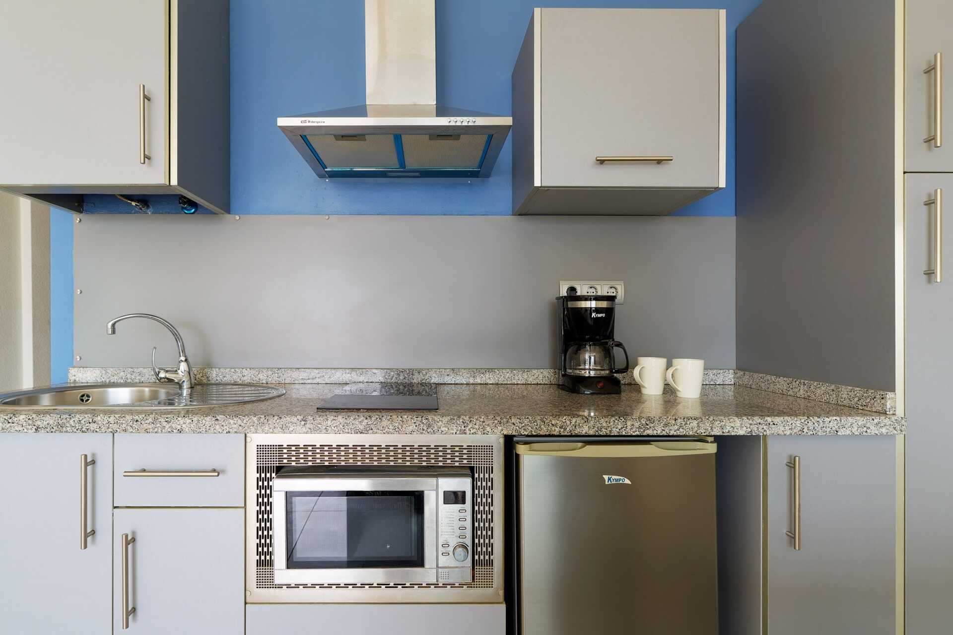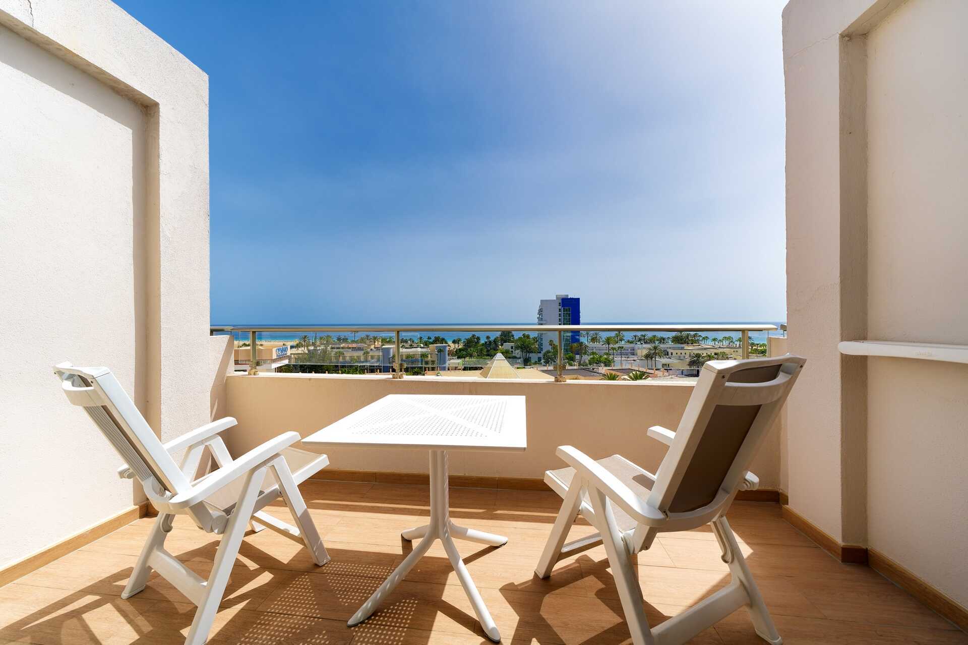 2-værelses lejlighed på øverste etager med balkon og havudsigt. Lejlighederne ligger på 6. etage. Soveværelse og kombineret opholdsrum/minikøkken. To enkeltsenge. Mulighed for ekstra opredning i sovesofa. Gratis wifi. Deponering mod betaling. Minikøkken med kogeplader, køleskab, kaffemaskine og enkelt køkkenudstyr. Spiseplads ved bardisken. Tv med internationale kanaler. Badeværelse med bruser og toilet. Rengøring 2 gange om ugen.
