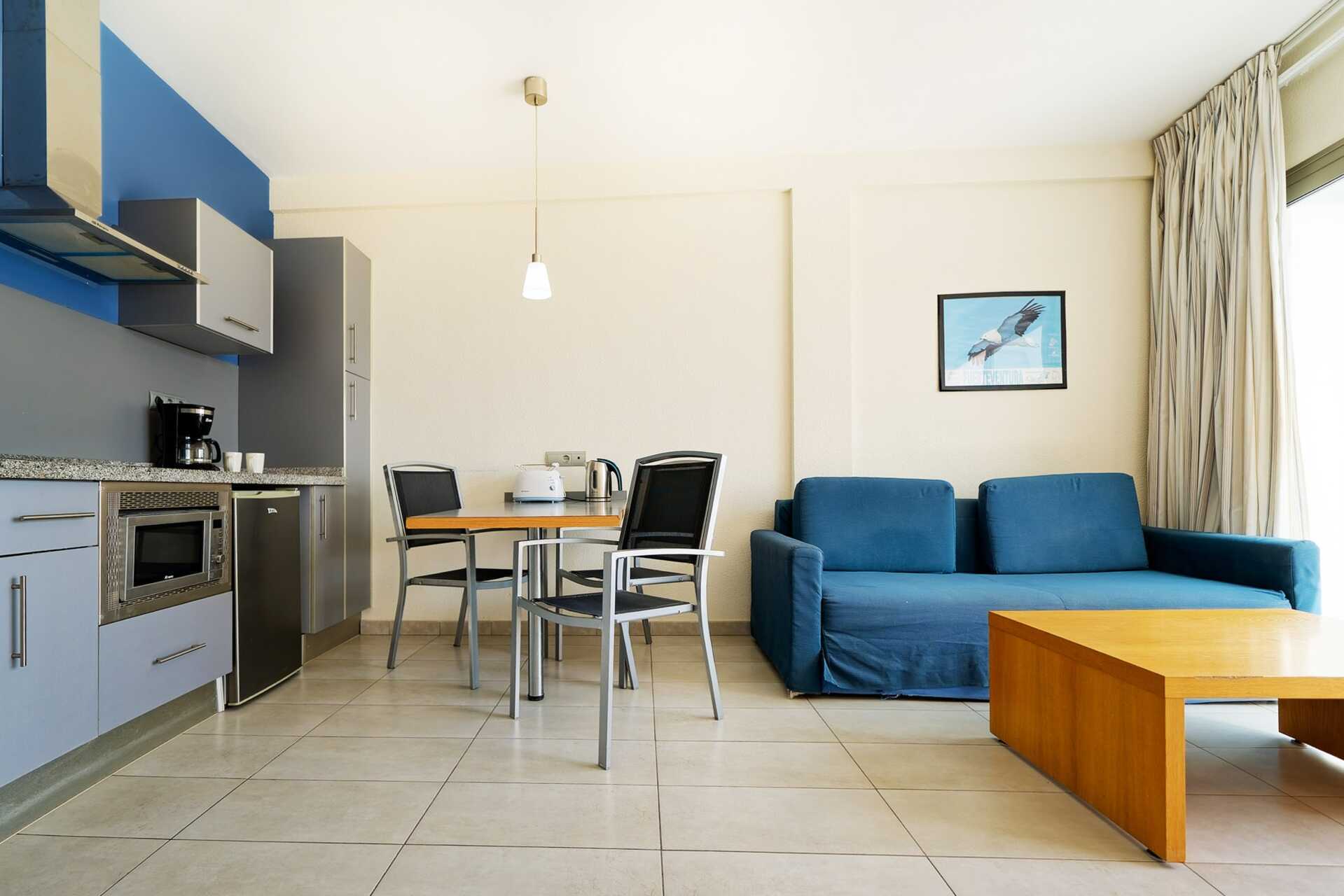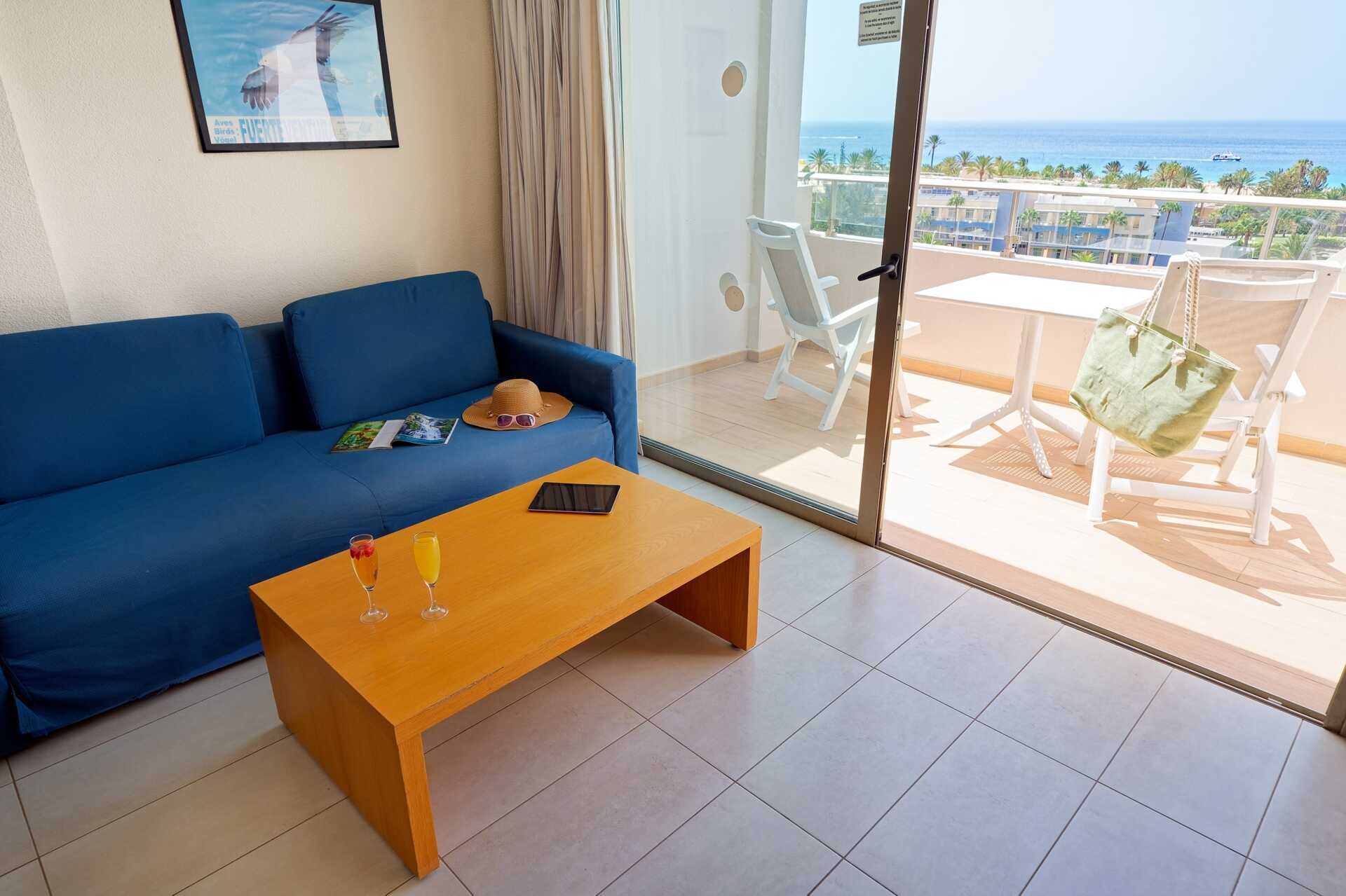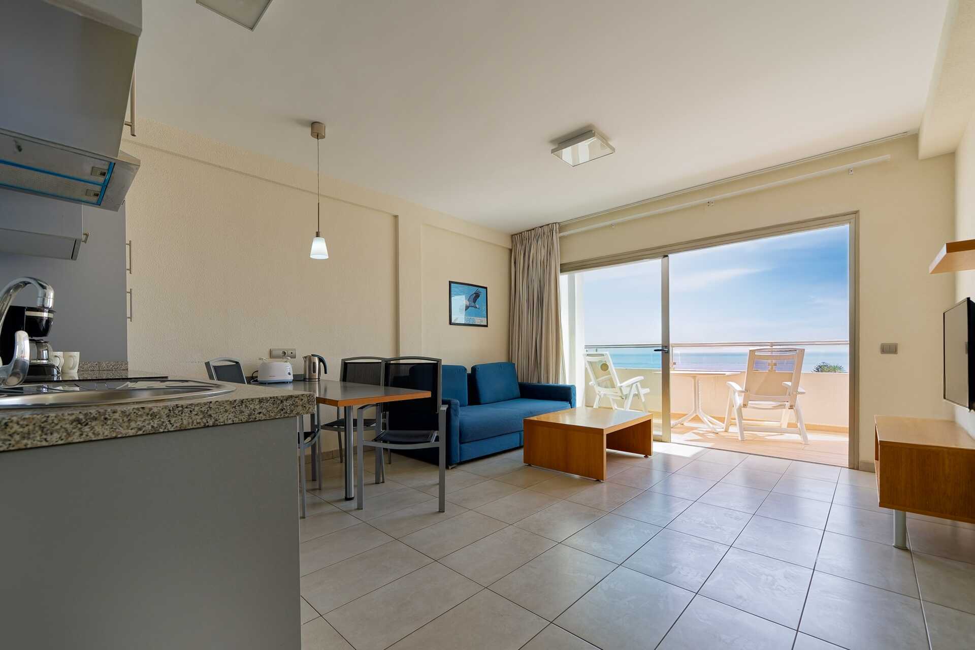 2-værelses lejlighed superior med balkon, nogle med havudsigt. Lejlighederne med havudsigt ligger højere oppe på hotellet. Soveværelse og kombineret opholdsrum/minikøkken. To enkeltsenge. Mulighed for ekstra opredning i sovesofa. Gratis wifi. Deponering mod betaling. Minikøkken med kogeplader, køleskab, kaffebrygger, mikroovn og enkelt køkkenudstyr. Tv med internationale kanaler. Badeværelse med bruser og toilet. Rengøring 2 gange om ugen.