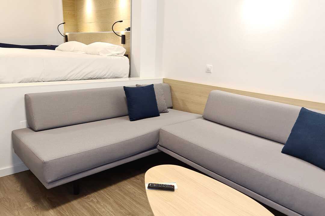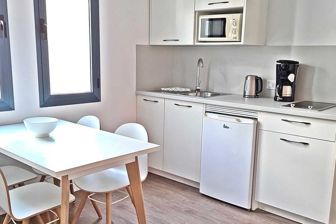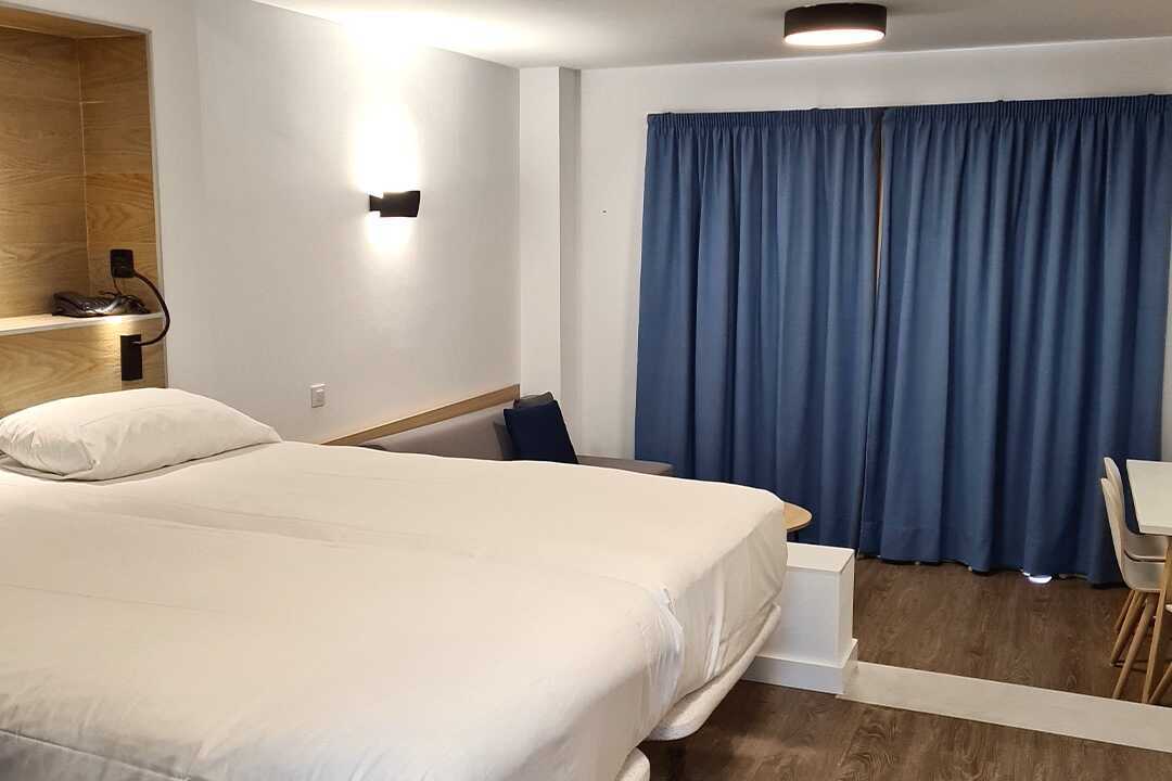 2-værelses lejlighed med balkon eller terrasse, nogle med havudsigt eller delvis havudsigt. Lejlighederne blev renoveret i 2022. En dobbeltseng eller to enkeltsenge. Mulighed for ekstra opredning i fold ud-seng. Soveværelse og kombineret opholdsrum/minikøkken. Minikøkken med kogeplader, køleskab, mikrobølgeovn, kaffemaskine, el-kedel og enkelt-køkkenudstyr. Gratis wifi, deponering og aircondition. Tv med internationale kanaler. Mulighed for leje af badekåber. Hårtørrer. Badeværelse med bruser og toilet. Rengøring 5 gange om ugen.