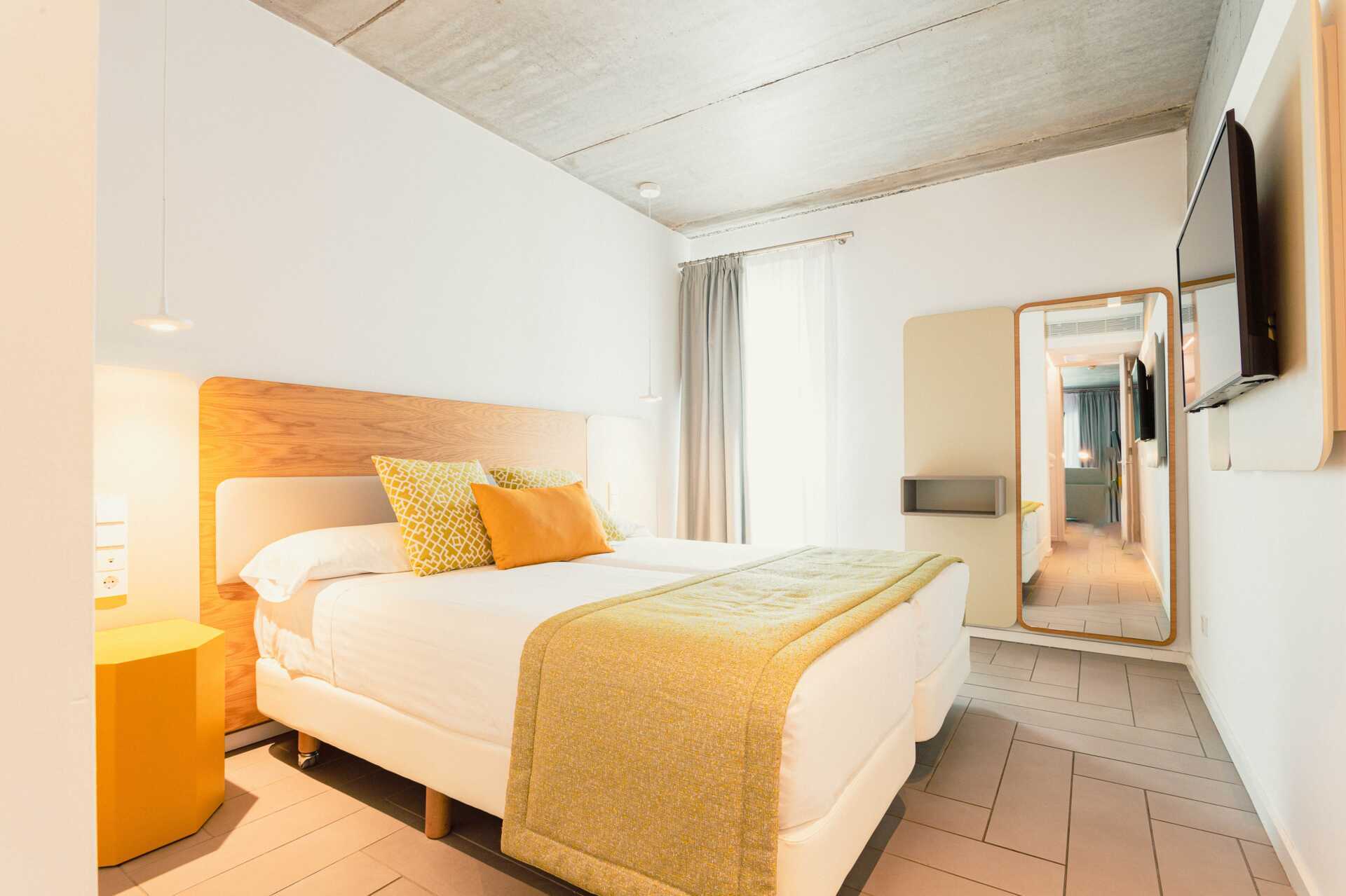 3-værelses lejlighed i etage med terrasse i stueplan. Nogle lejligheder har terrasse i stueplan med bord, stole og solstole og nogle lejligheder har terrasse i stueplan med bord og stole og en tagterrasse med solstole. Lejlighederne kan ligge i hovedbygningen eller i en separat bygning. To soveværelser og et kombineret opholdsrum med minikøkken. I stueetagen er der et soveværelse med to enkeltsenge. Mulighed for ekstra opredninger i sovesofaer og minikøkken med køleskab, fryser, mikroovn, keramisk kogeplade, opvaskemaskine, brødrister, kaffemaskine, el-kedel, saftpresser, æggekoger og enkelt køkkenudstyr. Vaskemaskine og tørretumbler samt et badeværelse med hårtørrer, bruser og toilet. Ovenpå eller nedenunder - alt efter hvor på hotellet lejlighederne ligger, er der soveværelse med to enkeltsenge og badeværelse med hårtørrer, bruser og toilet. Gratis wifi, aircondition og deponering. Badekåber og poolhåndklæder. Rengøring 7 gange om ugen.