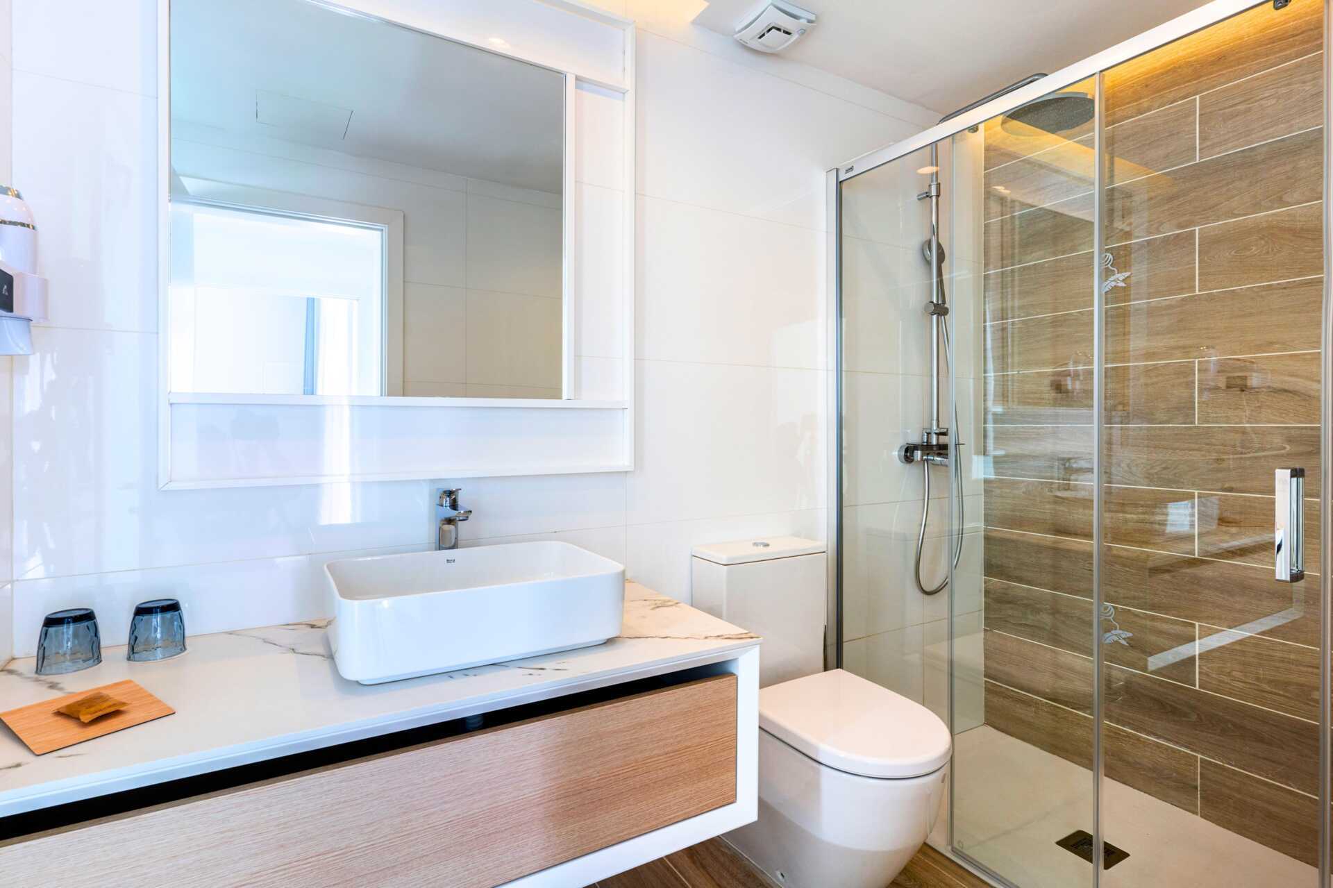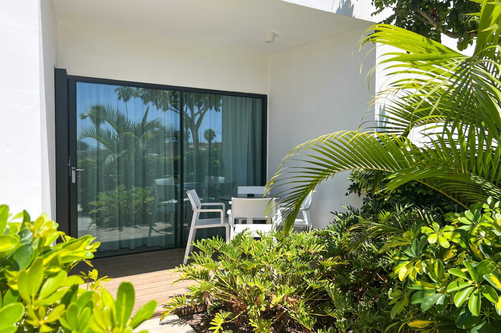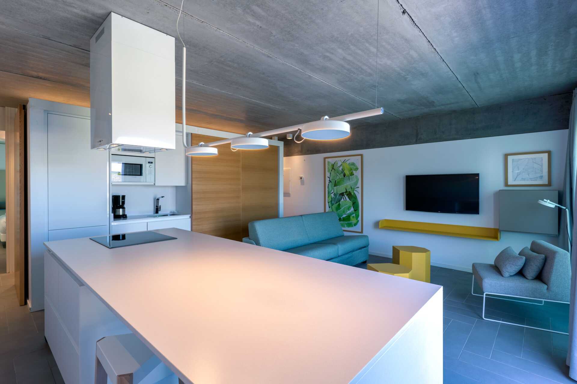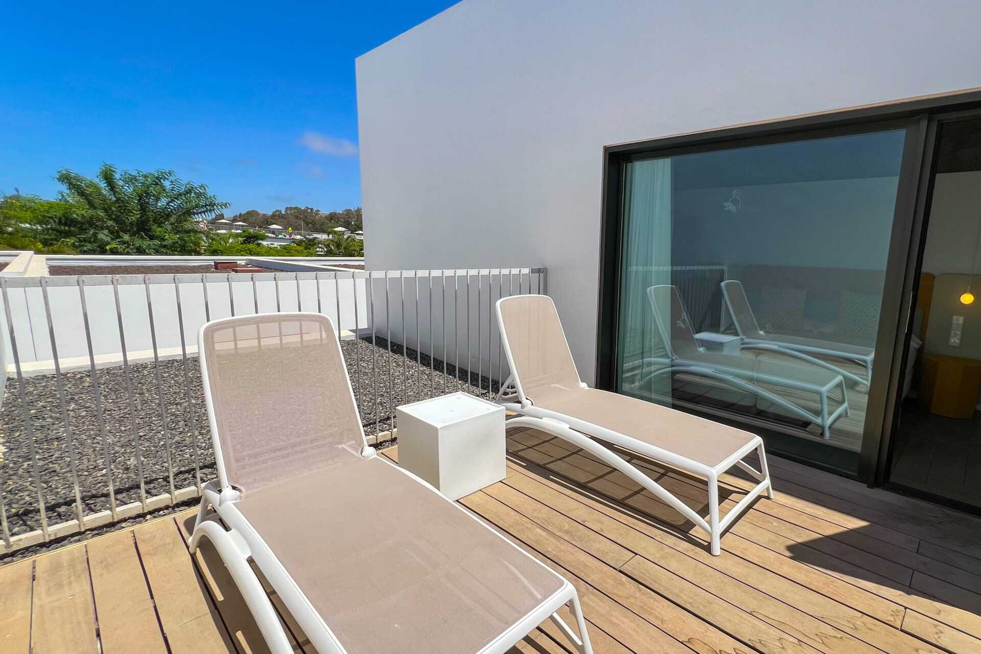 4-værelses lejlighed med havudsigt, privat pool på terrasse i stueplan og med den bedste beliggenhed inden for hotellet - tæt på havet. Poolen er opvarmet til 22 grader om vinteren. Pooltemperaturen kan dog falde et par grader om morgenen, aftenen og i dårligt vejr. På terrassen er der loungesofaer, spiseplads og solstole. Et soveværelse og et kombineret opholdsrum med minikøkken. To enkeltsenge i hvert soveværelse. Mulighed for ekstra opredning i sovesofa. Minikøkken med køleskab, fryser, mikrobølgeovn, opvaskemaskine, brødrister, kaffemaskine, el-kedel, æggekoger og enkelt køkkenudstyr. Gratis wifi, aircondition og deponering. Tv med internationale kanaler. Badekåber. Poolhåndklæder. Hårtørrer. To badeværelser med bruser og toilet, hvoraf det ene har badekar. Rengøring 7 gange om ugen.