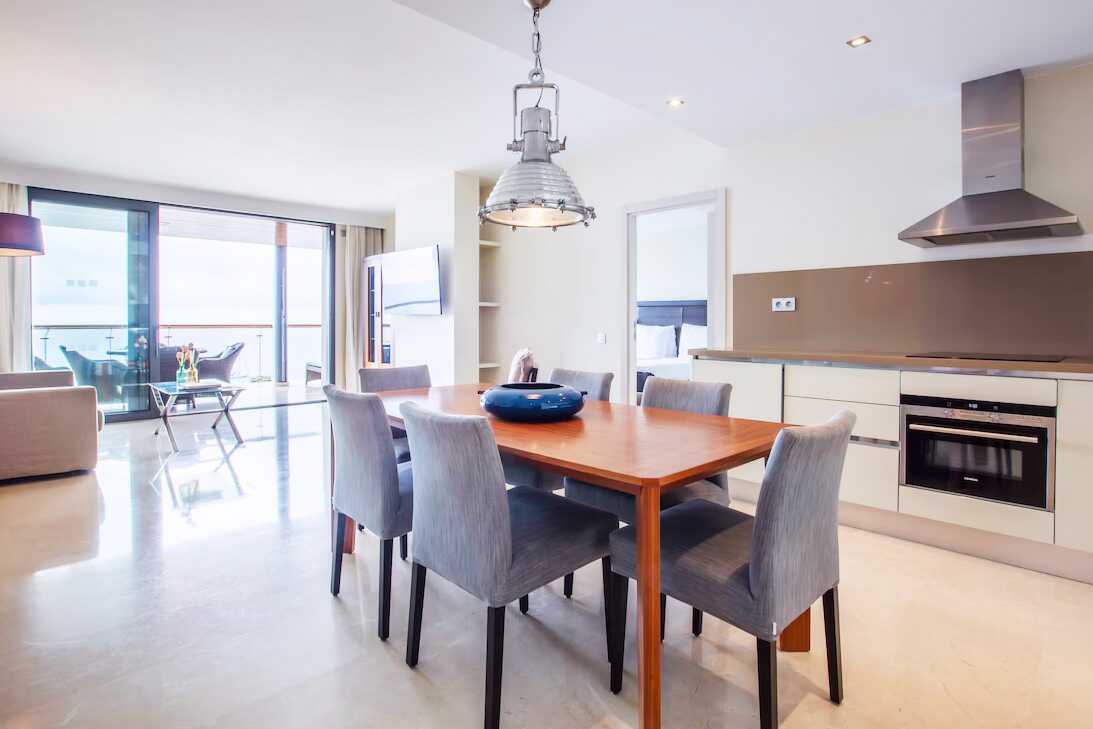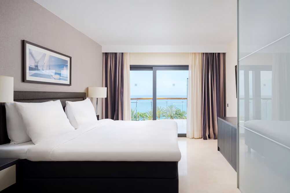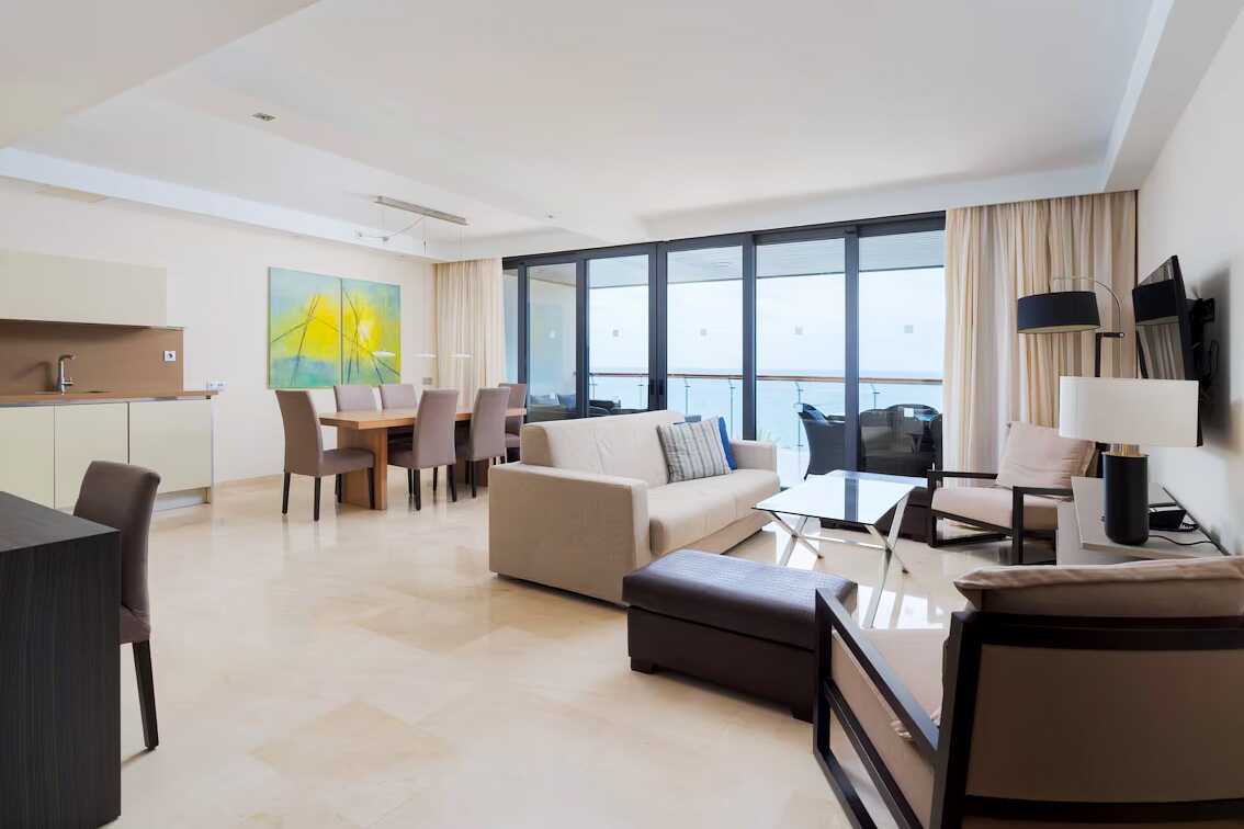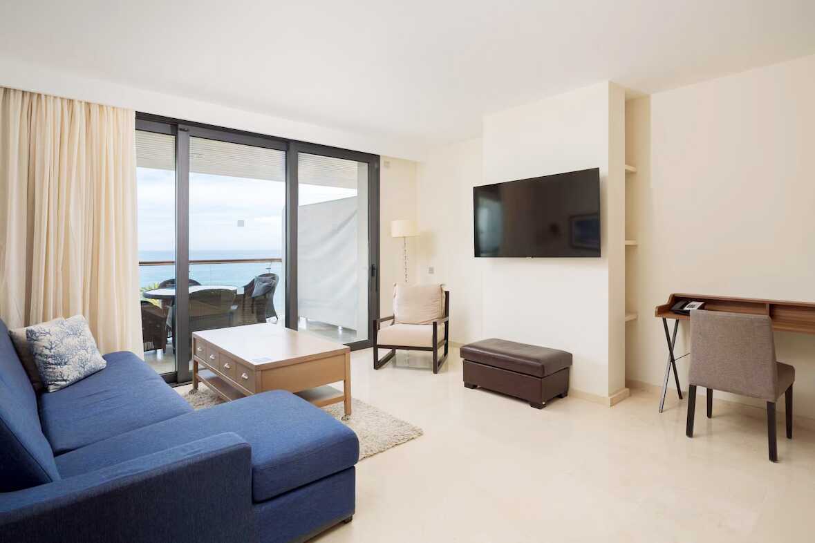 3-værelses lejlighed med balkon og havudsigt. To soveværelser og kombineret opholdsrum med minikøkken. Begge soveværelser har en dobbeltseng eller to enkeltsenge. Mulighed for ekstra opredninger i sovesofa. Minikøkken med køleskab og fryser, kogeplader og ovn, mikrobølgeovn, Nespresso-kaffemaskine, brødrister og enkelt køkkenudstyr samt opvaskemaskine. Gratis wifi, aircondition og deponering. El-kedel og kaffe/te. Tv med internationale kanaler. Strygejern og strygebræt. Badekåbe og tøfler til voksne. Hårtørrer. To badeværelser med badekar eller bruser samt toilet. Rengøring 7 gange om ugen.