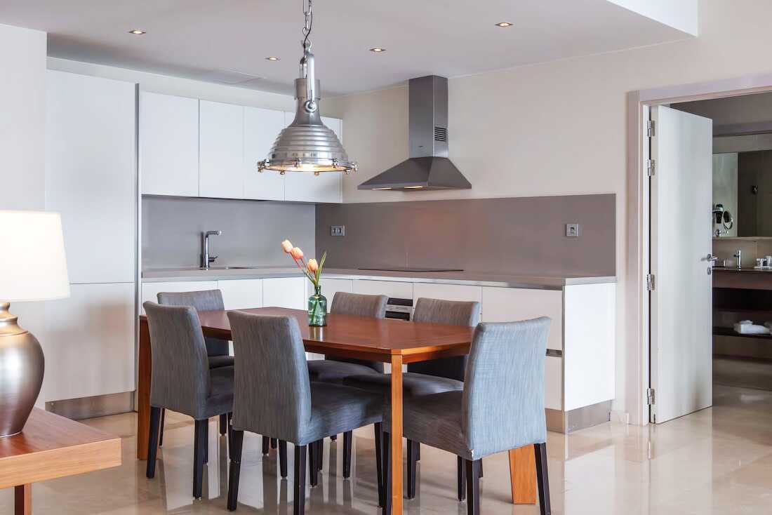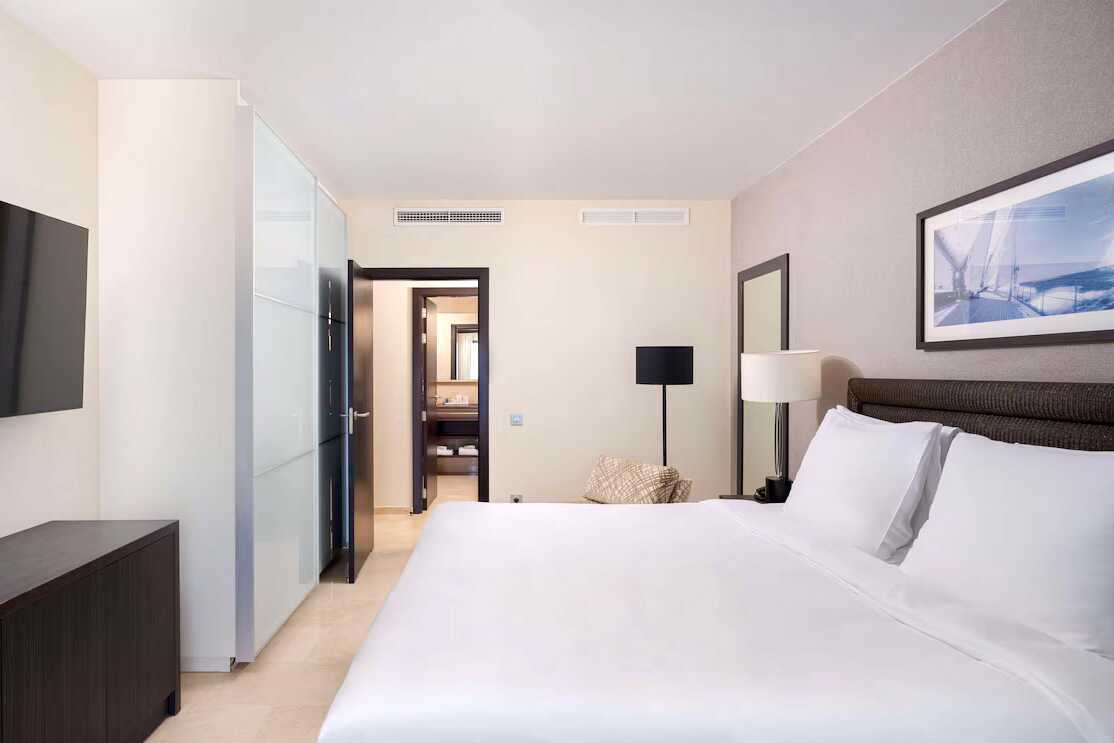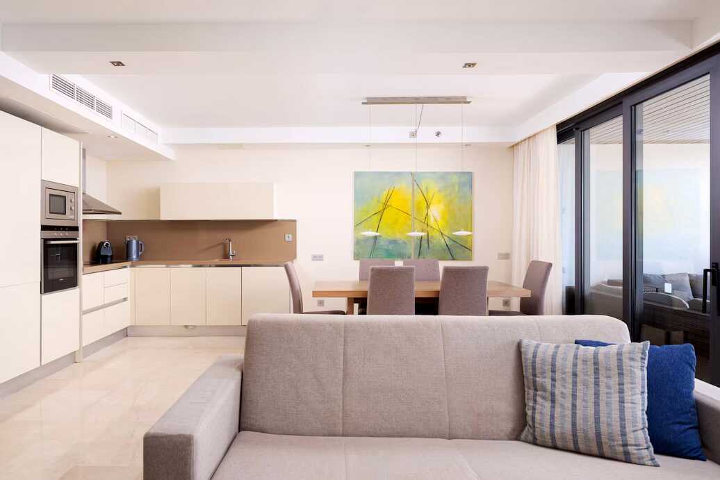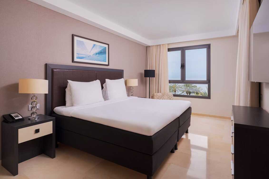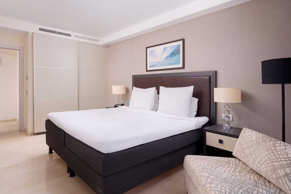 3-værelses lejlighed med balkon og havudsigt. To soveværelser og kombineret opholdsrum med minikøkken. Begge soveværelser har en dobbeltseng eller to enkeltsenge. Mulighed for ekstra opredninger i sovesofa. Minikøkken med køleskab og fryser, kogeplader og ovn, mikrobølgeovn, Nespresso-kaffemaskine, brødrister og enkelt køkkenudstyr samt opvaskemaskine. Gratis wifi, aircondition og deponering. El-kedel og kaffe/te. Tv med internationale kanaler. Strygejern og strygebræt. Badekåbe og tøfler til voksne. Hårtørrer. To badeværelser med badekar eller bruser samt toilet. Rengøring 7 gange om ugen.