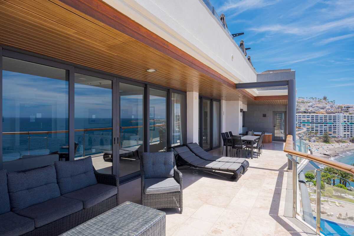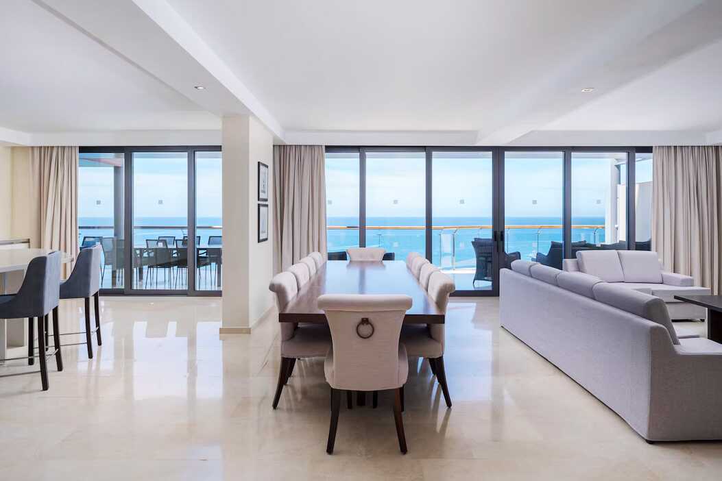 3-værelses lejlighed superior med balkon og havudsigt. To soveværelser og kombineret opholdsrum/minikøkken. Begge soveværelser har en dobbeltseng eller to enkeltsenge. Mulighed for ekstra opredninger i sovesofa. Minikøkken med køleskab og fryser, kogeplader og ovn, mikrobølgeovn, Nespresso-kaffemaskine, brødrister og enkelt køkkenudstyr samt opvaskemaskine. Gratis wifi, aircondition og deponering. El-kedel og kaffe/te. Tv med internationale kanaler. Strygejern og strygebræt. Badekåbe og tøfler til voksne. Hårtørrer. To badeværelser med badekar eller bruser samt toilet. Rengøring 7 gange om ugen.