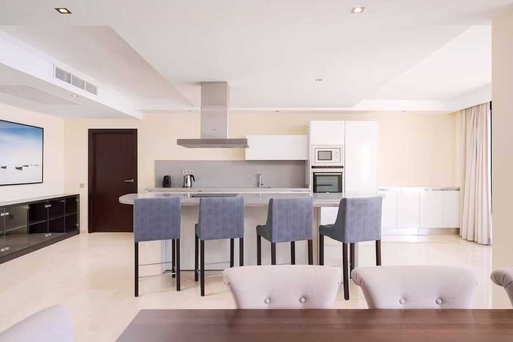 3-værelses lejlighed med balkon og havudsigt. To soveværelser og kombineret opholdsrum/minikøkken. Begge soveværelser har en dobbeltseng eller to enkeltsenge. Mulighed for ekstra opredninger i sovesofa. Minikøkken med køleskab og fryser, kogeplader og ovn, mikrobølgeovn, Nespresso-kaffemaskine, brødrister og enkelt køkkenudstyr samt opvaskemaskine. Gratis wifi, aircondition og deponering. El-kedel og kaffe/te. Tv med internationale kanaler. Strygejern og strygebræt. Badekåbe og tøfler til voksne. Hårtørrer. To badeværelser med badekar eller bruser samt toilet. Rengøring 7 gange om ugen.