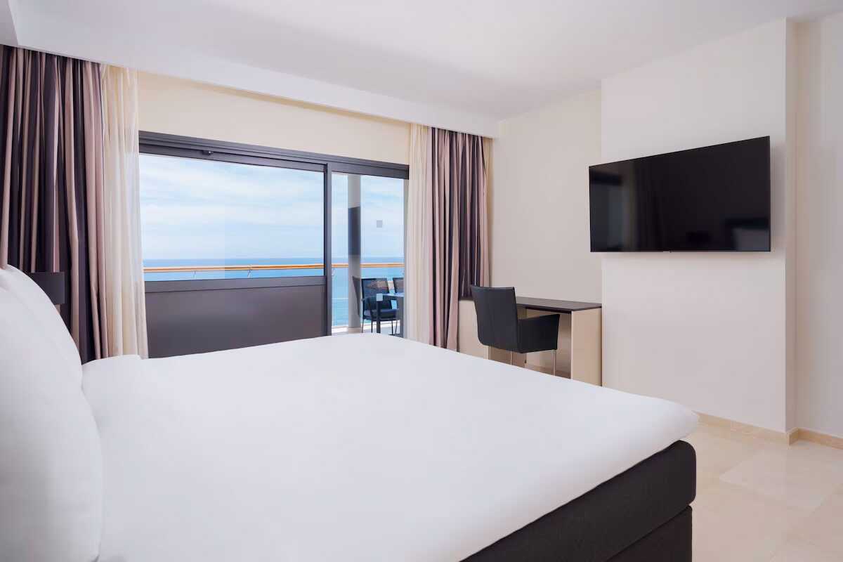 Dobbeltværelse med balkon og havudsigt. En dobbeltseng eller to enkeltsenge. Gratis wifi, aircondition og deponering. El-kedel og kaffe/te. Tv med internationale kanaler. Strygejern og strygebræt. Badekåbe og tøfler til voksne. Hårtørrer. Badeværelse med badekar eller bruser samt toilet. Rengøring 7 gange om ugen.