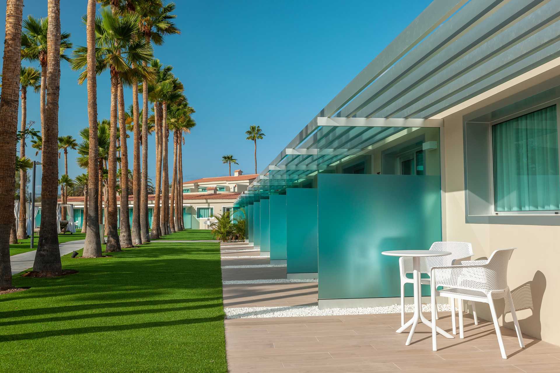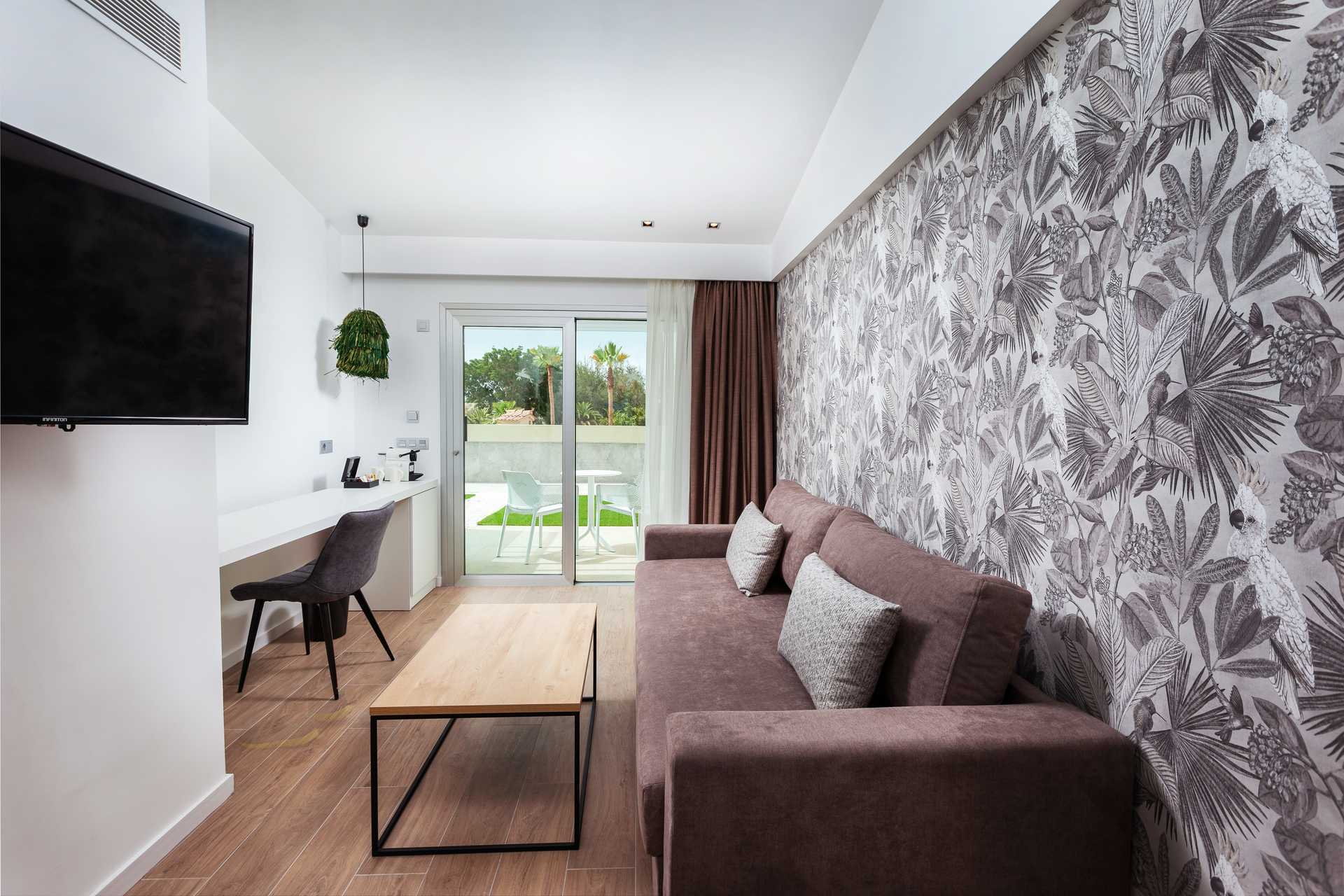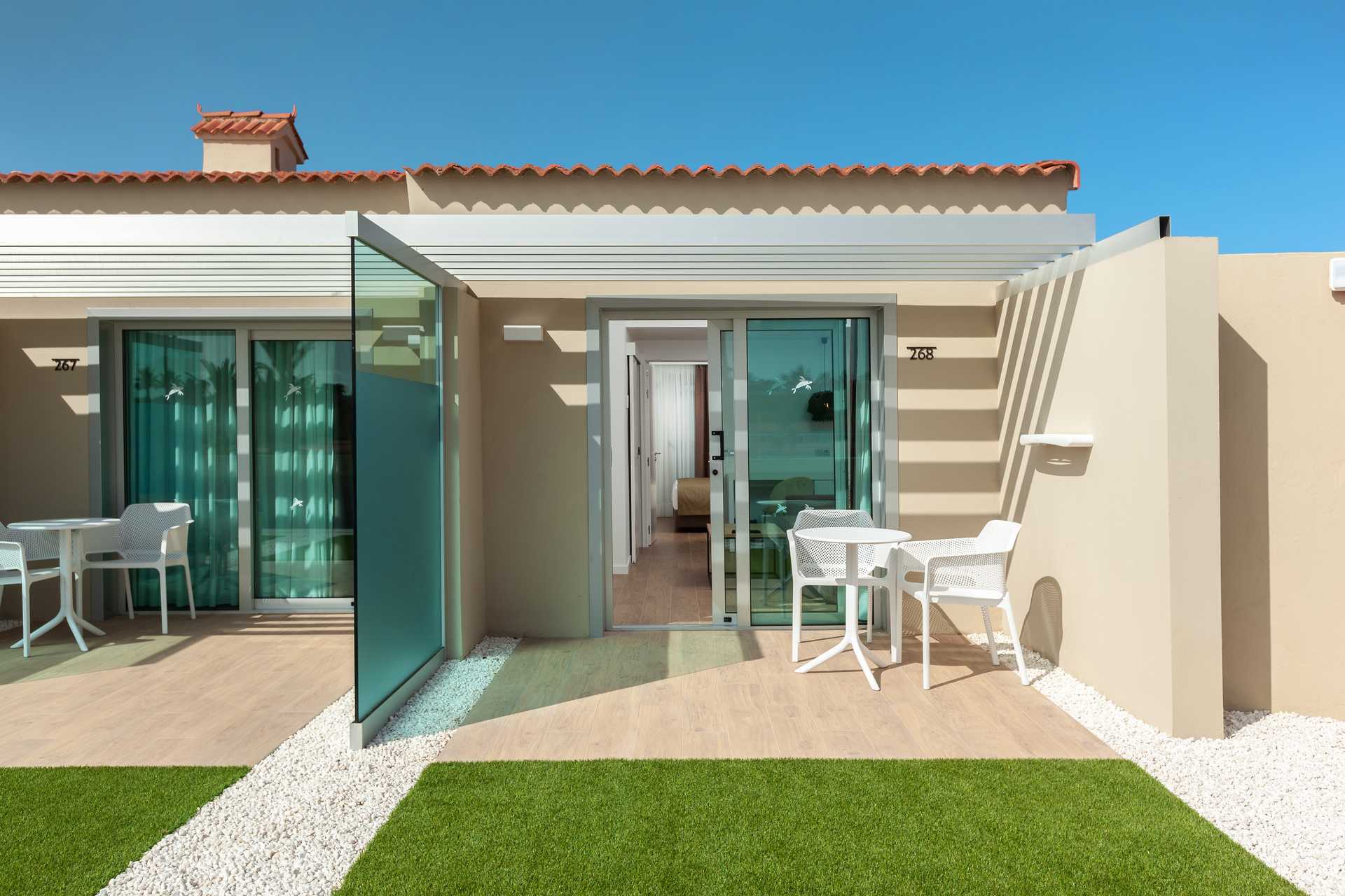 Suiter med stor terrasse med stole og bord og udsigt til poolen. Suiten består af et soveværelse og et opholdsrum. En dobbeltseng eller to enkeltsenge. Mulighed for ekstra opredning i sovesofa. Gratis wifi og aircondition. Deponering mod betaling. Minibar mod betaling. Nespresso kaffemaskine. Tv med internationale kanaler. Hårtørrer. Badeværelse med bruser og toilet. Rengøring 7 gange om ugen.