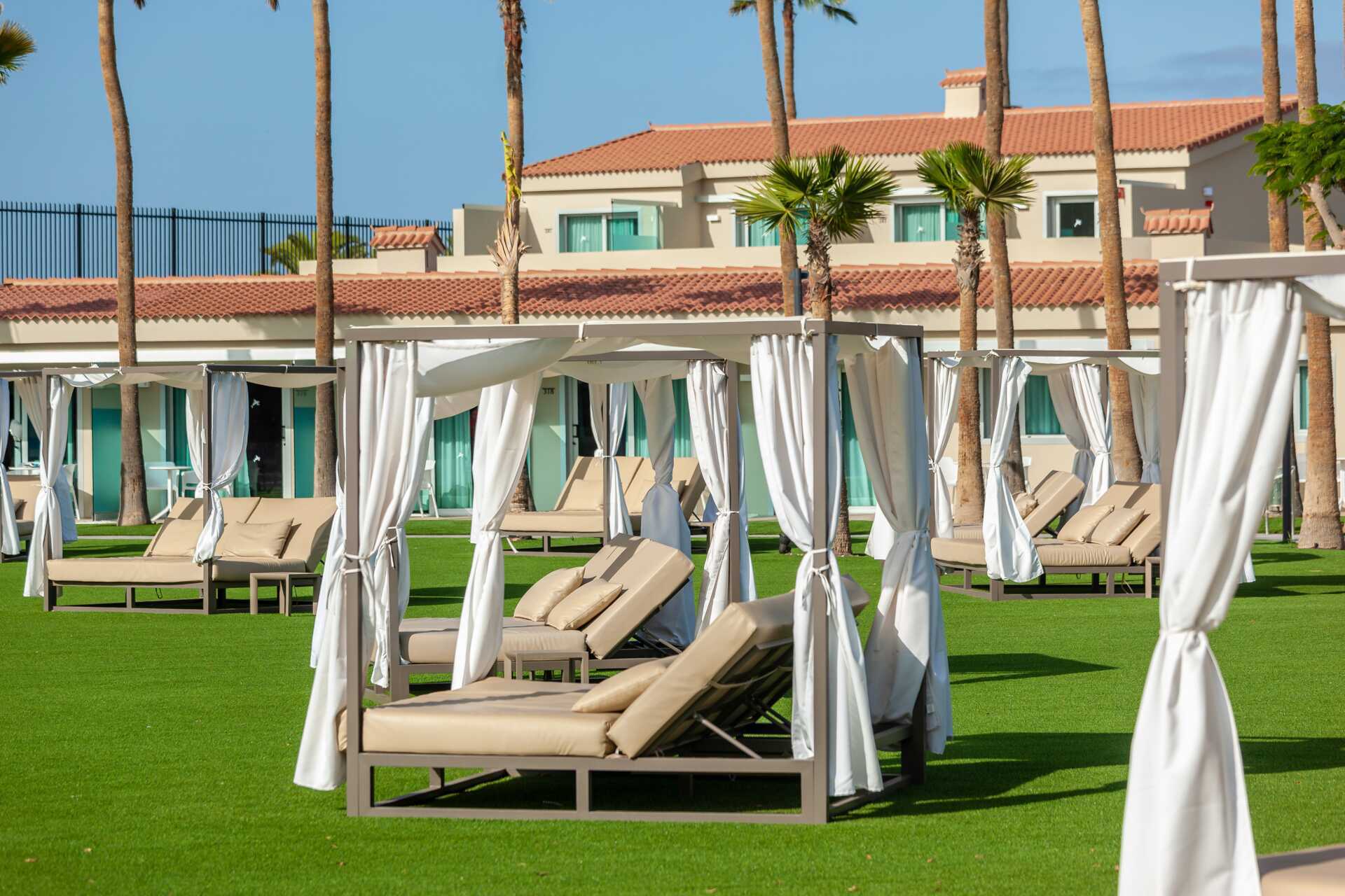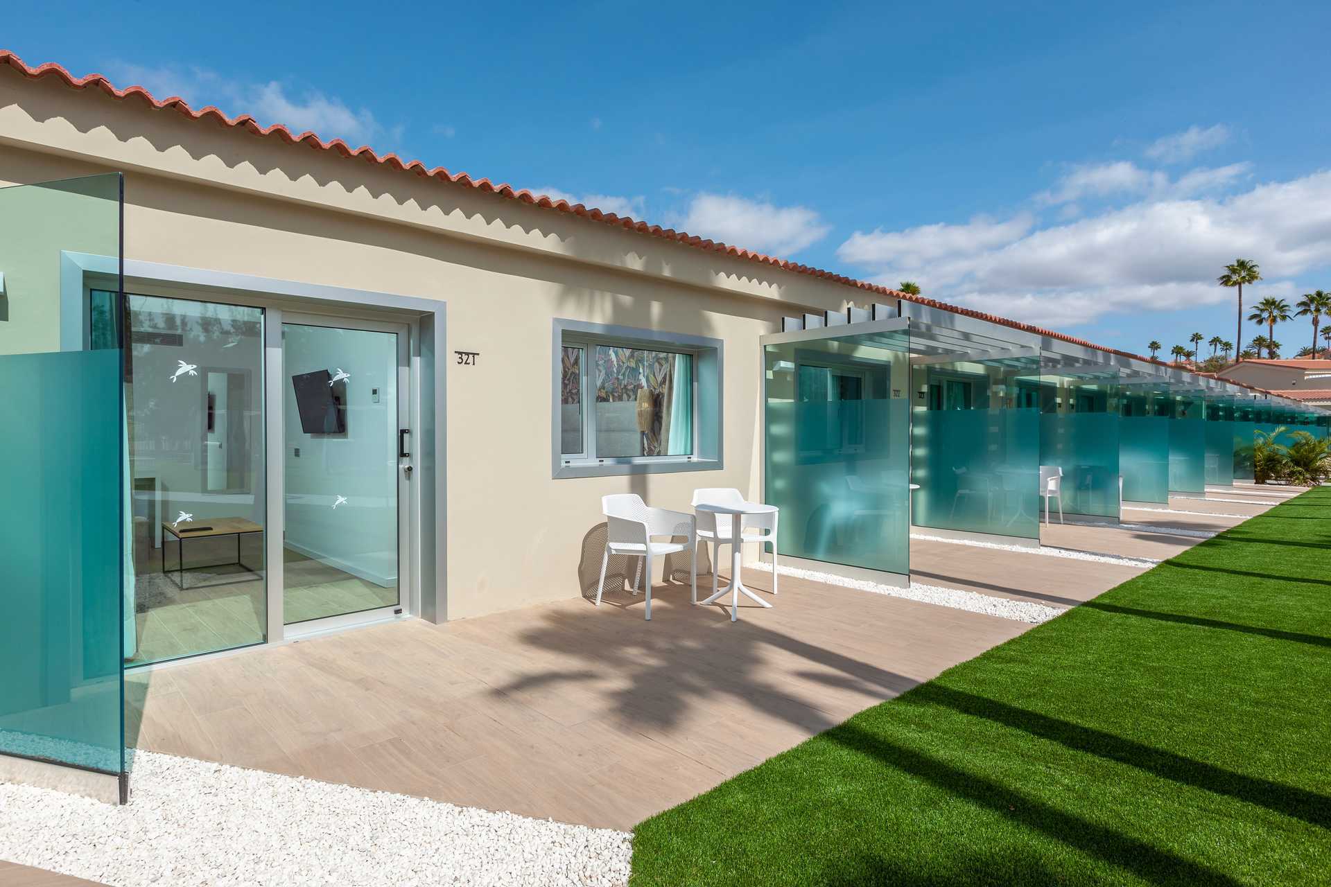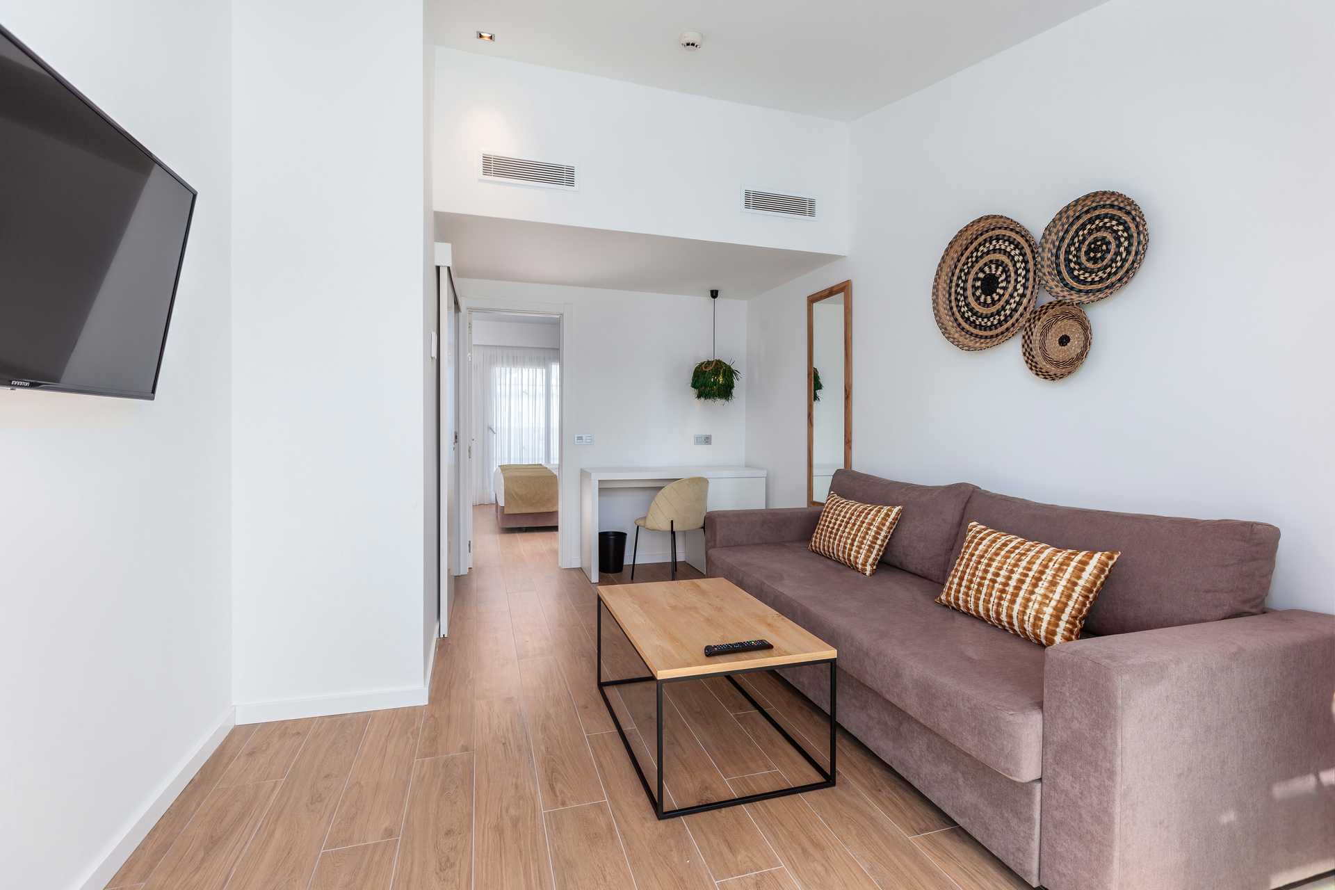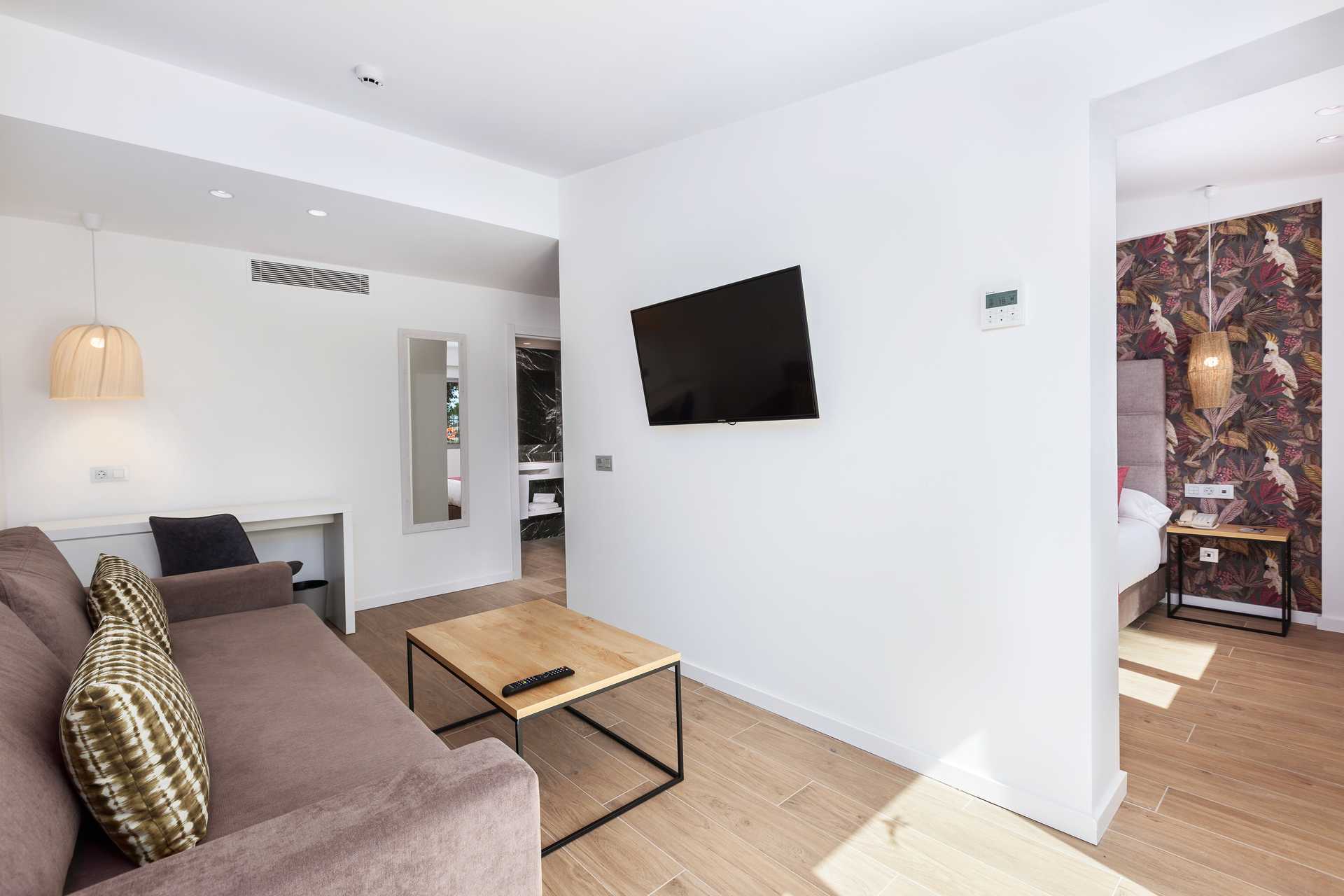 Suiter med stor terrasse med stole og bord og udsigt til poolen. Suiten består af et soveværelse og et opholdsrum. En dobbeltseng eller to enkeltsenge. Mulighed for ekstra opredning i sovesofa. Gratis wifi og aircondition. Deponering mod betaling. Minibar mod betaling. Nespresso kaffemaskine. Tv med internationale kanaler. Hårtørrer. Badeværelse med bruser og toilet. Rengøring 7 gange om ugen.