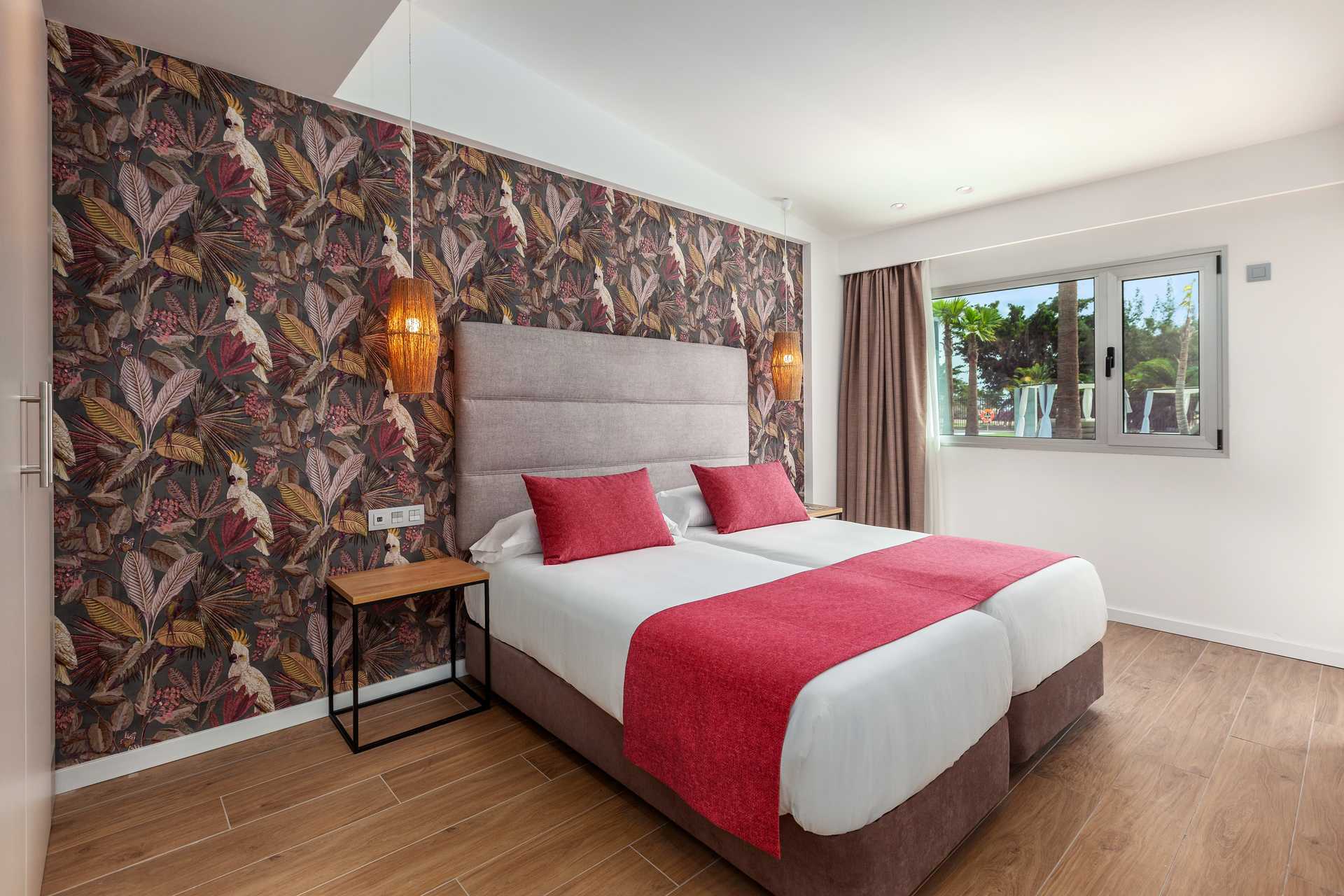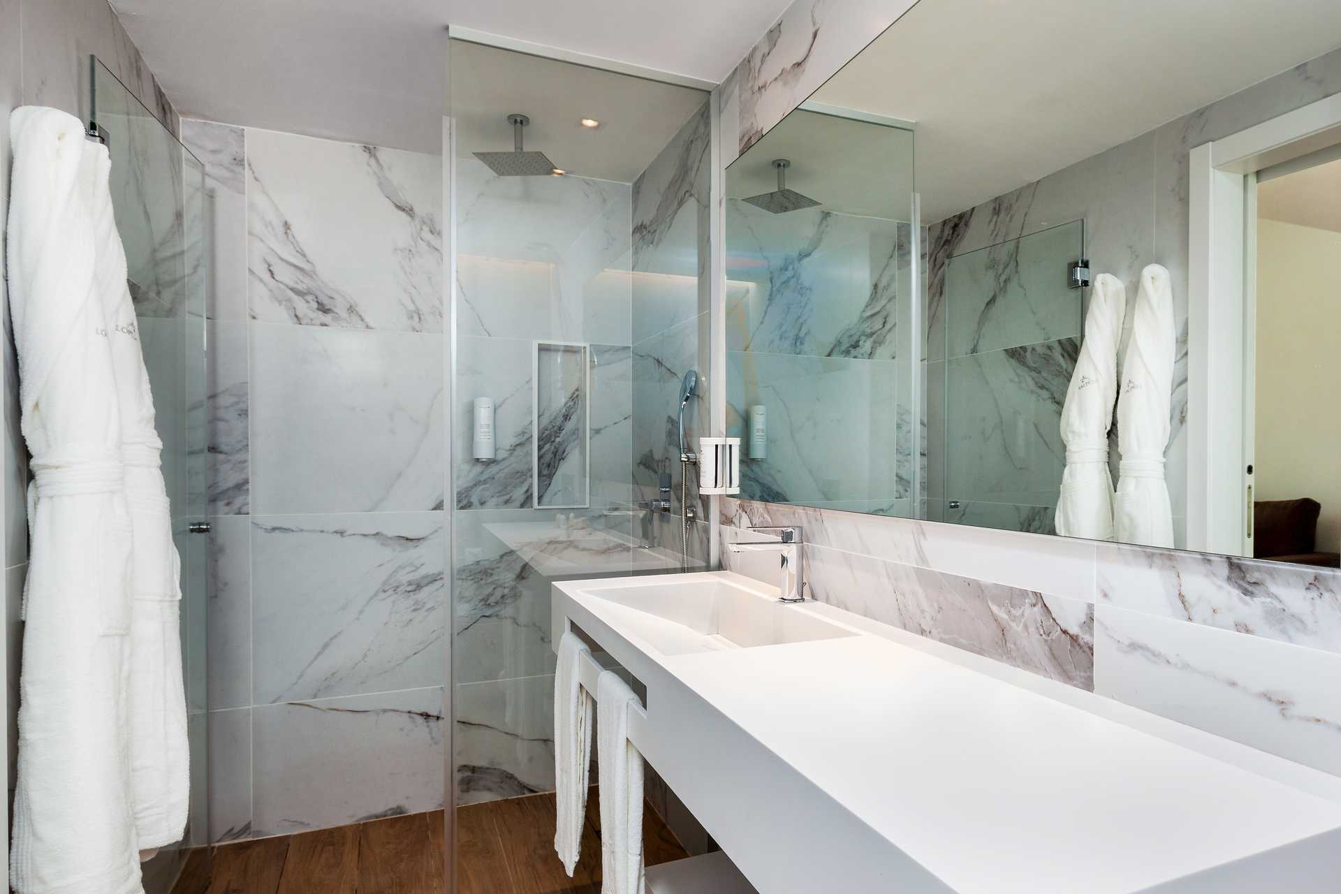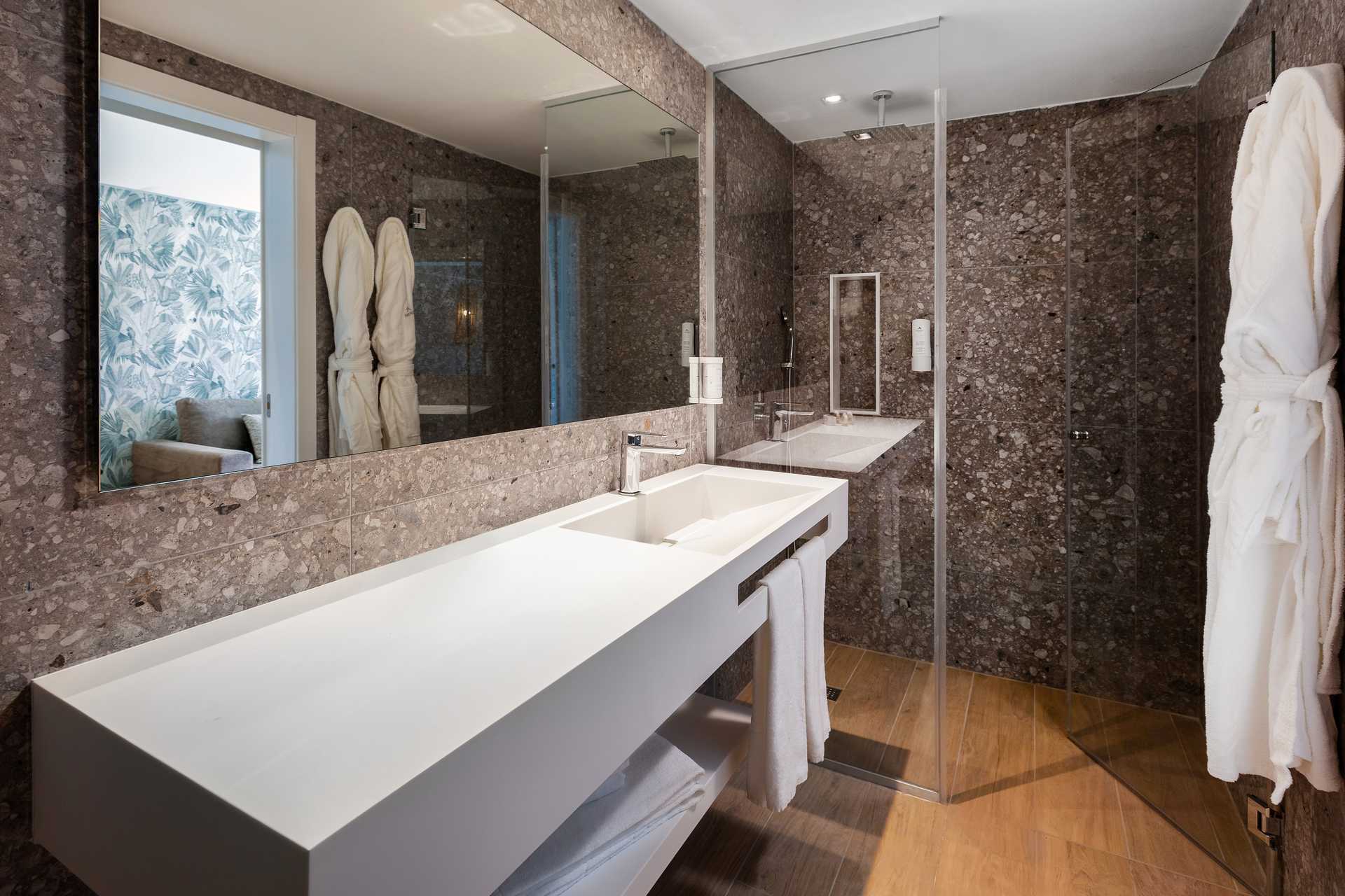 Junior-suiter med terrasse med stole og borde og udsigt til poolen. Dobbeltseng eller to enkeltsenge. Mulighed for en ekstra opredning i sovesofa. Gratis wifi og aircondition. Deponering mod betaling. Minibar mod betaling. Nespresso kaffemaskine. Tv med internationale kanaler. Hårtørrer. Badeværelse med bruser og toilet. Rengøring 7 gange om ugen.