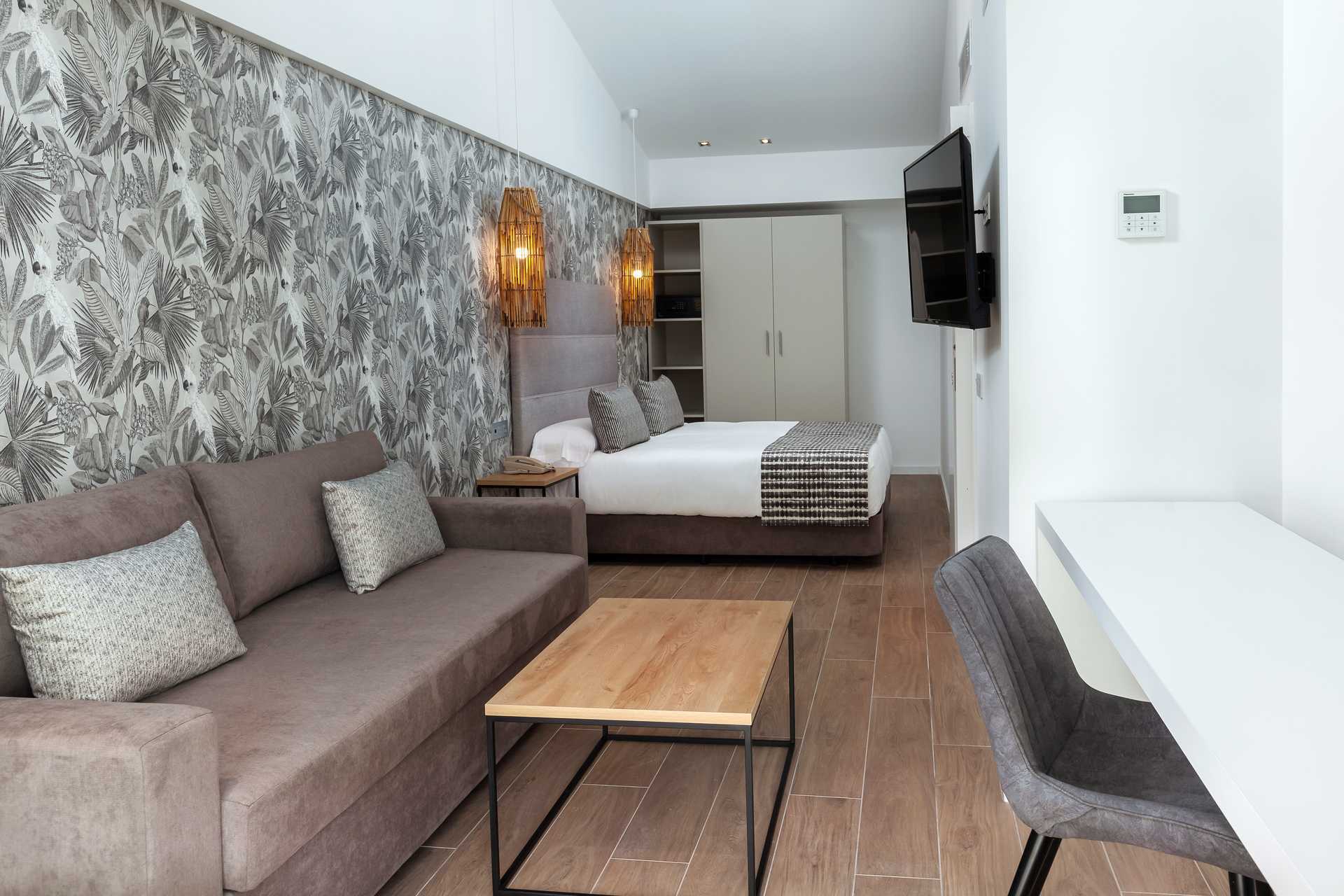 Junior-suiter deluxe med stor terrasse med stole og bord. En dobbeltseng eller to enkeltsenge. Mulighed for en ekstra opredning i sovesofa. Gratis wifi og aircondition. Deponering mod betaling. Minibar mod betaling. Nespresso kaffemaskine. Tv med internationale kanaler. Badekåber. Hårtørrer. Badeværelse med bruser og toilet. Rengøring 7 gange om ugen.