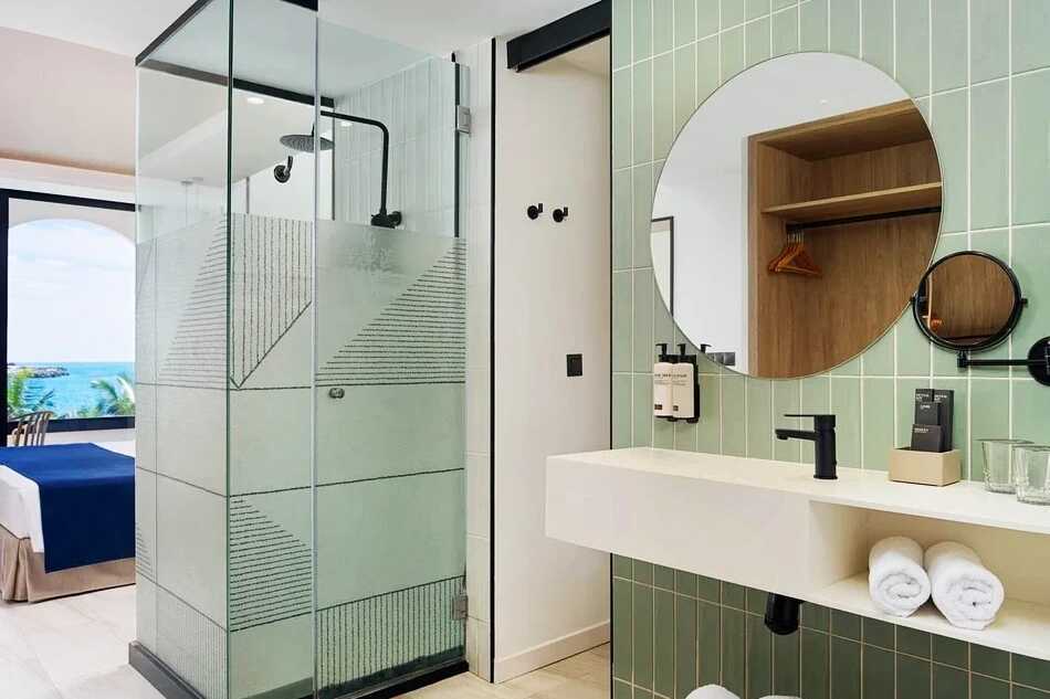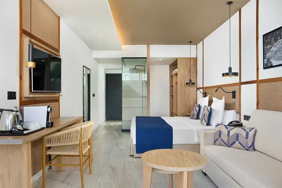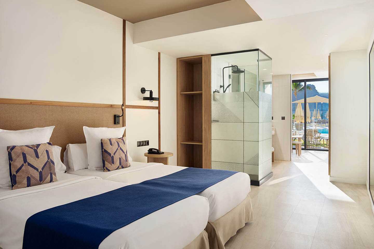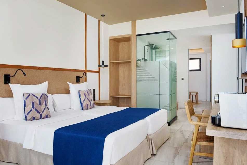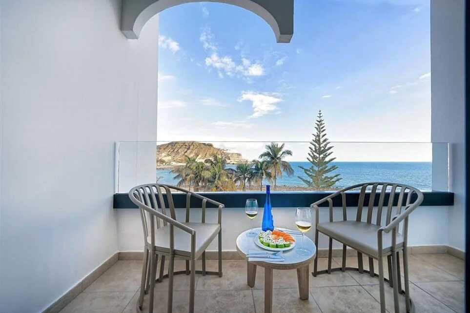 Junior-suite med balkon og havudsigt. To enkeltsenge. Gratis wifi, aircondition og deponering. Lille køleskab. Nespresso-maskine, kapsler mod betaling. El-kedel og kaffe/te. Tv med internationale kanaler. Hårtørrer. Badeværelse med bruser og toilet. Rengøring 7 gange om ugen.