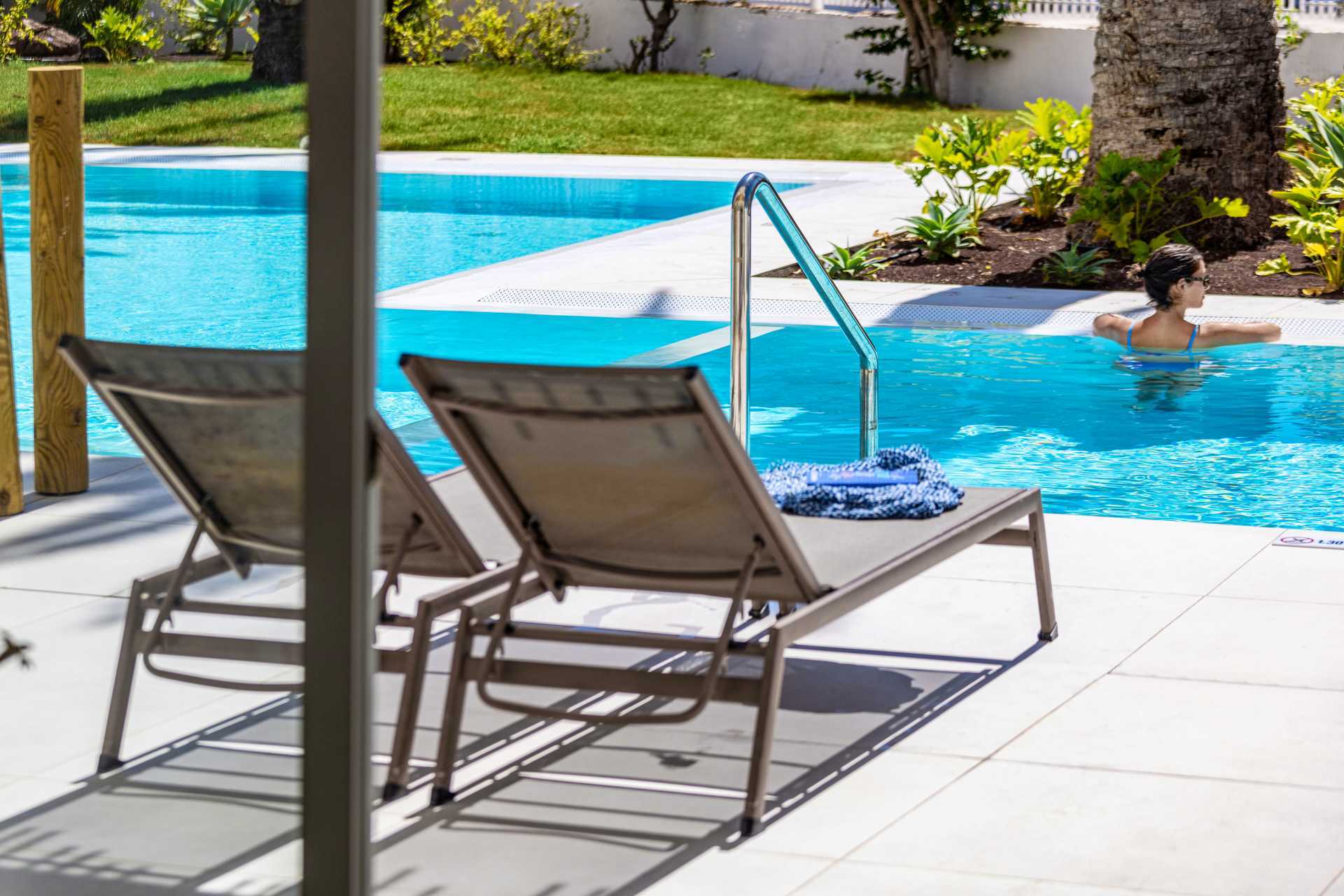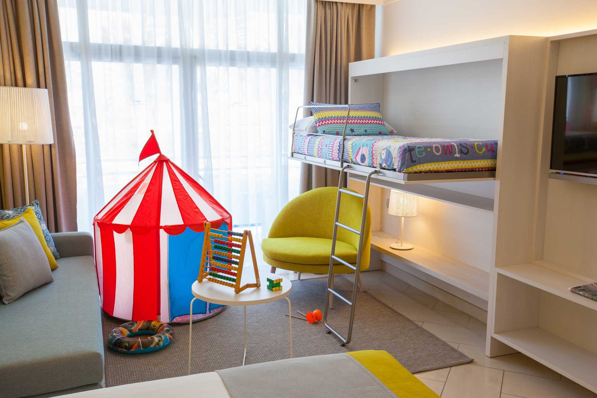 Familie-værelse med udendørs område og pool adgang direkte til børnepool. På udepladsen er der et bord og stole samt to solstole. To enkeltsenge. Mulighed for ekstra senge i sovesofa eller i køjeseng. Centralt styret aircondition er inkluderet om sommeren og om nødvendigt om vinteren. Gratis wifi. Deponering mod betaling. Minibar mod betaling. El-kedel og kaffe/te. En stor flaske vand er på værelset ved ankomsten. Tv med internationale kanaler. Hårtørrer. Badeværelse med bruser og toilet. Rengøring 7 gange om ugen. Børn under to år tæller med i det maksimale antal personer på værelset.