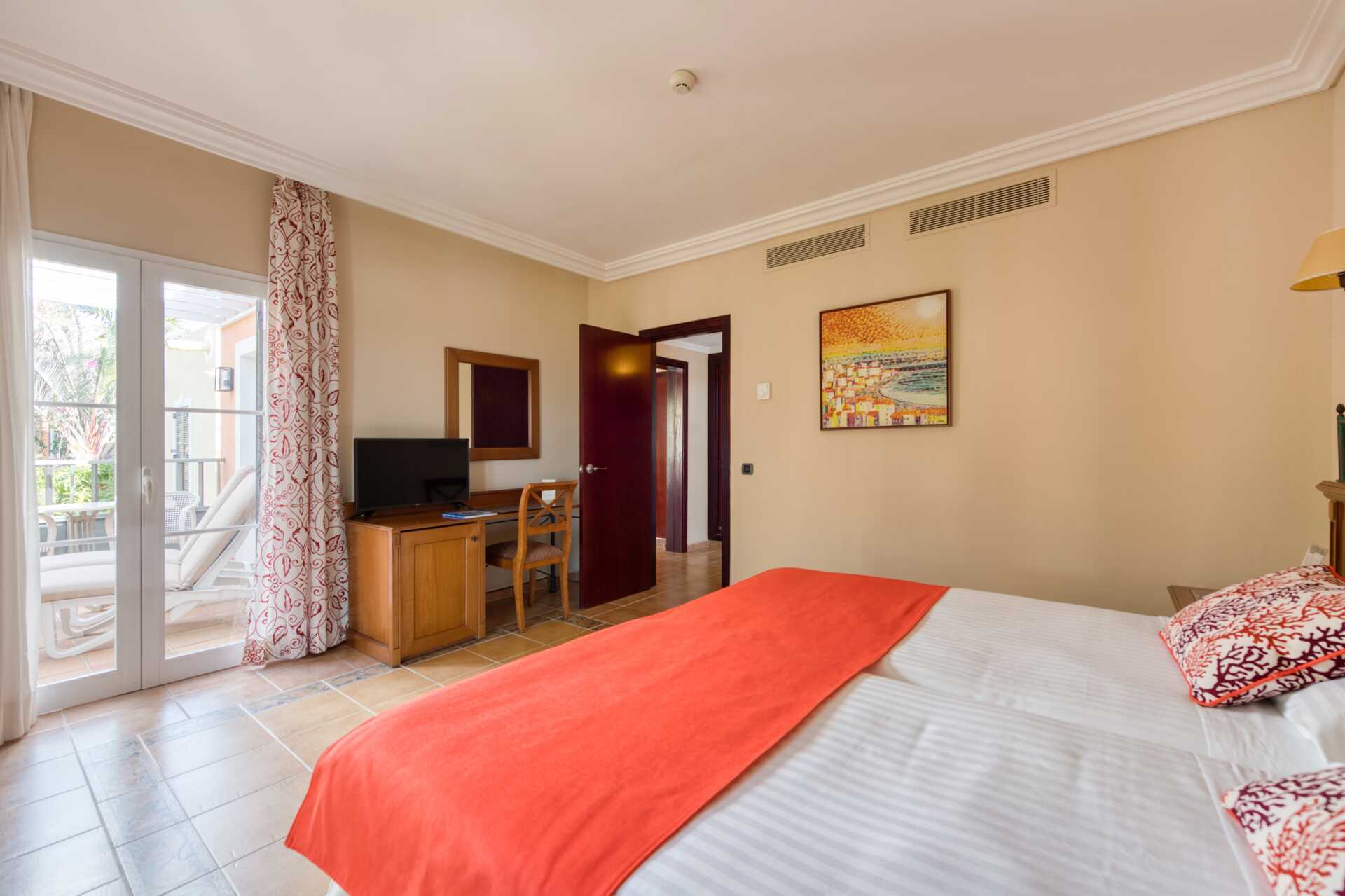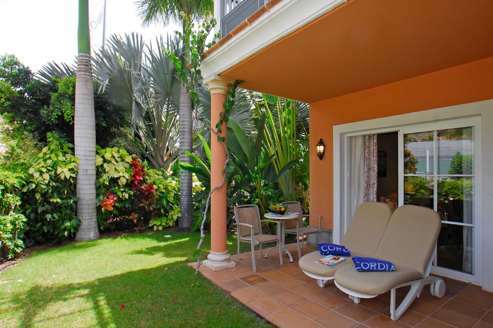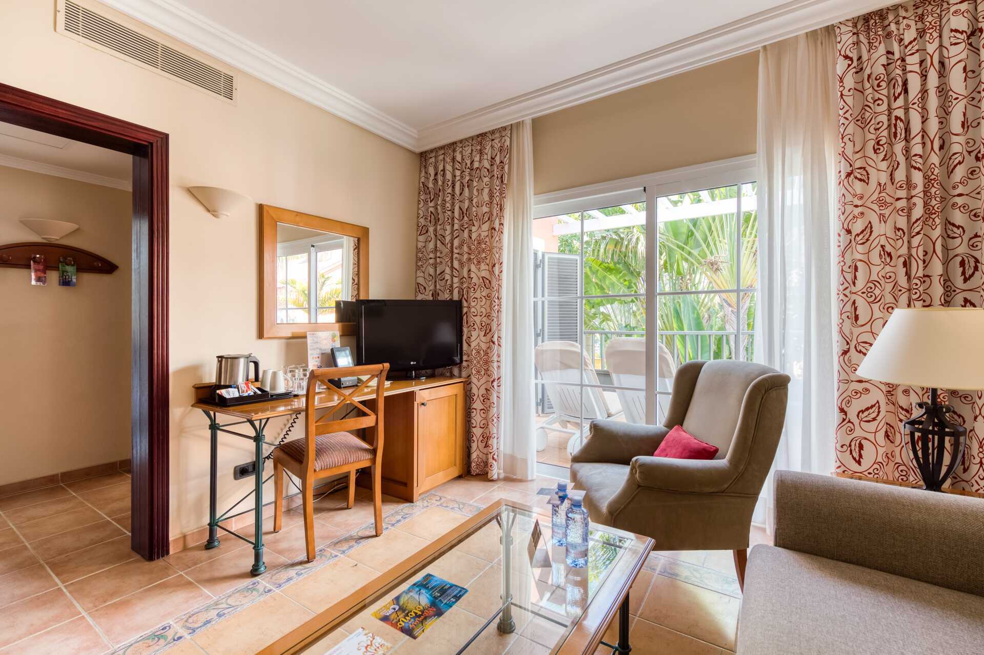 Junior-suiter med balkon eller terrasse. Udepladsen har solstole samt bord og stole. Junior-suiten består af et soveværelse og et opholdsrum. To enkeltsenge. Mulighed for en ekstra opredning i sovesofa. Gratis wifi og aircondition. Deponering mod betaling. Køleskab. Minibar mod betaling. El-kedel og kaffe/te. Tv med internationale kanaler. Hårtørrer. Badekåber. Badeværelse med badekar, separat bruser og toilet. Rengøring 7 gange om ugen.