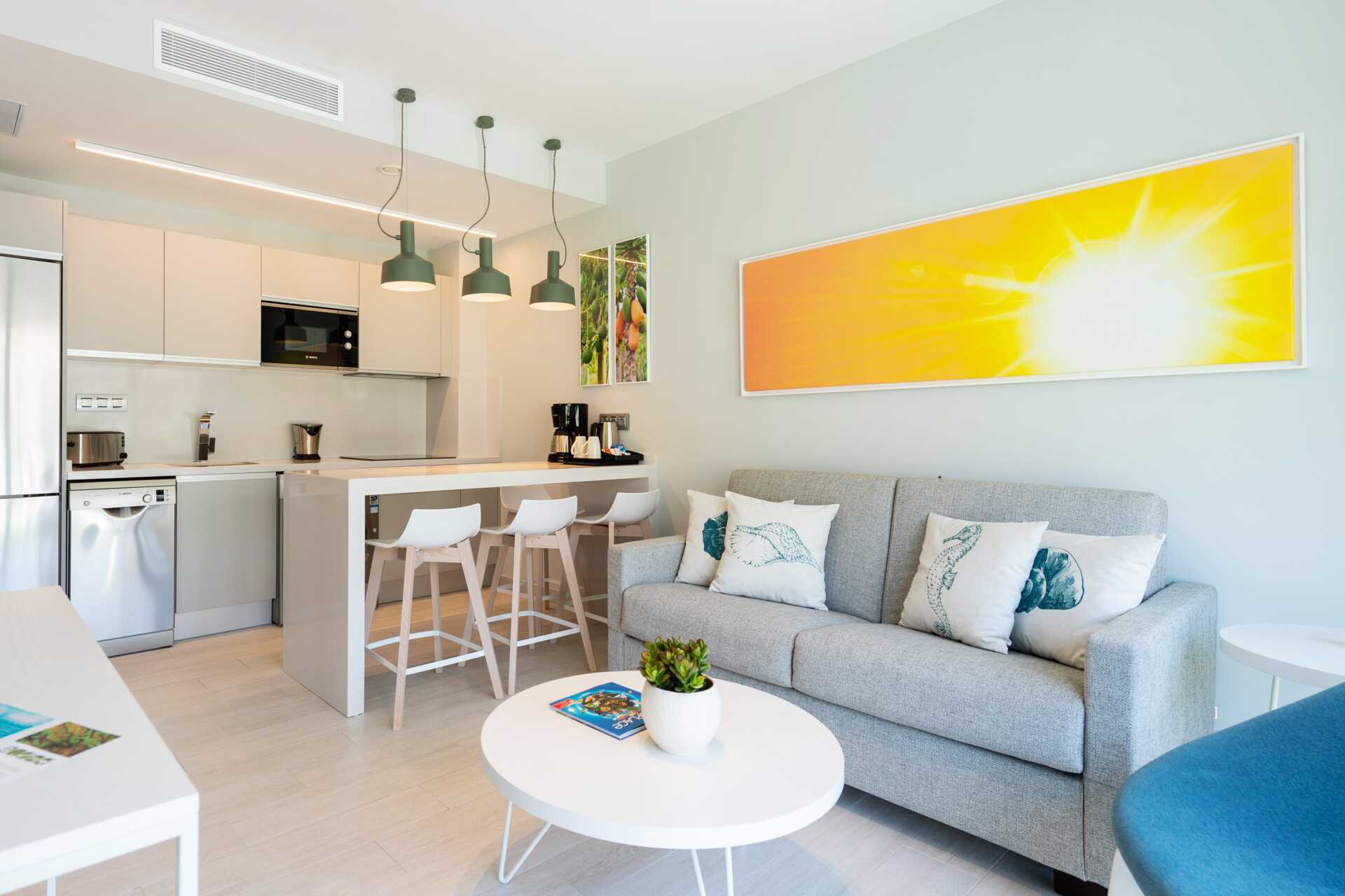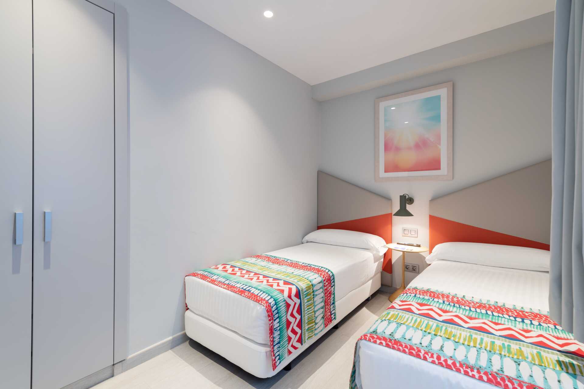 3-værelses lejlighed med stor terrasse på ca. 65 kvm bord og stole, jacuzzi, solstole og en bruser. To soveværelser og kombineret opholdsrum med minikøkken. To enkeltsenge. Mulighed for ekstra opredninger i sovesofa. Minikøkken med køleskab, kogeplader, kaffemaskine, el-kedel, brødrister og enkelt køkkenudstyr. Gratis wifi, aircondition og deponering. Tv med internationale kanaler. Strygejern og strygebræt. Vaskemaskine og tørretumbler Hårtørrer. Badeværelse med bruser og toilet. Rengøring 7 gange om ugen.