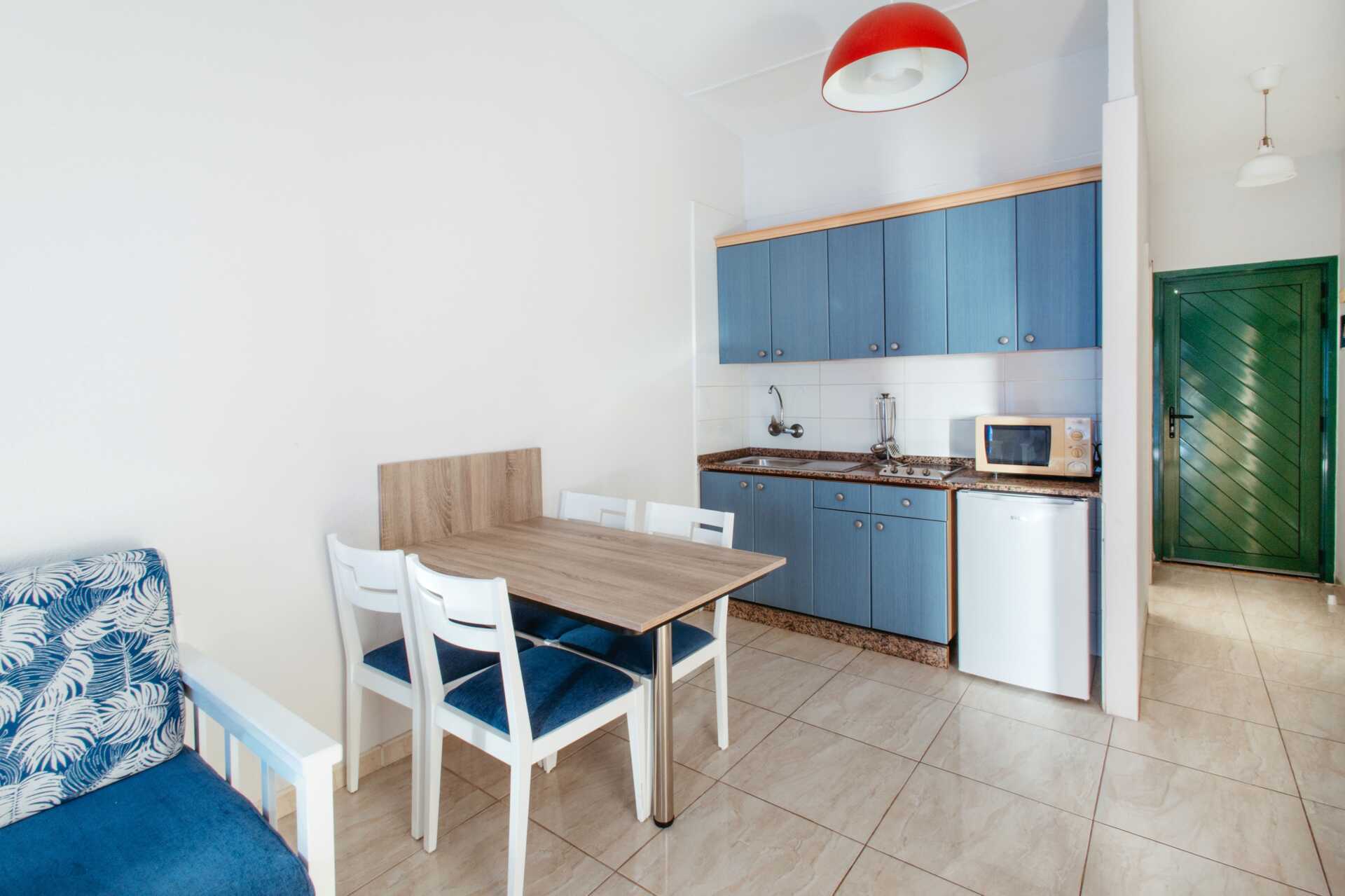 2-værelses lejligheder med balkon mod havet. Soveværelse og kombineret opholdsrum med minikøkken. To enkeltsenge. Mulighed for ekstra opredning i sovesofa. Minikøkken med kogeplader, el-kedel, brødrister, kaffemaskine, mikroovn, køleskab og enkelt køkkenudstyr. Wifi og deponering mod betaling. Bordventilator. Tv med internationale kanaler - fjernbetjening mod depositum. Badeværelse med bruser og toilet. Rengøring 5 gange om ugen. Børn under to år tæller med i det maksimale antal personer i lejligheden.